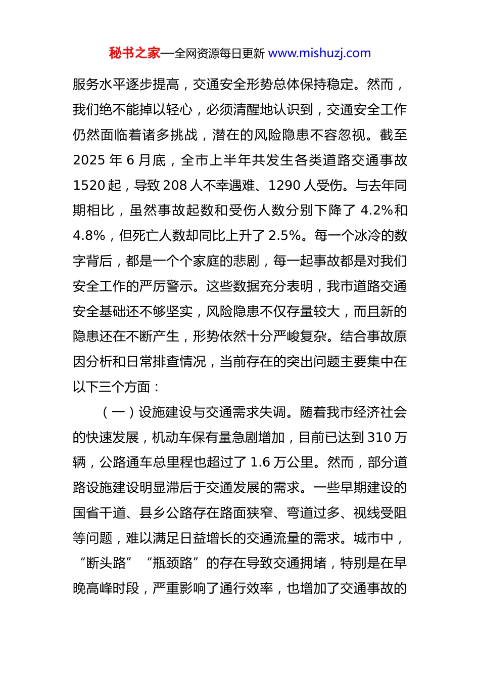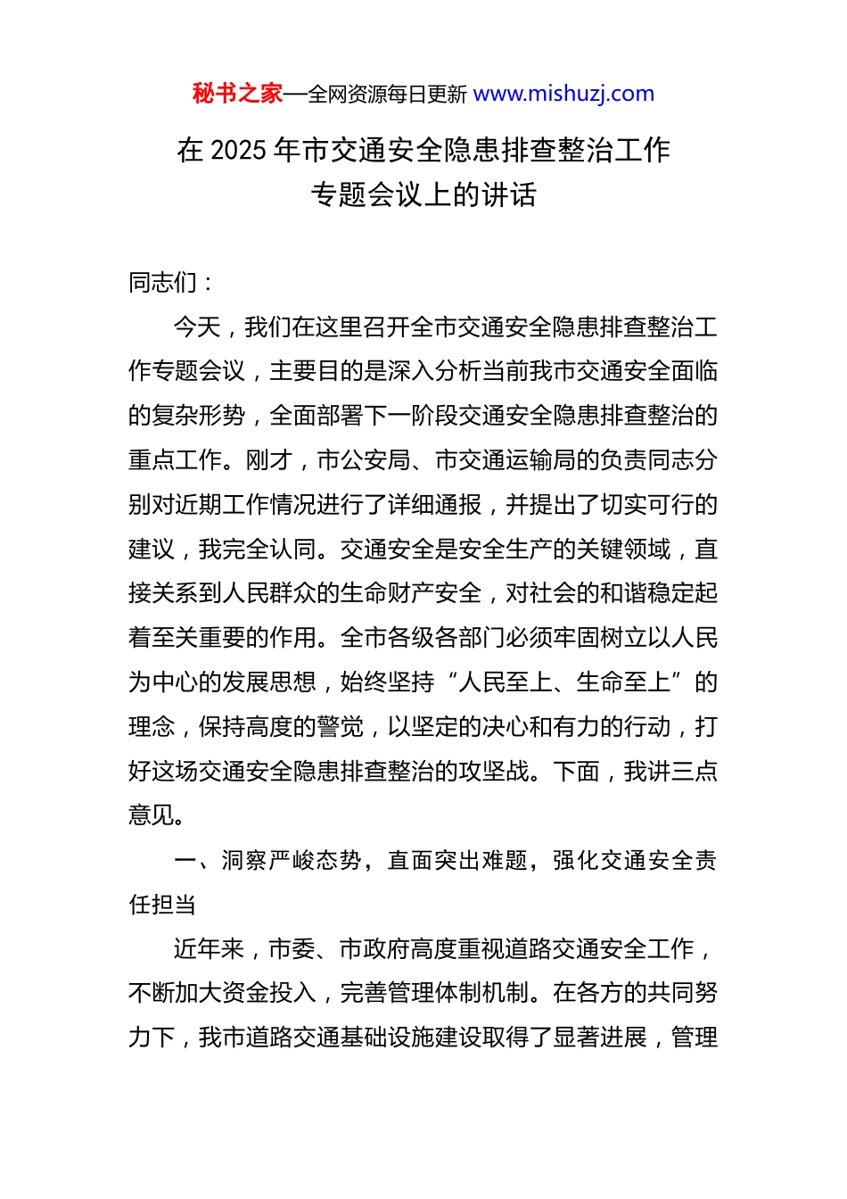 秘书之家—全网资源每日更新 www.mishuzj.com在 2025 年市交通安全隐患排查整治工作专题会议上的讲话 同志们:今天,我们在这里召开全市交通安全隐患排查整治工作专题会议,主要目的是深入分析当前我市交通安全面临的复杂形势,全面部署下一阶段交通安全隐患排查整治的重点工作。刚才,市公安局、市交通运输局的负责同志分别对近期工作情况进行了详细通报,并提出了切实可行的建议,我完全认同。交通安全是安全生产的关键领域,直接关系到人民群众的生命财产安全,对社会的和谐稳定起着至关重要的作用。全市各级各部门必须牢固树立以人民为中心的发展思想,始终坚持“人民至上、生命至上”的理念,保持高度的警觉,以坚定的决心和有力的行动,打好这场交通安全隐患排查整治的攻坚战。下面,我讲三点意见。一、洞察严峻态势,直面突出难题,强化交通安全责任担当近年来,市委、市政府高度重视道路交通安全工作,不断加大资金投入,完善管理体制机制。在各方的共同努力下,我市道路交通基础设施建设取得了显著进展,管理秘书之家—全网资源每日更新 www.mishuzj.com服务水平逐步提高,交通安全形势总体保持稳定。然而,我们绝不能掉以轻心,必须清醒地认识到,交通安全工作仍然面临着诸多挑战,潜在的风险隐患不容忽视。截至2025 年 6 月底,全市上半年共发生各类道路交通事故1520 起,导致 208 人不幸遇难、1290 人受伤。与去年同期相比,虽然事故起数和受伤人数分别下降了 4.2%和4.8%,但死亡人数却同比上升了 2.5%。每一个冰冷的数字背后,都是一个个家庭的悲剧,每一起事故都是对我们安全工作的严厉警示。这些数据充分表明,我市道路交通安全基础还不够坚实,风险隐患不仅存量较大,而且新的隐患还在不断产生,形势依然十分严峻复杂。结合事故原因分析和日常排查情况,当前存在的突出问题主要集中在以下三个方面:(一)设施建设与交通需求失调。随着我市经济社会的快速发展,机动车保有量急剧增加,目前已达到 310 万辆,公路通车总里程也超过了 1.6 万公里。然而,部分道路设施建设明显滞后于交通发展的需求。一些早期建设的国省干道、县乡公路存在路面狭窄、弯道过多、视线受阻等问题,难以满足日益增长的交通流量的需求。城市中,“断头路”“瓶颈路”的存在导致交通拥堵,特别是在早晚高峰时段,严重影响了通行效率,也增加了交通事故的秘书之家—全网资源每日更新 www.mishuzj.com发生风险。农村地区和城乡接合部的交通安全设施更是严重不足,警示标志缺失、减速带老化等问题普遍存在,夜间照明条件差,给行人和车辆的通行带来了极大的安全隐患。(二)交通参与者安全意识淡薄。部分交通参与者的交通安全意识和法治观念较为薄弱,违反交通规则的现象时有发生。一些机动车驾驶员存在超速、超载、疲劳驾驶、酒后驾驶等严重违法行为,这些行为不仅严重威胁自身安全,也对其他交通参与者的生命财产安全构成了巨大威胁。同时,部分非机动车驾驶员和行人不遵守交通信号灯、随意横穿马路等行为也屡见不鲜,增加了交通事故的发生概率。(三)监管执法存在薄弱环节。在交通安全监管执法方面,还存在一些不足之处。部分地区的交通管理部门警力不足,对道路交通违法行为的查处力度不够,存在漏管漏查的现象。一些执法人员的执法水平和业务能力有待提高,执法不规范、不严格的问题时有发生。此外,各部门之间的协调配合还不够紧密,信息共享不及时,导致在交通安全管理工作中存在一些漏洞和盲区。二、聚焦关键领域,细化整治举措,提升交通安全治理效能秘书之家—全网资源每日更新 www.mishuzj.com针对当前我市交通安全存在的突出问题,各级各部门要采取切实有效的措施,加大隐患排查整治力度,全面提升交通安全治理水平。(一)加强基础设施建设与改造。要加大对道路交通基础设施建设的投入,科学规划道路布局,加快打通“断头路”“瓶颈路”,优化交通组织,提高道路通行能力。对早期建设的国省干道、县乡公路进行升级改造,拓宽路面、改善弯道设计、增加视距,提高道路的安全性。加强农村地区和城乡接合部的交通安全设施建设,完善警示标志、减速带等设施,改善...