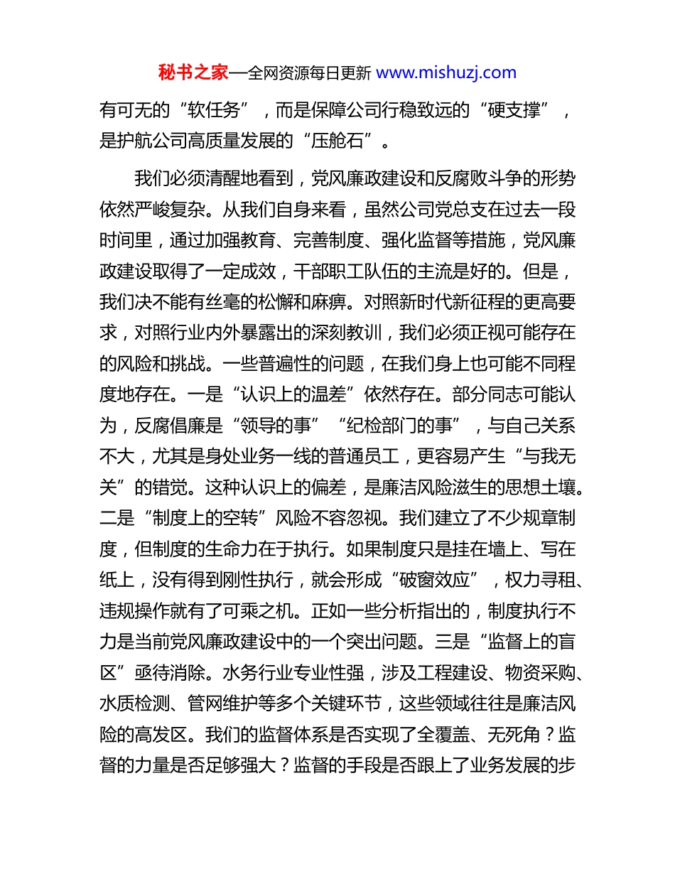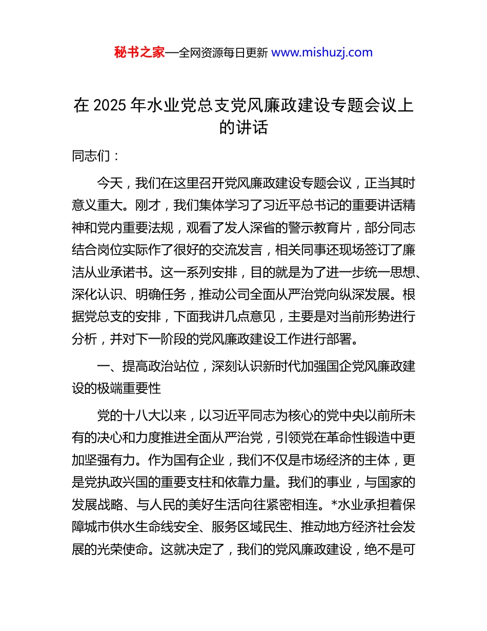 秘书之家—全网资源每日更新 www.mishuzj.com在 2025 年水业党总支党风廉政建设专题会议上的讲话同志们:今天,我们在这里召开党风廉政建设专题会议,正当其时意义重大。刚才,我们集体学习了习近平总书记的重要讲话精神和党内重要法规,观看了发人深省的警示教育片,部分同志结合岗位实际作了很好的交流发言,相关同事还现场签订了廉洁从业承诺书。这一系列安排,目的就是为了进一步统一思想、深化认识、明确任务,推动公司全面从严治党向纵深发展。根据党总支的安排,下面我讲几点意见,主要是对当前形势进行分析,并对下一阶段的党风廉政建设工作进行部署。一、提高政治站位,深刻认识新时代加强国企党风廉政建设的极端重要性党的十八大以来,以习近平同志为核心的党中央以前所未有的决心和力度推进全面从严治党,引领党在革命性锻造中更加坚强有力。作为国有企业,我们不仅是市场经济的主体,更是党执政兴国的重要支柱和依靠力量。我们的事业,与国家的发展战略、与人民的美好生活向往紧密相连。*水业承担着保障城市供水生命线安全、服务区域民生、推动地方经济社会发展的光荣使命。这就决定了,我们的党风廉政建设,绝不是可秘书之家—全网资源每日更新 www.mishuzj.com有可无的“软任务”,而是保障公司行稳致远的“硬支撑”,是护航公司高质量发展的“压舱石”。我们必须清醒地看到,党风廉政建设和反腐败斗争的形势依然严峻复杂。从我们自身来看,虽然公司党总支在过去一段时间里,通过加强教育、完善制度、强化监督等措施,党风廉政建设取得了一定成效,干部职工队伍的主流是好的。但是,我们决不能有丝毫的松懈和麻痹。对照新时代新征程的更高要求,对照行业内外暴露出的深刻教训,我们必须正视可能存在的风险和挑战。一些普遍性的问题,在我们身上也可能不同程度地存在。一是“认识上的温差”依然存在。部分同志可能认为,反腐倡廉是“领导的事”“纪检部门的事”,与自己关系不大,尤其是身处业务一线的普通员工,更容易产生“与我无关”的错觉。这种认识上的偏差,是廉洁风险滋生的思想土壤。二是“制度上的空转”风险不容忽视。我们建立了不少规章制度,但制度的生命力在于执行。如果制度只是挂在墙上、写在纸上,没有得到刚性执行,就会形成“破窗效应”,权力寻租、违规操作就有了可乘之机。正如一些分析指出的,制度执行不力是当前党风廉政建设中的一个突出问题。三是“监督上的盲区”亟待消除。水务行业专业性强,涉及工程建设、物资采购、水质检测、管网维护等多个关键环节,这些领域往往是廉洁风险的高发区。我们的监督体系是否实现了全覆盖、无死角?监督的力量是否足够强大?监督的手段是否跟上了业务发展的步秘书之家—全网资源每日更新 www.mishuzj.com伐?这些都是我们需要深刻反思的课题。四是“作风上的惯性”必须破除。警示教育片《“吃心”不改,纠风不停》揭示的,不仅是贪腐问题,更是作风问题。“四风”问题具有顽固性和反复性,形式主义、官僚主义的新变种依然存在。我们必须警惕“不作为、慢作为、乱作为”的现象在公司内部抬头,坚决防止作风问题演变为腐败问题。因此,公司全体党员干部和关键岗位人员,必须站在“两个维护”的政治高度,深刻认识到,抓好党风廉政建设,就是抓发展、就是保安全、就是护民生,就是我们作为国企员工必须扛起的政治责任。二、聚焦关键环节,以钉钉子精神抓好下一阶段重点工作刚才,*总经理在总结讲话中提出了“五个要”的总体要求,非常精准,指导性很强。为确保这些要求落到实处,我在这里就下一阶段的具体工作,进行再强调、再部署。(一)以政治建设为统领,筑牢信仰之基。要把党的政治建设摆在首位,持续深入学习贯彻习近平新时代中国特色社会主义思想,特别是总书记关于国企改革发展和党的建设的重要论述。我们要确保党中央的决策部署在水业不折不扣地得到贯彻执行。要牢记,我们的供水业务,本质上是政治工作、民生工作。每一滴符合标准的水,每一次及时的管网抢修,都是在践行党的初心使命。要通过强化政治理论学习,引导全体党员干部深刻领悟“两个确立”的决定性意义,增强“四个意识”、秘书之家...