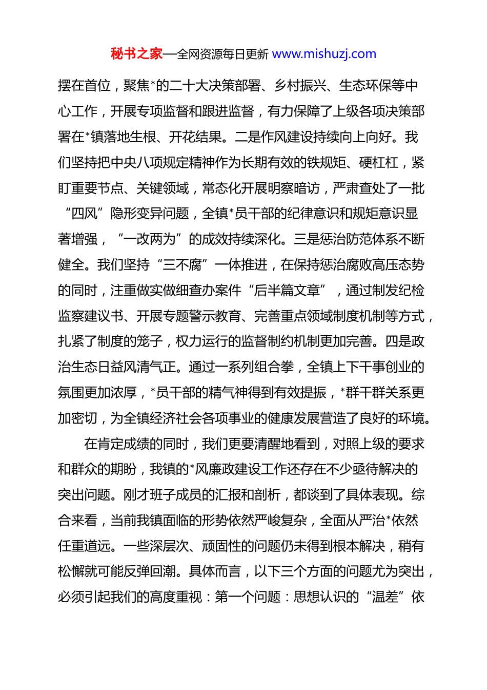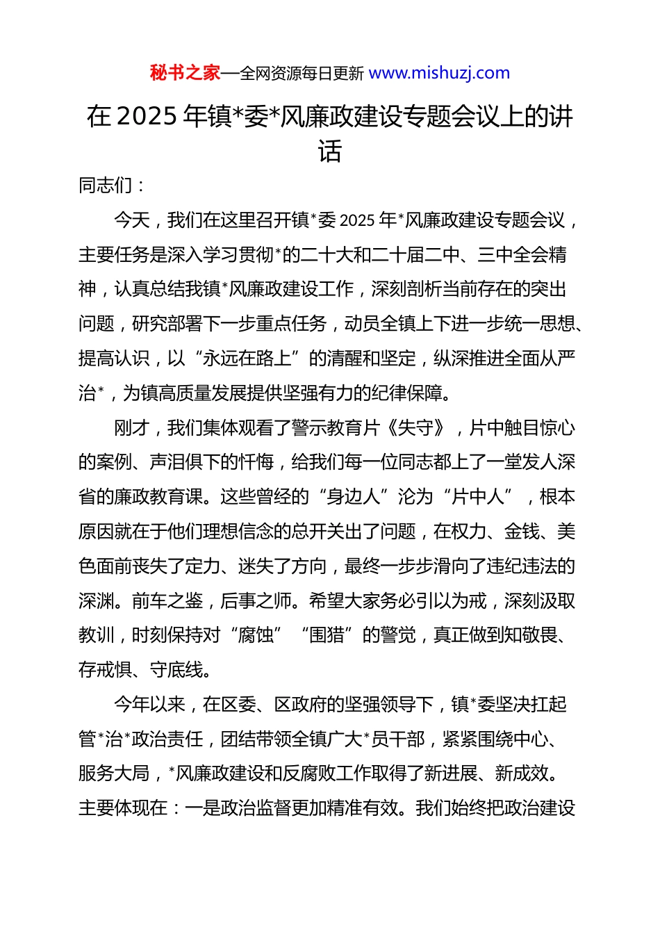 秘书之家—全网资源每日更新 www.mishuzj.com在 2025 年镇*委*风廉政建设专题会议上的讲话同志们:今天,我们在这里召开镇*委 2025 年*风廉政建设专题会议,主要任务是深入学习贯彻*的二十大和二十届二中、三中全会精神,认真总结我镇*风廉政建设工作,深刻剖析当前存在的突出问题,研究部署下一步重点任务,动员全镇上下进一步统一思想、提高认识,以“永远在路上”的清醒和坚定,纵深推进全面从严治*,为镇高质量发展提供坚强有力的纪律保障。刚才,我们集体观看了警示教育片《失守》,片中触目惊心的案例、声泪俱下的忏悔,给我们每一位同志都上了一堂发人深省的廉政教育课。这些曾经的“身边人”沦为“片中人”,根本原因就在于他们理想信念的总开关出了问题,在权力、金钱、美色面前丧失了定力、迷失了方向,最终一步步滑向了违纪违法的深渊。前车之鉴,后事之师。希望大家务必引以为戒,深刻汲取教训,时刻保持对“腐蚀”“围猎”的警觉,真正做到知敬畏、存戒惧、守底线。今年以来,在区委、区政府的坚强领导下,镇*委坚决扛起管*治*政治责任,团结带领全镇广大*员干部,紧紧围绕中心、服务大局,*风廉政建设和反腐败工作取得了新进展、新成效。主要体现在:一是政治监督更加精准有效。我们始终把政治建设秘书之家—全网资源每日更新 www.mishuzj.com摆在首位,聚焦*的二十大决策部署、乡村振兴、生态环保等中心工作,开展专项监督和跟进监督,有力保障了上级各项决策部署在*镇落地生根、开花结果。二是作风建设持续向上向好。我们坚持把中央八项规定精神作为长期有效的铁规矩、硬杠杠,紧盯重要节点、关键领域,常态化开展明察暗访,严肃查处了一批“四风”隐形变异问题,全镇*员干部的纪律意识和规矩意识显著增强,“一改两为”的成效持续深化。三是惩治防范体系不断健全。我们坚持“三不腐”一体推进,在保持惩治腐败高压态势的同时,注重做实做细查办案件“后半篇文章”,通过制发纪检监察建议书、开展专题警示教育、完善重点领域制度机制等方式,扎紧了制度的笼子,权力运行的监督制约机制更加完善。四是政治生态日益风清气正。通过一系列组合拳,全镇上下干事创业的氛围更加浓厚,*员干部的精气神得到有效提振,*群干群关系更加密切,为全镇经济社会各项事业的健康发展营造了良好的环境。在肯定成绩的同时,我们更要清醒地看到,对照上级的要求和群众的期盼,我镇的*风廉政建设工作还存在不少亟待解决的突出问题。刚才班子成员的汇报和剖析,都谈到了具体表现。综合来看,当前我镇面临的形势依然严峻复杂,全面从严治*依然任重道远。一些深层次、顽固性的问题仍未得到根本解决,稍有松懈就可能反弹回潮。具体而言,以下三个方面的问题尤为突出,必须引起我们的高度重视:第一个问题:思想认识的“温差”依秘书之家—全网资源每日更新 www.mishuzj.com然存在,政治站位有待进一步提升。少数*员干部对*风廉政建设的长期性、复杂性、艰巨性认识不足,存在“差不多、过得去、歇歇脚”的松懈思想。有的认为反腐败抓了这么多年,高压态势已经形成,可以“刀枪入库、马放南山”了,对一些苗头性、倾向性问题警惕性不高、制止不力。有的对全面从严治*的内涵理解不深不透,认为这主要是纪委的事情,与自己关系不大,没有真正把自己摆进去、把职责摆进去、把工作摆进去,存在“说起来重要、做起来次要、忙起来不要”的现象。更有甚者,对当前反腐败斗争的压倒性胜利态势认识不清,心存侥幸,认为只要自己手法高明、做事隐蔽,就不会被发现。这种思想上的“温差”和认识上的“偏差”,是滋生腐败和作风问题的温床,是我们推进全面从严治*向纵深发展的最大思想障碍。如果不及时纠正,必然会导致行动上的“落差”。第二个问题:责任传导的“梗阻”依然存在,“一岗双责”有待进一步压实。管*治*责任落实“上热中温下冷”的现象在我镇部分单位和领域依然存在。有的领导干部履行“一岗双责”意识不强,习惯于当“甩手掌柜”,对分管领域的*风廉政建设工作,满足于开会讲一讲、文件转一转,缺乏深入的研究谋划和有力的督促检查。对分管部门干部的日常教育管理监督“失之于宽、...