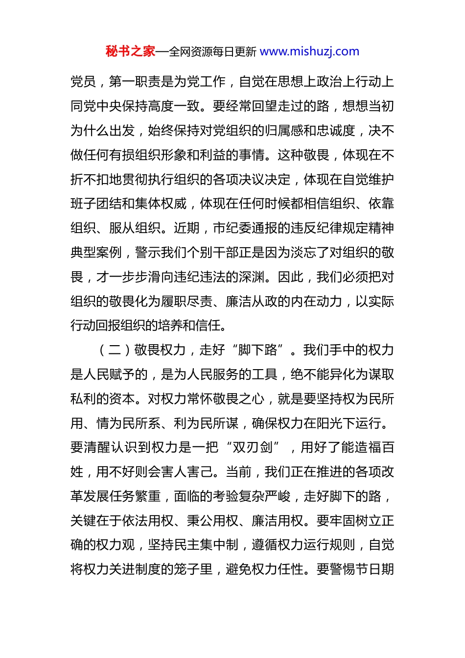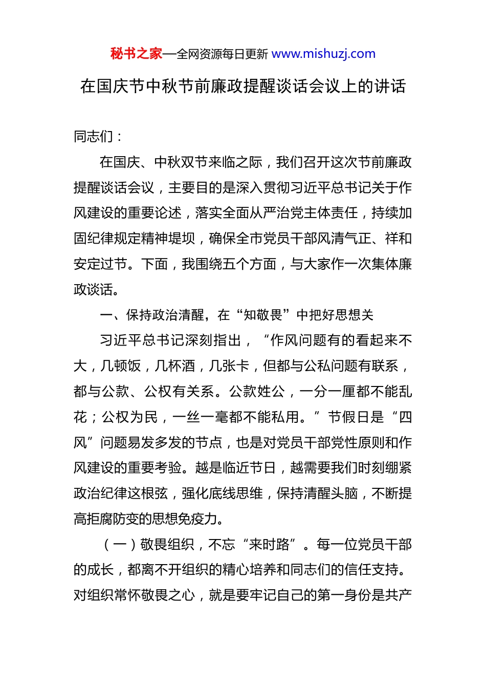 秘书之家—全网资源每日更新 www.mishuzj.com在国庆节中秋节前廉政提醒谈话会议上的讲话 同志们:在国庆、中秋双节来临之际,我们召开这次节前廉政提醒谈话会议,主要目的是深入贯彻习近平总书记关于作风建设的重要论述,落实全面从严治党主体责任,持续加固纪律规定精神堤坝,确保全市党员干部风清气正、祥和安定过节。下面,我围绕五个方面,与大家作一次集体廉政谈话。一、保持政治清醒,在“知敬畏”中把好思想关习近平总书记深刻指出,“作风问题有的看起来不大,几顿饭,几杯酒,几张卡,但都与公私问题有联系,都与公款、公权有关系。公款姓公,一分一厘都不能乱花;公权为民,一丝一毫都不能私用。”节假日是“四风”问题易发多发的节点,也是对党员干部党性原则和作风建设的重要考验。越是临近节日,越需要我们时刻绷紧政治纪律这根弦,强化底线思维,保持清醒头脑,不断提高拒腐防变的思想免疫力。(一)敬畏组织,不忘“来时路”。每一位党员干部的成长,都离不开组织的精心培养和同志们的信任支持。对组织常怀敬畏之心,就是要牢记自己的第一身份是共产秘书之家—全网资源每日更新 www.mishuzj.com党员,第一职责是为党工作,自觉在思想上政治上行动上同党中央保持高度一致。要经常回望走过的路,想想当初为什么出发,始终保持对党组织的归属感和忠诚度,决不做任何有损组织形象和利益的事情。这种敬畏,体现在不折不扣地贯彻执行组织的各项决议决定,体现在自觉维护班子团结和集体权威,体现在任何时候都相信组织、依靠组织、服从组织。近期,市纪委通报的违反纪律规定精神典型案例,警示我们个别干部正是因为淡忘了对组织的敬畏,才一步步滑向违纪违法的深渊。因此,我们必须把对组织的敬畏化为履职尽责、廉洁从政的内在动力,以实际行动回报组织的培养和信任。(二)敬畏权力,走好“脚下路”。我们手中的权力是人民赋予的,是为人民服务的工具,绝不能异化为谋取私利的资本。对权力常怀敬畏之心,就是要坚持权为民所用、情为民所系、利为民所谋,确保权力在阳光下运行。要清醒认识到权力是一把“双刃剑”,用好了能造福百姓,用不好则会害人害己。当前,我们正在推进的各项改革发展任务繁重,面临的考验复杂严峻,走好脚下的路,关键在于依法用权、秉公用权、廉洁用权。要牢固树立正确的权力观,坚持民主集中制,遵循权力运行规则,自觉将权力关进制度的笼子里,避免权力任性。要警惕节日期秘书之家—全网资源每日更新 www.mishuzj.com间可能出现的以权谋私、利益输送等风险,坚决抵制利用职权影响接受宴请、收受礼品礼金等行为,真正做到“公权为民,一丝一毫都不能私用”。(三)敬畏法纪,守住“警戒线”。党纪国法是党员干部必须遵守的行为准则,是不可触碰的“高压线”。对法纪常怀敬畏之心,就是要带头学习党章党规党纪,带头尊法学法守法用法,时刻用纪律的尺子衡量自己的言行。要深刻认识到“祸患常积于忽微,而智勇多困于所溺”,许多违纪违法行为往往都是从看似不起眼的“小事小节”开始,如“一顿便饭”、“一条香烟”、“一盒月饼”等,逐步放松要求,最终突破纪律底线。全市各级党组织要结合党纪学习教育,引导广大党员干部学纪、知纪、明纪、守纪,搞清楚党的纪律规矩是什么,弄明白能干什么、不能干什么,把遵规守纪刻印在心,内化为言行准则。要坚决摒弃“侥幸心理”和“特权思想”,始终做到心有所畏、言有所戒、行有所止,牢牢守住法纪“警戒线”。二、强化责任担当,在“严落实”中把好履职关习近平总书记强调,“这么抓下去,总会见效的”,并指出要抓住中秋、国庆、新年、春节等节点,持续纠正“四风”。这要求我们不仅自身要廉洁过硬,更要扛起管秘书之家—全网资源每日更新 www.mishuzj.com党治党的政治责任,将严的主基调长期坚持下去,确保作风建设各项要求落到实处。(一)履行主体责任,种好“责任田”。各级党委(党组)要切实担负起全面从严治党主体责任,把抓好节日期间作风建设作为一项重要政治任务来抓。主要领导要履行好“第一责任人”职责,对双节期间纠“四风”树新风工作扎实安排,对下属单位负责人及时开展提醒谈话,切...