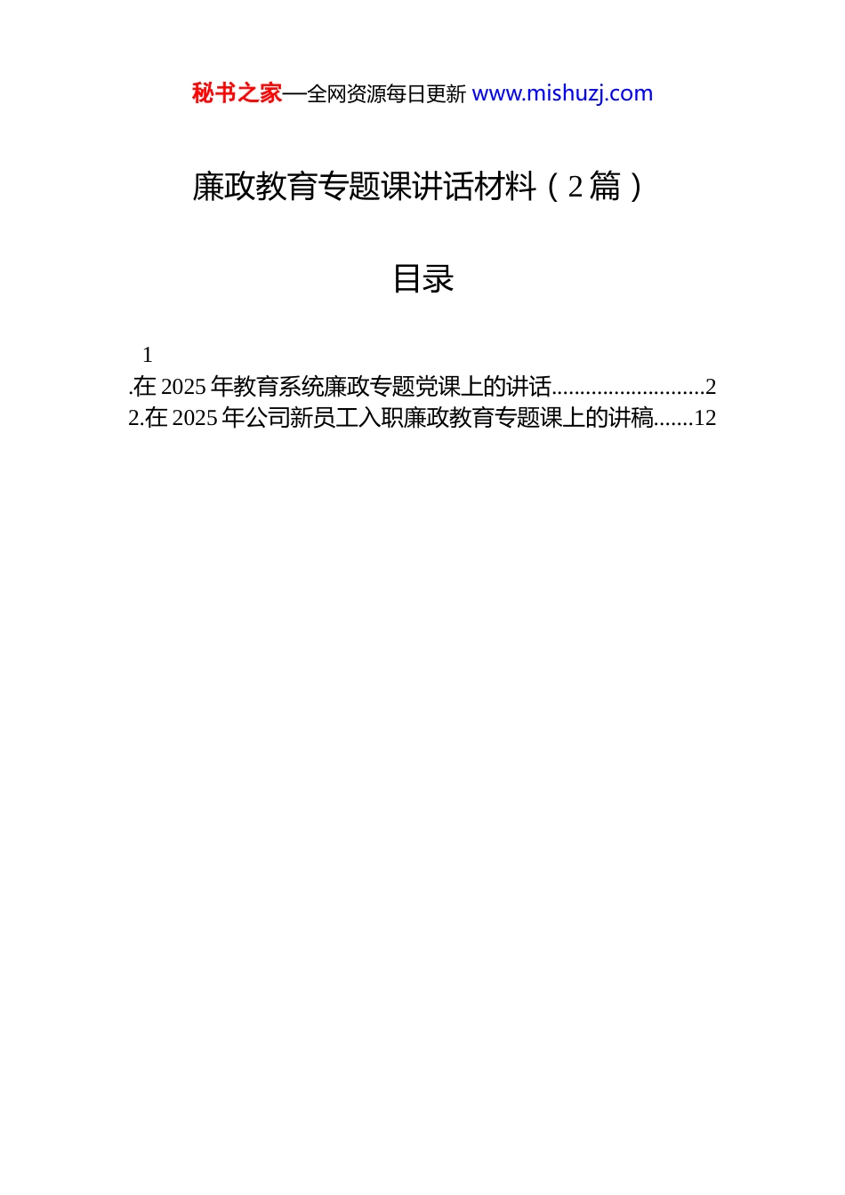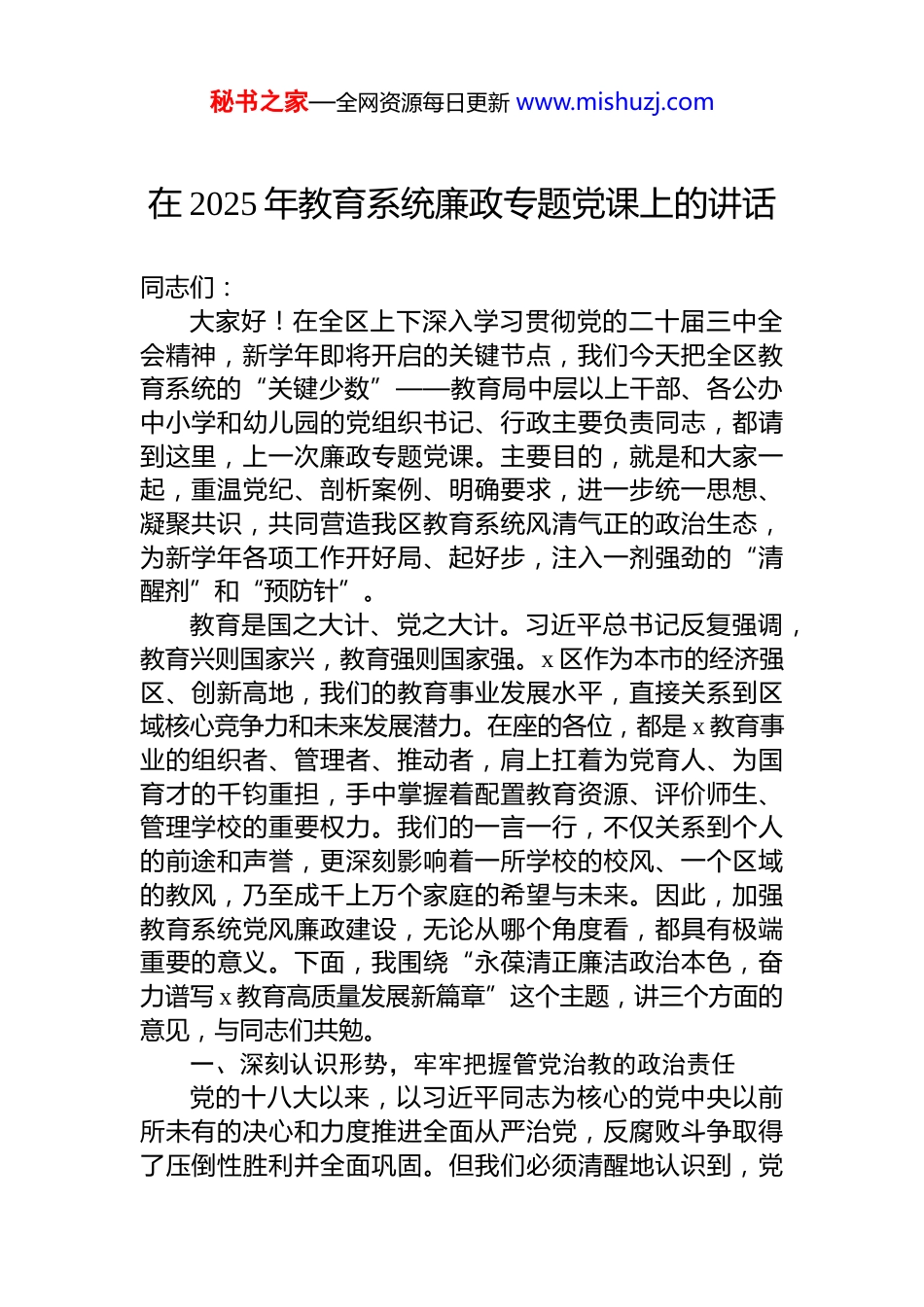 秘书之家—全网资源每日更新 www.mishuzj.com廉政教育专题课讲话材料(2 篇)目录1.在 2025 年教育系统廉政专题党课上的讲话...........................22.在 2025 年公司新员工入职廉政教育专题课上的讲稿.......12秘书之家—全网资源每日更新 www.mishuzj.com在 2025 年教育系统廉政专题党课上的讲话同志们:大家好!在全区上下深入学习贯彻党的二十届三中全会精神,新学年即将开启的关键节点,我们今天把全区教育系统的“关键少数”——教育局中层以上干部、各公办中小学和幼儿园的党组织书记、行政主要负责同志,都请到这里,上一次廉政专题党课。主要目的,就是和大家一起,重温党纪、剖析案例、明确要求,进一步统一思想、凝聚共识,共同营造我区教育系统风清气正的政治生态,为新学年各项工作开好局、起好步,注入一剂强劲的“清醒剂”和“预防针”。教育是国之大计、党之大计。习近平总书记反复强调,教育兴则国家兴,教育强则国家强。x 区作为本市的经济强区、创新高地,我们的教育事业发展水平,直接关系到区域核心竞争力和未来发展潜力。在座的各位,都是 x 教育事业的组织者、管理者、推动者,肩上扛着为党育人、为国育才的千钧重担,手中掌握着配置教育资源、评价师生、管理学校的重要权力。我们的一言一行,不仅关系到个人的前途和声誉,更深刻影响着一所学校的校风、一个区域的教风,乃至成千上万个家庭的希望与未来。因此,加强教育系统党风廉政建设,无论从哪个角度看,都具有极端重要的意义。下面,我围绕“永葆清正廉洁政治本色,奋力谱写 x 教育高质量发展新篇章”这个主题,讲三个方面的意见,与同志们共勉。一、深刻认识形势,牢牢把握管党治教的政治责任党的十八大以来,以习近平同志为核心的党中央以前所未有的决心和力度推进全面从严治党,反腐败斗争取得了压倒性胜利并全面巩固。但我们必须清醒地认识到,党秘书之家—全网资源每日更新 www.mishuzj.com中央作出的“两个历史主动”和“两个仍然”的重大判断——反腐败斗争形势依然严峻复杂,遏制增量、清除存量的任务依然艰巨繁重。这绝不是一句空话,而是对当前形势最精准、最深刻的概括。我们必须把思想和行动统一到党中央决策部署上来,深刻理解当前反腐败斗争的严峻性和复杂性,切实增强管党治教的政治自觉和行动自觉。(一)从全局看,反腐败斗争高压态势不减,全面从严治党永远在路上。党的二十大以来,正风肃纪反腐的力度持续加大,释放出全面从严、一严到底的强烈信号。从中央到地方,查处了一批又一批身居高位的腐败分子,也拍掉了一大批群众身边的“蝇贪蚁腐”。这充分说明,我们党自我革命的决心坚如磐石,反腐败绝对没有“歇歇脚松口气”的可能。在这样的大背景下,任何行业、任何领域都不存在所谓的“特殊地带”和“法外之地”,教育系统更不是一方净土。认为教育领域都是清水衙门、都是知识分子,不会出大问题的想法,是极其天真和危险的。恰恰相反,正因为教育承载着人民群众最直接、最现实的期盼,教育领域的任何一点风吹草动,任何一起腐败案件,都更容易引发社会舆论的高度关注,其负面影响甚至会被成倍放大,严重损害党和政府的形象。(二)从我区看,教育系统廉政风险不容忽视,正风肃纪任务依然繁重。近年来,区委、区政府始终坚持教育优先发展战略,持续加大投入,我们区的教育硬件设施、师资力量、教学质量都走在了全市前列,这是我们引以为傲的成绩。但成绩背后,我们更要看到隐忧和风险。根据区纪委监委的统计数据,从 20xx 年到 2024 年这三年间,我们共收到涉及教育系统的信访举报和问题线索 xxx 件,经初核立案 xx 件,给予党纪政务处分 xx 人,移送司法机关 x 人,涉及违纪违法资金高达 xxxx 余万元。这些数据触目惊心,每一个数字背后都是一次党性的沉沦、一个家庭的悲剧、一笔教育资源的流失。从案件分析来看,我区教育系统违秘书之家—全网资源每日更新 www.mishuzj.com纪违法问题主要呈现出几个特点:一是问题多发于重点领域和关键环节。案件主要集中在工程建设、设备采购、食堂管理、招生录取、职称评定、课后服务等权力集中、资金密...