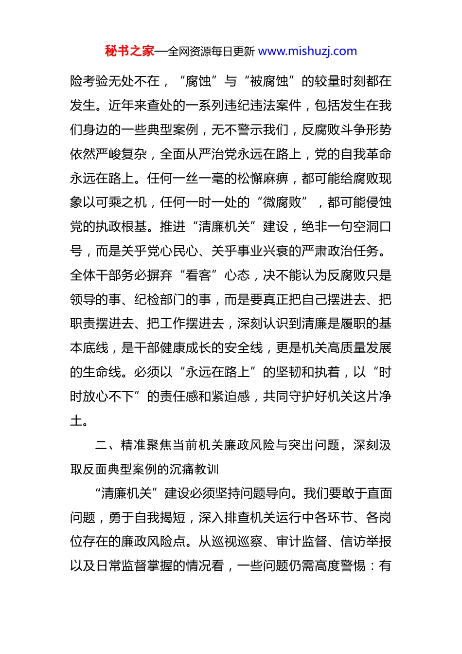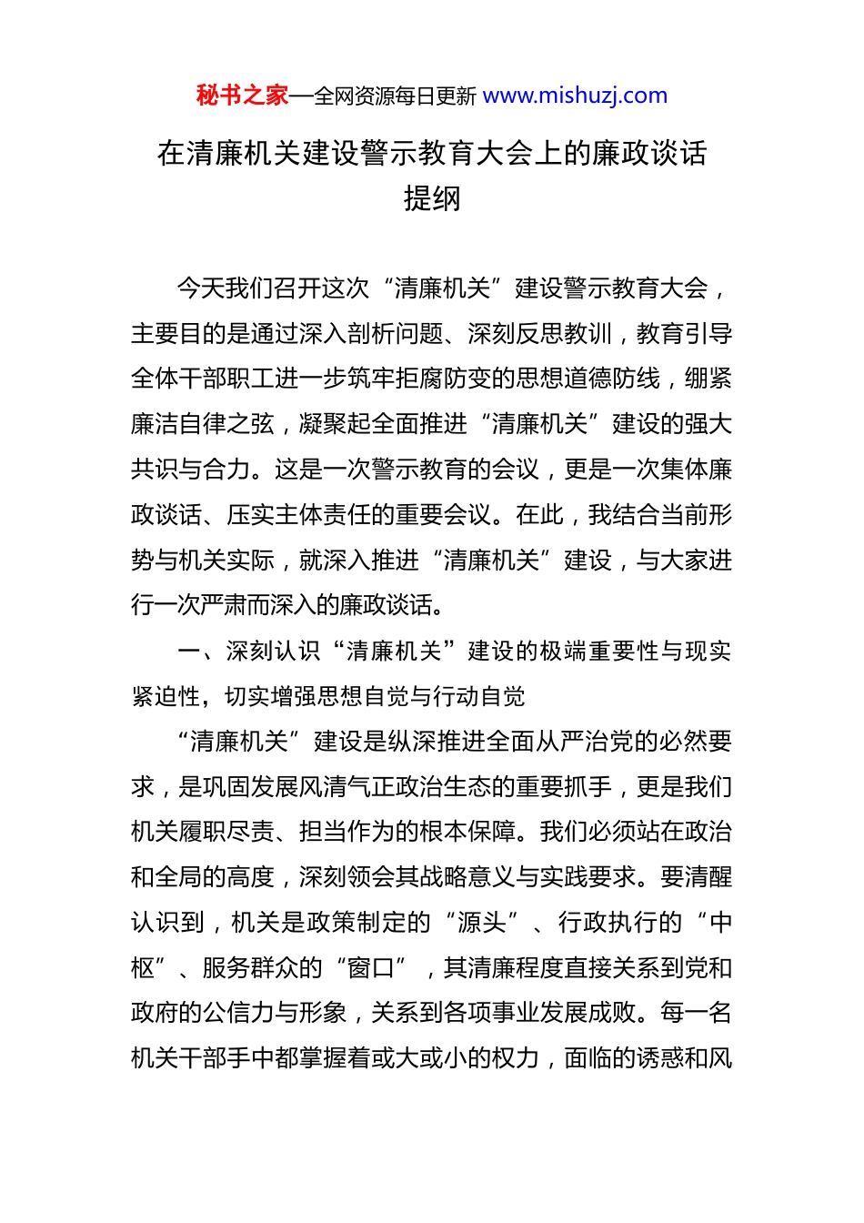 秘书之家—全网资源每日更新 www.mishuzj.com在清廉机关建设警示教育大会上的廉政谈话提纲 今天我们召开这次“清廉机关”建设警示教育大会,主要目的是通过深入剖析问题、深刻反思教训,教育引导全体干部职工进一步筑牢拒腐防变的思想道德防线,绷紧廉洁自律之弦,凝聚起全面推进“清廉机关”建设的强大共识与合力。这是一次警示教育的会议,更是一次集体廉政谈话、压实主体责任的重要会议。在此,我结合当前形势与机关实际,就深入推进“清廉机关”建设,与大家进行一次严肃而深入的廉政谈话。一、深刻认识“清廉机关”建设的极端重要性与现实紧迫性,切实增强思想自觉与行动自觉“清廉机关”建设是纵深推进全面从严治党的必然要求,是巩固发展风清气正政治生态的重要抓手,更是我们机关履职尽责、担当作为的根本保障。我们必须站在政治和全局的高度,深刻领会其战略意义与实践要求。要清醒认识到,机关是政策制定的“源头”、行政执行的“中枢”、服务群众的“窗口”,其清廉程度直接关系到党和政府的公信力与形象,关系到各项事业发展成败。每一名机关干部手中都掌握着或大或小的权力,面临的诱惑和风秘书之家—全网资源每日更新 www.mishuzj.com险考验无处不在,“腐蚀”与“被腐蚀”的较量时刻都在发生。近年来查处的一系列违纪违法案件,包括发生在我们身边的一些典型案例,无不警示我们,反腐败斗争形势依然严峻复杂,全面从严治党永远在路上,党的自我革命永远在路上。任何一丝一毫的松懈麻痹,都可能给腐败现象以可乘之机,任何一时一处的“微腐败”,都可能侵蚀党的执政根基。推进“清廉机关”建设,绝非一句空洞口号,而是关乎党心民心、关乎事业兴衰的严肃政治任务。全体干部务必摒弃“看客”心态,决不能认为反腐败只是领导的事、纪检部门的事,而是要真正把自己摆进去、把职责摆进去、把工作摆进去,深刻认识到清廉是履职的基本底线,是干部健康成长的安全线,更是机关高质量发展的生命线。必须以“永远在路上”的坚韧和执着,以“时时放心不下”的责任感和紧迫感,共同守护好机关这片净土。二、精准聚焦当前机关廉政风险与突出问题,深刻汲取反面典型案例的沉痛教训“清廉机关”建设必须坚持问题导向。我们要敢于直面问题,勇于自我揭短,深入排查机关运行中各环节、各岗位存在的廉政风险点。从巡视巡察、审计监督、信访举报以及日常监督掌握的情况看,一些问题仍需高度警惕:有秘书之家—全网资源每日更新 www.mishuzj.com的领域权力运行监督制约机制还不够完善,自由裁量权过大,存在被滥用的风险;个别干部理想信念“总开关”松动,纪律规矩意识淡薄,对中央八项规定精神及其实施细则要求熟视无睹、心存侥幸,甚至顶风违纪;形式主义、官僚主义问题尚未根除,推诿扯皮、效率低下等现象依然存在,损害群众利益;一些重点领域和关键环节,如项目审批、资金管理、物资采购、选人用人等,仍是腐败问题易发高发区;少数干部交往圈、生活圈不纯洁,被“围猎”风险较高;有的部门内部管理“宽松软”,对干部教育管理监督失之于宽、失之于软,日常“红脸出汗”不够。刚才通报的典型案例,触目惊心,发人深省。他们之所以滑向违纪违法的深渊,根源在于理想信念崩塌、政治意识淡薄、权力观扭曲、纪法底线失守。这些案例就像一面面镜子,映照出腐败行为带来的巨大危害——给党和国家事业造成损失,给家庭带来巨大痛苦,个人身败名裂、追悔莫及。全体干部一定要以案为鉴、警钟长鸣,深刻反思,引以为戒。要算好政治账、经济账、名誉账、家庭账、亲情账、自由账、健康账这“七笔账”,时刻自重、自省、自警、自励,牢牢守住底线、坚决不越红线、绝不碰高压线。三、坚守初心使命,筑牢拒腐防变的思想根基与道德秘书之家—全网资源每日更新 www.mishuzj.com防线清正廉洁是共产党人安身立命的政治本色。筑牢思想防线是反腐倡廉的基础性工程。要坚持用党的创新理论武装头脑,持续巩固拓展主题教育成果,深入学习党章党规党 纪 和 法 律 法 规 , 补 足 精 神 之 “ 钙 ” , 铸 牢 思 想 之“魂”,不断提高政治判断力、政治领悟力、政治执行力。要常态...