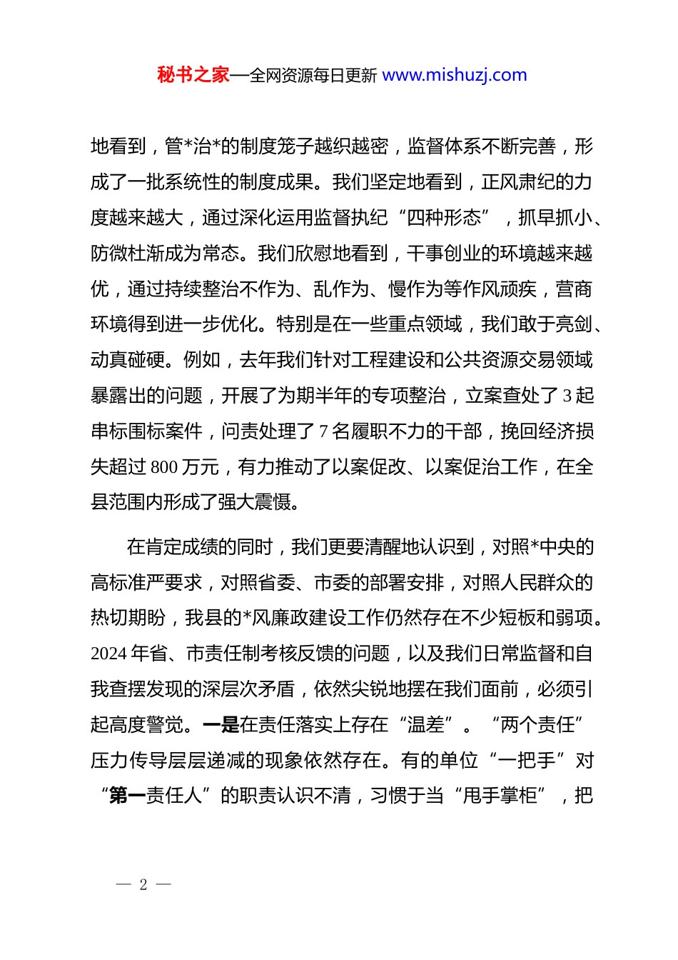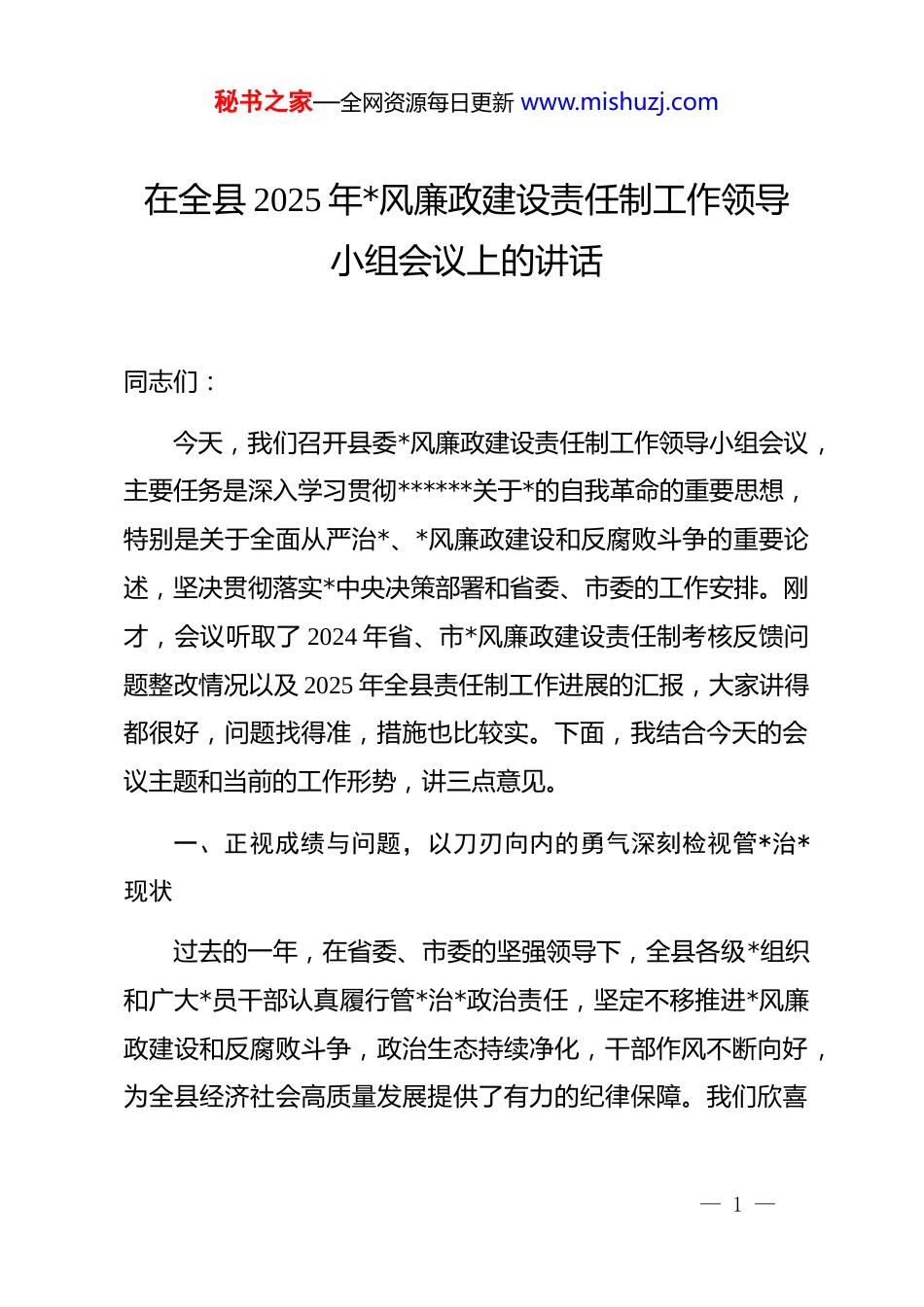 秘书之家—全网资源每日更新 www.mishuzj.com在全县 2025 年*风廉政建设责任制工作领导小组会议上的讲话同志们:今天,我们召开县委*风廉政建设责任制工作领导小组会议,主要任务是深入学习贯彻******关于*的自我革命的重要思想,特别是关于全面从严治*、*风廉政建设和反腐败斗争的重要论述,坚决贯彻落实*中央决策部署和省委、市委的工作安排。刚才,会议听取了 2024 年省、市*风廉政建设责任制考核反馈问题整改情况以及 2025 年全县责任制工作进展的汇报,大家讲得都很好,问题找得准,措施也比较实。下面,我结合今天的会议主题和当前的工作形势,讲三点意见。一、正视成绩与问题,以刀刃向内的勇气深刻检视管*治*现状过去的一年,在省委、市委的坚强领导下,全县各级*组织和广大*员干部认真履行管*治*政治责任,坚定不移推进*风廉政建设和反腐败斗争,政治生态持续净化,干部作风不断向好,为全县经济社会高质量发展提供了有力的纪律保障。我们欣喜— 1 —秘书之家—全网资源每日更新 www.mishuzj.com地看到,管*治*的制度笼子越织越密,监督体系不断完善,形成了一批系统性的制度成果。我们坚定地看到,正风肃纪的力度越来越大,通过深化运用监督执纪“四种形态”,抓早抓小、防微杜渐成为常态。我们欣慰地看到,干事创业的环境越来越优,通过持续整治不作为、乱作为、慢作为等作风顽疾,营商环境得到进一步优化。特别是在一些重点领域,我们敢于亮剑、动真碰硬。例如,去年我们针对工程建设和公共资源交易领域暴露出的问题,开展了为期半年的专项整治,立案查处了 3 起串标围标案件,问责处理了 7 名履职不力的干部,挽回经济损失超过 800 万元,有力推动了以案促改、以案促治工作,在全县范围内形成了强大震慑。在肯定成绩的同时,我们更要清醒地认识到,对照*中央的高标准严要求,对照省委、市委的部署安排,对照人民群众的热切期盼,我县的*风廉政建设工作仍然存在不少短板和弱项。2024 年省、市责任制考核反馈的问题,以及我们日常监督和自我查摆发现的深层次矛盾,依然尖锐地摆在我们面前,必须引起高度警觉。一是在责任落实上存在“温差”。“两个责任”压力传导层层递减的现象依然存在。有的单位“一把手”对“第一责任人”的职责认识不清,习惯于当“甩手掌柜”,把— 2 —秘书之家—全网资源每日更新 www.mishuzj.com责任推给纪委(纪检组),认为业务工作是“硬指标”,*风廉政建设是“软任务”,导致主体责任与监督责任未能同向发力、同频共振。有的领导干部履行“一岗双责”意识不强,对分管领域的干部疏于教育、管理和监督,谈心谈话走过场,日常提醒不及时,成了“好好先生”,致使小问题演变成大问题。二是在政治监督上存在“偏差”。监督的精准性和有效性还有待提升。部分单位在贯彻落实上级决策部署时,满足于开会发文、安排部署,但在如何结合本地本部门实际、创造性地抓好落实上办法不多,导致政治监督与业务工作“两张皮”。对一些重点领域、关键环节的监督还不够深入,比如对项目审批、资金拨付、国资管理等环节的廉政风险点排查不够全面,风险防控措施未能完全堵塞漏洞。三是在作风建设上存在“落差”。纠治“四风”问题树倒根存,隐形变异现象时有发生。一些干部仍然存在形式主义、官僚主义作风,习惯于用会议落实会议,用文件落实文件,调查研究“坐着车子转、隔着玻璃看”。一些“不吃公款吃老板”、违规收送礼品礼金、借操办婚丧喜庆事宜敛财等问题依然禁而未绝,从“明面”转向“暗地”,穿上了“新马甲”。四是在执纪问责上存在“偏差”。“严”的基调还没有完全落实到位。有的纪检监察组织在运用“第一种形态”上还不够大胆、不够经常,对一些苗头性、倾向性问题— 3 —秘书之家—全网资源每日更新 www.mishuzj.com“红脸出汗”不够,导致惩前毖后的效果未充分发挥。在查办案件的“后半篇文章”上,有的单位以案促改、以案促治流于形式,警示教育满足于读通报、看片子,未能真正触及灵魂、形成常态长效的治理机制。五是在队伍建设上存在“反差”。对*员干部的日常教育管理监督还不够严格。少数干部纪律意识和规矩意识淡...