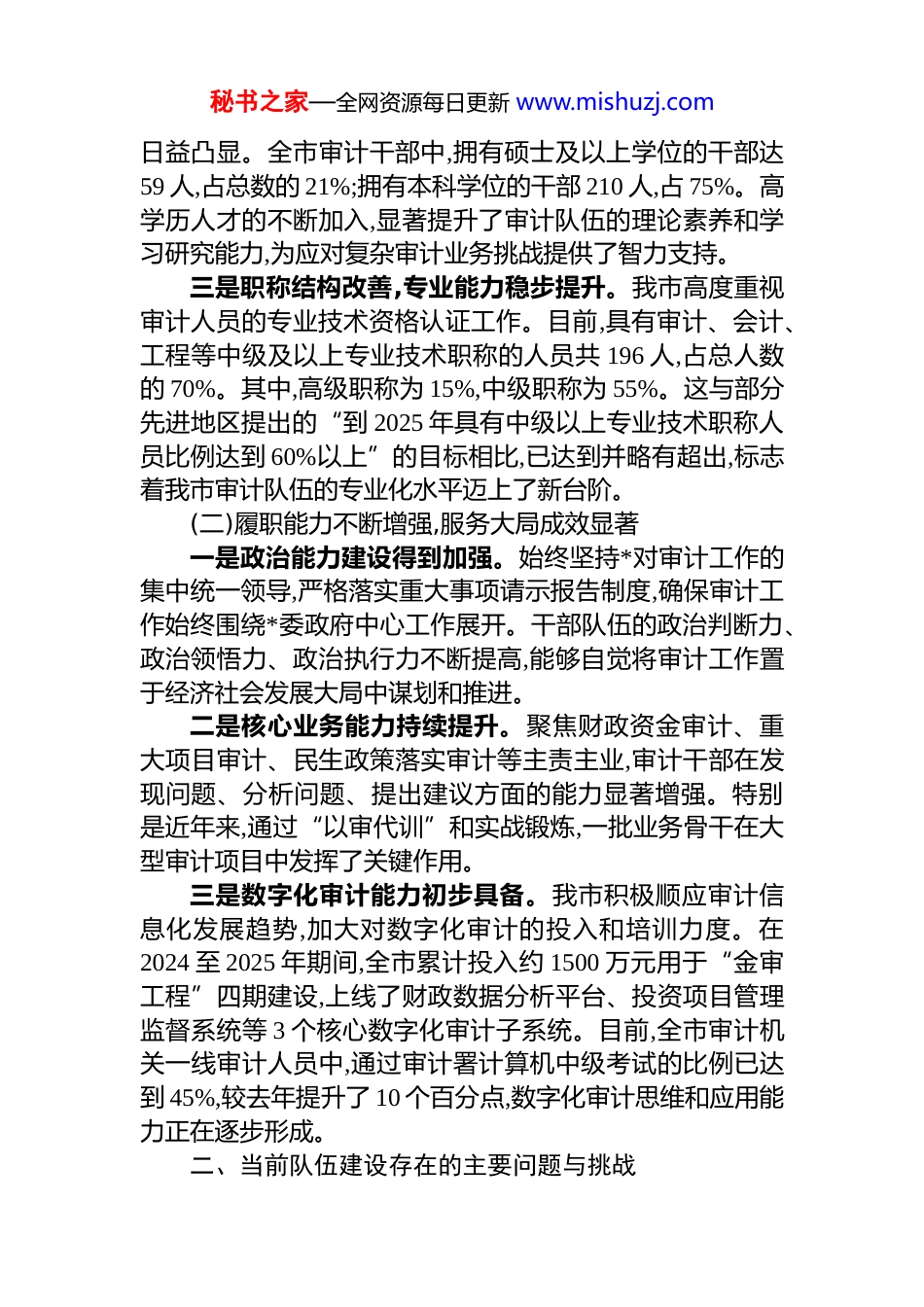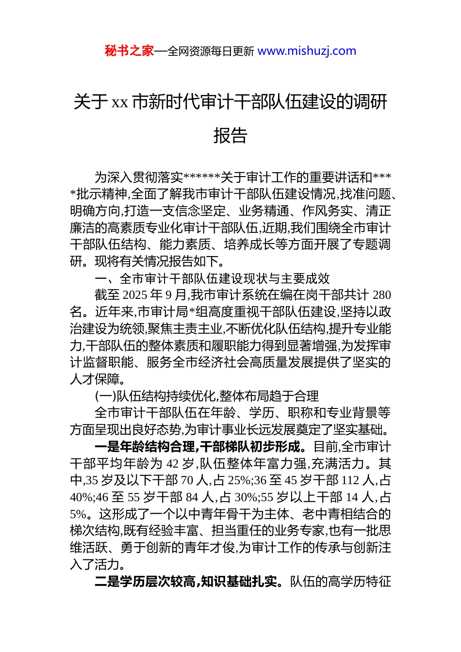 秘书之家—全网资源每日更新 www.mishuzj.com关于 xx 市新时代审计干部队伍建设的调研报告为深入贯彻落实******关于审计工作的重要讲话和****批示精神,全面了解我市审计干部队伍建设情况,找准问题、明确方向,打造一支信念坚定、业务精通、作风务实、清正廉洁的高素质专业化审计干部队伍,近期,我们围绕全市审计干部队伍结构、能力素质、培养成长等方面开展了专题调研。现将有关情况报告如下。一、全市审计干部队伍建设现状与主要成效截至 2025 年 9 月,我市审计系统在编在岗干部共计 280名。近年来,市审计局*组高度重视干部队伍建设,坚持以政治建设为统领,聚焦主责主业,不断优化队伍结构,提升专业能力,干部队伍的整体素质和履职能力得到显著增强,为发挥审计监督职能、服务全市经济社会高质量发展提供了坚实的人才保障。(一)队伍结构持续优化,整体布局趋于合理全市审计干部队伍在年龄、学历、职称和专业背景等方面呈现出良好态势,为审计事业长远发展奠定了坚实基础。一是年龄结构合理,干部梯队初步形成。目前,全市审计干部平均年龄为 42 岁,队伍整体年富力强,充满活力。其中,35 岁及以下干部 70 人,占 25%;36 至 45 岁干部 112 人,占40%;46 至 55 岁干部 84 人,占 30%;55 岁以上干部 14 人,占5%。这形成了一个以中青年骨干为主体、老中青相结合的梯次结构,既有经验丰富、担当重任的业务专家,也有一批思维活跃、勇于创新的青年才俊,为审计工作的传承与创新注入了活力。二是学历层次较高,知识基础扎实。队伍的高学历特征秘书之家—全网资源每日更新 www.mishuzj.com日益凸显。全市审计干部中,拥有硕士及以上学位的干部达59 人,占总数的 21%;拥有本科学位的干部 210 人,占 75%。高学历人才的不断加入,显著提升了审计队伍的理论素养和学习研究能力,为应对复杂审计业务挑战提供了智力支持。三是职称结构改善,专业能力稳步提升。我市高度重视审计人员的专业技术资格认证工作。目前,具有审计、会计、工程等中级及以上专业技术职称的人员共 196 人,占总人数的 70%。其中,高级职称为 15%,中级职称为 55%。这与部分先进地区提出的“到 2025 年具有中级以上专业技术职称人员比例达到 60%以上”的目标相比,已达到并略有超出,标志着我市审计队伍的专业化水平迈上了新台阶。(二)履职能力不断增强,服务大局成效显著一是政治能力建设得到加强。始终坚持*对审计工作的集中统一领导,严格落实重大事项请示报告制度,确保审计工作始终围绕*委政府中心工作展开。干部队伍的政治判断力、政治领悟力、政治执行力不断提高,能够自觉将审计工作置于经济社会发展大局中谋划和推进。二是核心业务能力持续提升。聚焦财政资金审计、重大项目审计、民生政策落实审计等主责主业,审计干部在发现问题、分析问题、提出建议方面的能力显著增强。特别是近年来,通过“以审代训”和实战锻炼,一批业务骨干在大型审计项目中发挥了关键作用。三是数字化审计能力初步具备。我市积极顺应审计信息化发展趋势,加大对数字化审计的投入和培训力度。在2024 至 2025 年期间,全市累计投入约 1500 万元用于“金审工程”四期建设,上线了财政数据分析平台、投资项目管理监督系统等 3 个核心数字化审计子系统。目前,全市审计机关一线审计人员中,通过审计署计算机中级考试的比例已达到 45%,较去年提升了 10 个百分点,数字化审计思维和应用能力正在逐步形成。二、当前队伍建设存在的主要问题与挑战秘书之家—全网资源每日更新 www.mishuzj.com在肯定成绩的同时,我们必须清醒地认识到,对照新时代审计工作“如臂使指、如影随形、如雷贯耳”的总要求,我市审计干部队伍建设仍存在一些深层次的矛盾和问题,主要体现在以下几个方面。(一)队伍结构性矛盾依然存在,人才布局亟待优化一是复合型人才短缺问题突出。随着审计监督领域的不断拓展,对既精通审计业务,又熟悉金融、信息技术、自然资源、生态环保等特定行业知识的复合型人才需求日益迫切。目前我市审计队伍中,具备信息技术与财务会计、工程与审计等多重专业背景的“双栖”人才占比仅约 18%,难以完全适应大数据环境下跨领域、跨行业、跨层级的...