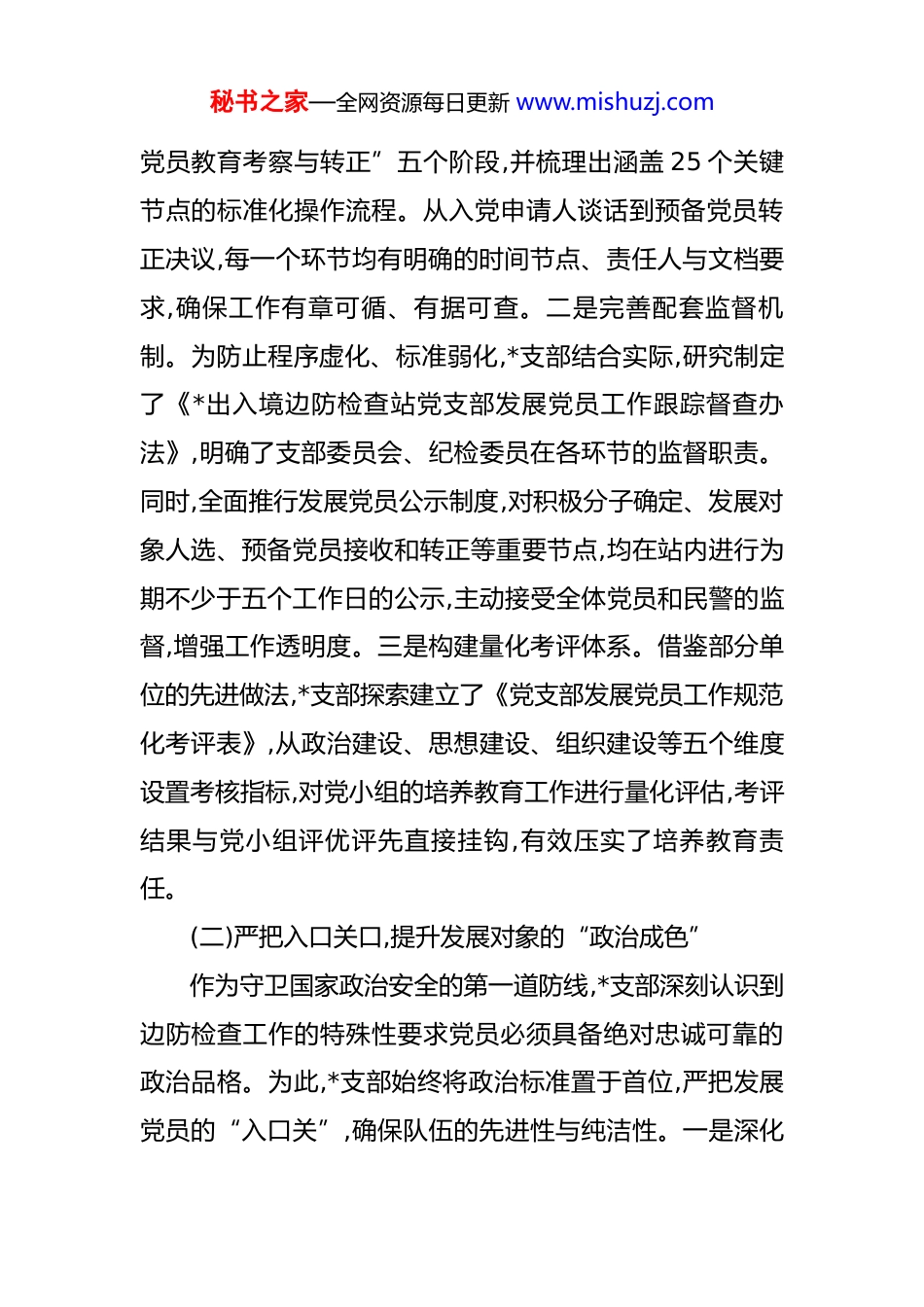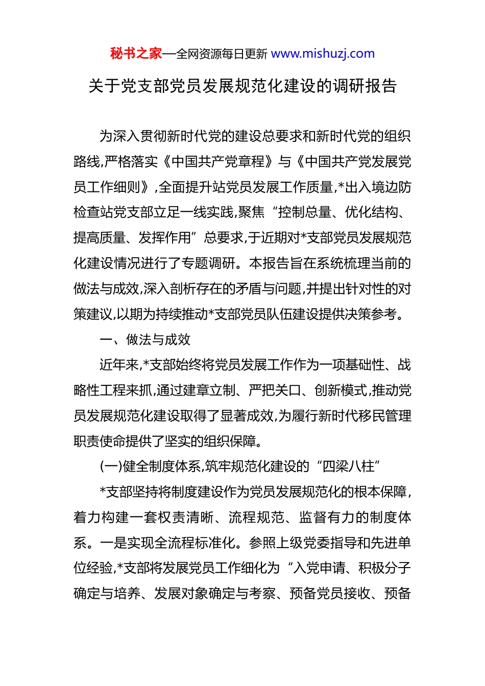 秘书之家—全网资源每日更新 www.mishuzj.com关于党支部党员发展规范化建设的调研报告 为深入贯彻新时代党的建设总要求和新时代党的组织路线,严格落实《中国共产党章程》与《中国共产党发展党员工作细则》,全面提升站党员发展工作质量,*出入境边防检查站党支部立足一线实践,聚焦“控制总量、优化结构、提高质量、发挥作用”总要求,于近期对*支部党员发展规范化建设情况进行了专题调研。本报告旨在系统梳理当前的做法与成效,深入剖析存在的矛盾与问题,并提出针对性的对策建议,以期为持续推动*支部党员队伍建设提供决策参考。一、做法与成效近年来,*支部始终将党员发展工作作为一项基础性、战略性工程来抓,通过建章立制、严把关口、创新模式,推动党员发展规范化建设取得了显著成效,为履行新时代移民管理职责使命提供了坚实的组织保障。(一)健全制度体系,筑牢规范化建设的“四梁八柱”*支部坚持将制度建设作为党员发展规范化的根本保障,着力构建一套权责清晰、流程规范、监督有力的制度体系。一是实现全流程标准化。参照上级党委指导和先进单位经验,*支部将发展党员工作细化为“入党申请、积极分子确定与培养、发展对象确定与考察、预备党员接收、预备秘书之家—全网资源每日更新 www.mishuzj.com党员教育考察与转正”五个阶段,并梳理出涵盖 25 个关键节点的标准化操作流程。从入党申请人谈话到预备党员转正决议,每一个环节均有明确的时间节点、责任人与文档要求,确保工作有章可循、有据可查。二是完善配套监督机制。为防止程序虚化、标准弱化,*支部结合实际,研究制定了《*出入境边防检查站党支部发展党员工作跟踪督查办法》,明确了支部委员会、纪检委员在各环节的监督职责。同时,全面推行发展党员公示制度,对积极分子确定、发展对象人选、预备党员接收和转正等重要节点,均在站内进行为期不少于五个工作日的公示,主动接受全体党员和民警的监督,增强工作透明度。三是构建量化考评体系。借鉴部分单位的先进做法,*支部探索建立了《党支部发展党员工作规范化考评表》,从政治建设、思想建设、组织建设等五个维度设置考核指标,对党小组的培养教育工作进行量化评估,考评结果与党小组评优评先直接挂钩,有效压实了培养教育责任。(二)严把入口关口,提升发展对象的“政治成色”作为守卫国家政治安全的第一道防线,*支部深刻认识到边防检查工作的特殊性要求党员必须具备绝对忠诚可靠的政治品格。为此,*支部始终将政治标准置于首位,严把发展党员的“入口关”,确保队伍的先进性与纯洁性。一是深化秘书之家—全网资源每日更新 www.mishuzj.com政治审查。在政治审查环节,除函询本人户籍地、居住地党组织外,*支部还结合边检工作特点,将审查范围延伸至发展对象的家庭成员、主要社会关系在境内外的活动情况,并协同有关部门进行背景核查,坚决防止任何政治上的“带病入党”。2024 年,*支部在发展党员过程中,通过严格的政治审查,成功甄别并中止了一名存在潜在风险的发展对象的培养程序。二是强化政治历练。*支部坚持在斗争一线和艰苦岗位上考察和识别干部,有意识地将入党积极分子和发展对象安排到口岸执勤、专项勤务、应急处突等关键岗位进行磨砺。通过观察其在面对复杂局面、重大考验时的政治立场、思想觉悟和行动表现,对其政治素质进行全方位、立体式的“政治画像”,确保考察结果的客观真实。三是严抓集中培训。发展对象在接收为预备党员前,必须参加不少于 24个学时的短期集中培训。培训内容聚焦党的基本理论、党史、党章党规党纪以及移民管理警察的职责使命教育,并邀请站荣休老党员讲述戍边卫国的光荣传统,通过理论与实践相结合的方式,帮助发展对象从思想深处解决“为什么入党、入党干什么”的根本问题。(三)创新培养模式,激活党员队伍的“源头活水”*支部注重将党员的培养教育融入日常、抓在经常,通过创新培养模式,持续为党员队伍注入生机与活力。一是推行秘书之家—全网资源每日更新 www.mishuzj.com“党建+业务”融合培养。*支部打破了党务工作与业务工作“两张皮”的现象,将培养联系人的职责与业务导师的职责相结合。培养联系人不仅要指导积极分子的思想理论学习,更要在业务工作中言传身教,引...