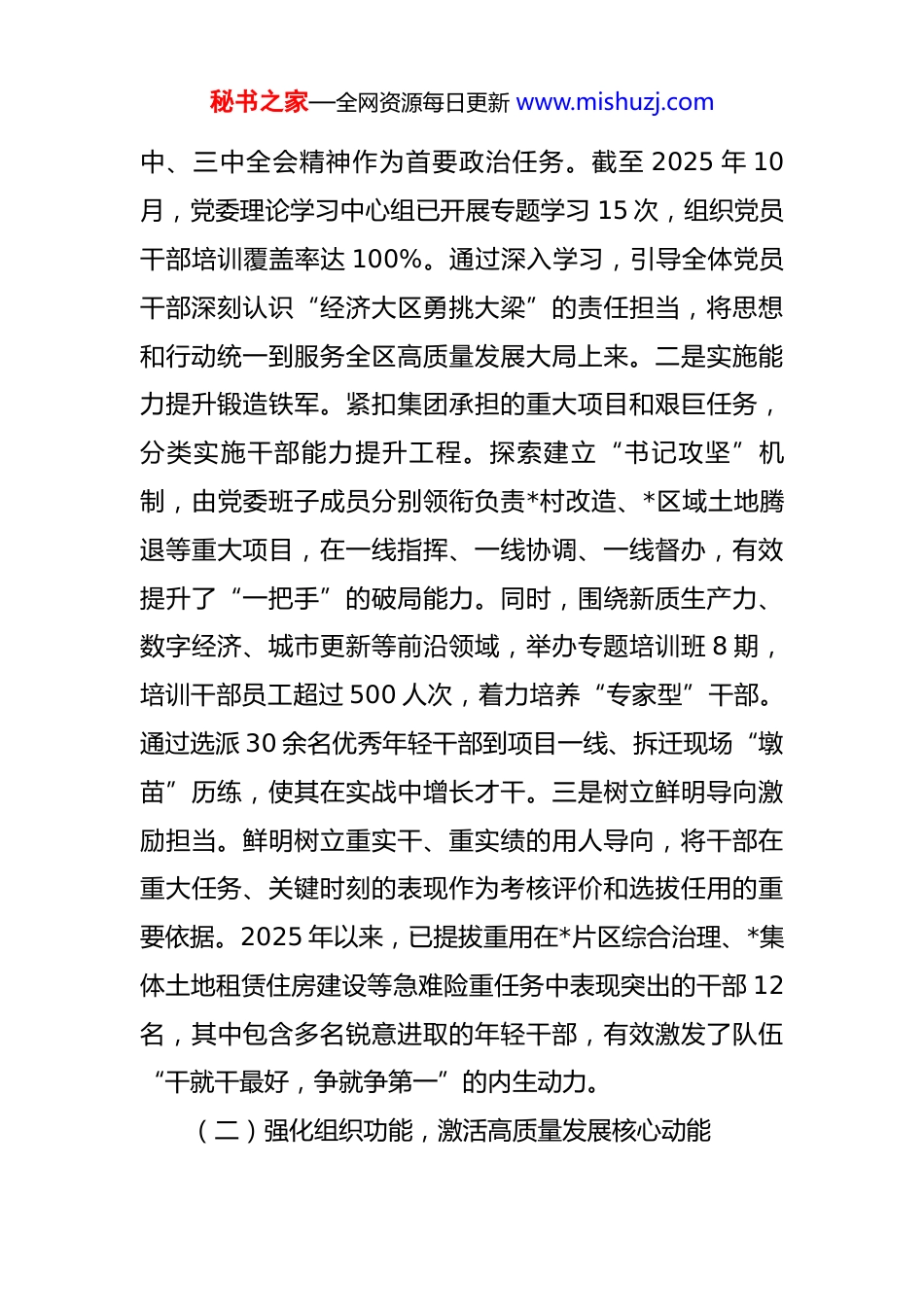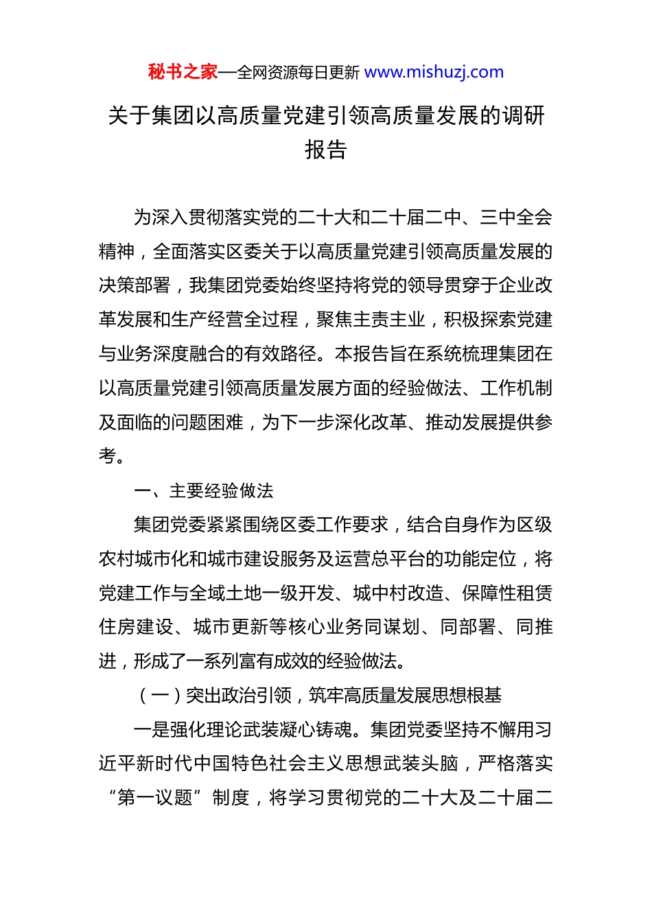 秘书之家—全网资源每日更新 www.mishuzj.com关于集团以高质量党建引领高质量发展的调研报告 为深入贯彻落实党的二十大和二十届二中、三中全会精神,全面落实区委关于以高质量党建引领高质量发展的决策部署,我集团党委始终坚持将党的领导贯穿于企业改革发展和生产经营全过程,聚焦主责主业,积极探索党建与业务深度融合的有效路径。本报告旨在系统梳理集团在以高质量党建引领高质量发展方面的经验做法、工作机制及面临的问题困难,为下一步深化改革、推动发展提供参考。一、主要经验做法集团党委紧紧围绕区委工作要求,结合自身作为区级农村城市化和城市建设服务及运营总平台的功能定位,将党建工作与全域土地一级开发、城中村改造、保障性租赁住房建设、城市更新等核心业务同谋划、同部署、同推进,形成了一系列富有成效的经验做法。(一)突出政治引领,筑牢高质量发展思想根基一是强化理论武装凝心铸魂。集团党委坚持不懈用习近平新时代中国特色社会主义思想武装头脑,严格落实“第一议题”制度,将学习贯彻党的二十大及二十届二秘书之家—全网资源每日更新 www.mishuzj.com中、三中全会精神作为首要政治任务。截至 2025 年 10月,党委理论学习中心组已开展专题学习 15 次,组织党员干部培训覆盖率达 100%。通过深入学习,引导全体党员干部深刻认识“经济大区勇挑大梁”的责任担当,将思想和行动统一到服务全区高质量发展大局上来。二是实施能力提升锻造铁军。紧扣集团承担的重大项目和艰巨任务,分类实施干部能力提升工程。探索建立“书记攻坚”机制,由党委班子成员分别领衔负责*村改造、*区域土地腾退等重大项目,在一线指挥、一线协调、一线督办,有效提升了“一把手”的破局能力。同时,围绕新质生产力、数字经济、城市更新等前沿领域,举办专题培训班 8 期,培训干部员工超过 500 人次,着力培养“专家型”干部。通过选派 30 余名优秀年轻干部到项目一线、拆迁现场“墩苗”历练,使其在实战中增长才干。三是树立鲜明导向激励担当。鲜明树立重实干、重实绩的用人导向,将干部在重大任务、关键时刻的表现作为考核评价和选拔任用的重要依据。2025 年以来,已提拔重用在*片区综合治理、*集体土地租赁住房建设等急难险重任务中表现突出的干部 12名,其中包含多名锐意进取的年轻干部,有效激发了队伍“干就干最好,争就争第一”的内生动力。(二)强化组织功能,激活高质量发展核心动能秘书之家—全网资源每日更新 www.mishuzj.com一是深化党建品牌赋能发展。集团党委着力深化“筑城先锋”党建品牌建设,将其作为推动党建与业务深度融合的总抓手。品牌建设并非空洞口号,而是构建了“1+N”的品牌矩阵,即在“筑城先锋”总品牌下,各项目一线党支部根据业务特点创立“安居先锋”“更新先锋”“开拓先锋”等子品牌,使党建工作与保租房建设、城市更新、土地开发等具体业务紧密结合。通过品牌引领,将党组织的政治优势、组织优势转化为攻坚克难、推动发展的竞争优势。二是创新“揭榜挂帅”激发活力。围绕国有企业主责主业,聚焦“两区”建设、数字经济等重大项目和年度重点任务,全面推行“揭榜挂帅”机制。针对*区域城中村改造这一硬骨头,集团党委发布了包含前期协商、拆迁腾退、规划设计等多个关键节点的“攻坚榜”,鼓励党员干部和业务骨干组建突击队“揭榜”。截至目前,已有 5 支党员突击队成功“揭榜”,通过数字化平台动态“亮榜”,攻克了长期困扰项目进度的居民协调、手续办理等难题,项目整体进度提速约 15%,有效激发了国企创新活力与攻坚实力。三是打造“红色引擎”凝聚合力。集团党委通过设立“党员责任区”“党员示范岗”,将党建工作嵌入生产经营全链条。在重点工程项目中划分“党员责任田”,明确秘书之家—全网资源每日更新 www.mishuzj.com党员在质量管控、安全监督、技术创新等方面的具体职责,形成“一个党员就是一面旗帜”的示范效应。同时,开展“金点子”征集活动,鼓励党员围绕降本增效、工艺改进等提出创新建议,累计采纳有效建议 127 条,创造直接经济效益超千万元,真正将组织优势转化为发展动能。(三)深化协同共治,提升...