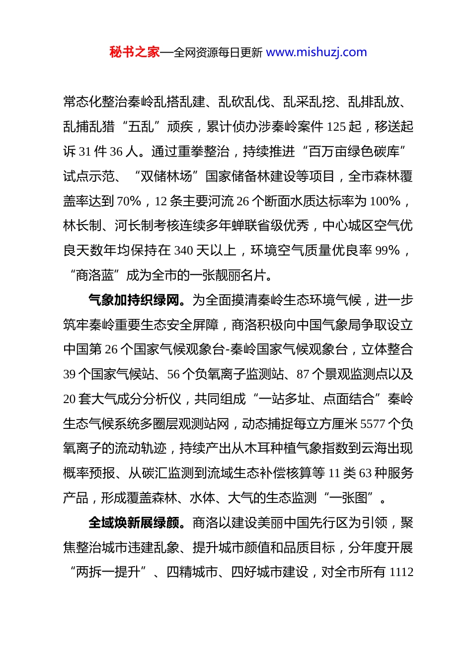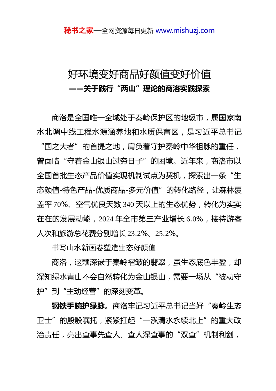 秘书之家—全网资源每日更新 www.mishuzj.com好环境变好商品好颜值变好价值——关于践行“两山”理论的商洛实践探索商洛是全国唯一全域处于秦岭保护区的地级市,属国家南水北调中线工程水源涵养地和水质保育区,是习近平总书记“国之大者”的首提之地,肩负着守护秦岭中华祖脉的重任,曾面临“守着金山银山过穷日子”的困境。近年来,商洛市以全国首批生态产品价值实现机制试点为契机,探索出一条“生态颜值-特色产品-优质商品-多元价值”的转化路径,让森林覆盖率 70%、空气优良天数 340 天以上的生态优势,转化为实实在在的发展动能,2024 年全市第三产业增长 6.0%,接待游客人次和旅游总花费分别增长 23.2%、25.2%。书写山水新画卷塑造生态好颜值商洛,这颗深嵌于秦岭褶皱的翡翠,虽生态底色丰盈,却深知绿水青山不会自然转化为金山银山,需要一场从“被动守护”到“主动经营”的深刻变革。钢铁手腕护绿脉。商洛牢记习近平总书记当好“秦岭生态卫士”的殷殷嘱托,紧紧扛起“一泓清水永续北上”的重大政治责任,亮出查事先查人、查人深查事的“双查”机制利剑,秘书之家—全网资源每日更新 www.mishuzj.com常态化整治秦岭乱搭乱建、乱砍乱伐、乱采乱挖、乱排乱放、乱捕乱猎“五乱”顽疾,累计侦办涉秦岭案件 125 起,移送起诉 31 件 36 人。通过重拳整治,持续推进“百万亩绿色碳库”试点示范、“双储林场”国家储备林建设等项目,全市森林覆盖率达到 70%,12 条主要河流 26 个断面水质达标率为 100%,林长制、河长制考核连续多年蝉联省级优秀,中心城区空气优良天数年均保持在 340 天以上,环境空气质量优良率 99%,“商洛蓝”成为全市的一张靓丽名片。气象加持织绿网。为全面摸清秦岭生态环境气候,进一步筑牢秦岭重要生态安全屏障,商洛积极向中国气象局争取设立中国第 26 个国家气候观象台-秦岭国家气候观象台,立体整合39 个国家气候站、56 个负氧离子监测站、87 个景观监测点以及20 套大气成分分析仪,共同组成“一站多址、点面结合”秦岭生态气候系统多圈层观测站网,动态捕捉每立方厘米 5577 个负氧离子的流动轨迹,持续产出从木耳种植气象指数到云海出现概率预报、从碳汇监测到流域生态补偿核算等 11 类 63 种服务产品,形成覆盖森林、水体、大气的生态监测“一张图”。全域焕新展绿颜。商洛以建设美丽中国先行区为引领,聚焦整治城市违建乱象、提升城市颜值和品质目标,分年度开展“两拆一提升”、四精城市、四好城市建设,对全市所有 1112秘书之家—全网资源每日更新 www.mishuzj.com个居民小区开展环境整治,累计拆除违建腾挪的 1100 亩土地现已蜕变为城市绿肺,曾经淤塞的河床通过河流沟峪和水生态修复治理重现清流,城市更新经验被住建部全国推广。同时,创新开展“干净商洛”和秦岭山水乡村建设,全域实施“五治一提升”,创建省级“千万工程”示范村 34 个、秦岭山水乡村300 个、和美镇区 86 个,打造民宿集群 70 个,推动“乡村变景区、农房变民宿、农产品变商品”,商洛成为全国首个“美丽中国·深呼吸之都”,朱家湾村入选联合国世界旅游组织“最佳旅游乡村”,乡村从“脏乱差”蜕变为“水清岸绿、鱼翔浅底”的生态画廊。破译绿色基因库培育本地好产品生态颜值是商洛的底色,而让资源变资产、产品变商品,需要一场从“自然馈赠”到“价值发现”的智慧探索。山地精粹出珍品。商洛充分利用自身气候多样、生态优良、资源富集、具备发展山区特色农业的先天优势,聚焦建设特色农业强市目标,放大“小木耳大产业”示范效应,统筹推进品种培优、品质提升、品牌打造和标准化生产,大力发展食用菌、葡萄酒等,积极引育红仁核桃、三文鱼等特色品种,形成“菌果药畜茶酒渔”特色产业体系,97 个农产品入选全国名特优新农产品名录,商南茶叶、镇安大板栗等 4 个农产品入选第二批秘书之家—全网资源每日更新 www.mishuzj.com全国“气候好产品”,食用菌、冷水鱼等 7 个特色产业规模位居全省之首,商洛果蔬进入沪粤港澳市民餐桌,11 个品类的秦岭特产入驻澳门联丰超市,看似不起眼的“山地货”已成为餐桌上的“香饽饽...