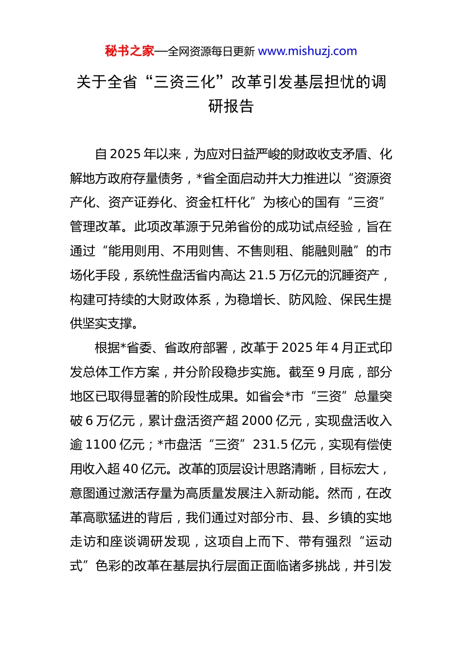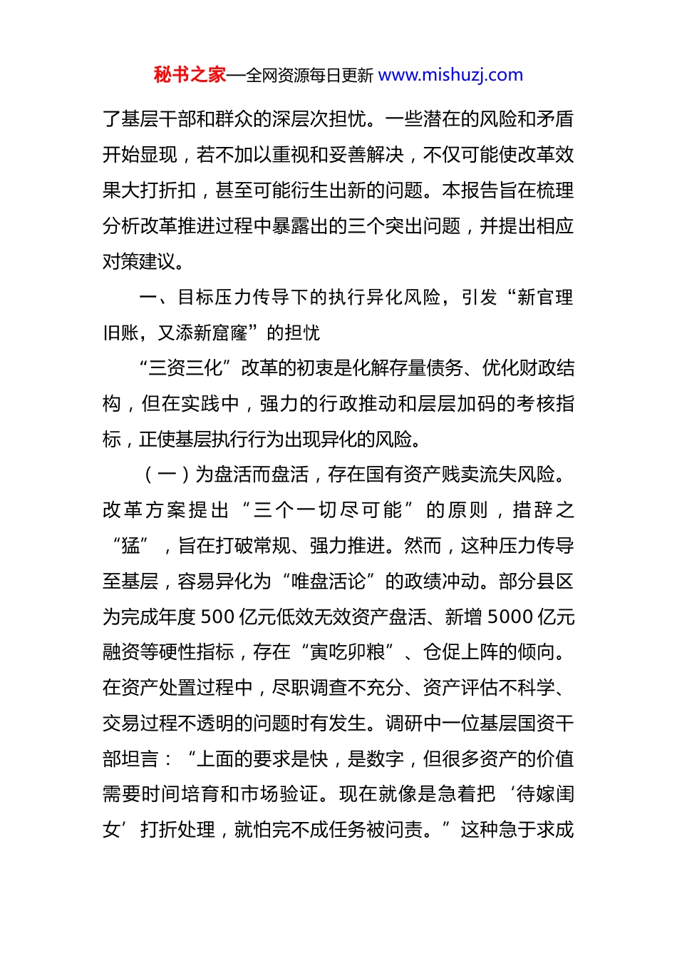 秘书之家—全网资源每日更新 www.mishuzj.com关于全省“三资三化”改革引发基层担忧的调研报告 自 2025 年以来,为应对日益严峻的财政收支矛盾、化解地方政府存量债务,*省全面启动并大力推进以“资源资产化、资产证券化、资金杠杆化”为核心的国有“三资”管理改革。此项改革源于兄弟省份的成功试点经验,旨在通过“能用则用、不用则售、不售则租、能融则融”的市场化手段,系统性盘活省内高达 21.5 万亿元的沉睡资产,构建可持续的大财政体系,为稳增长、防风险、保民生提供坚实支撑。根据*省委、省政府部署,改革于 2025 年 4 月正式印发总体工作方案,并分阶段稳步实施。截至 9 月底,部分地区已取得显著的阶段性成果。如省会*市“三资”总量突破 6 万亿元,累计盘活资产超 2000 亿元,实现盘活收入逾 1100 亿元;*市盘活“三资”231.5 亿元,实现有偿使用收入超 40 亿元。改革的顶层设计思路清晰,目标宏大,意图通过激活存量为高质量发展注入新动能。然而,在改革高歌猛进的背后,我们通过对部分市、县、乡镇的实地走访和座谈调研发现,这项自上而下、带有强烈“运动式”色彩的改革在基层执行层面正面临诸多挑战,并引发秘书之家—全网资源每日更新 www.mishuzj.com了基层干部和群众的深层次担忧。一些潜在的风险和矛盾开始显现,若不加以重视和妥善解决,不仅可能使改革效果大打折扣,甚至可能衍生出新的问题。本报告旨在梳理分析改革推进过程中暴露出的三个突出问题,并提出相应对策建议。一、目标压力传导下的执行异化风险,引发“新官理旧账,又添新窟窿”的担忧“三资三化”改革的初衷是化解存量债务、优化财政结构,但在实践中,强力的行政推动和层层加码的考核指标,正使基层执行行为出现异化的风险。(一)为盘活而盘活,存在国有资产贱卖流失风险。改 革 方 案 提 出 “ 三 个 一 切 尽 可 能 ” 的 原 则 , 措 辞 之“猛”,旨在打破常规、强力推进。然而,这种压力传导至基层,容易异化为“唯盘活论”的政绩冲动。部分县区为完成年度 500 亿元低效无效资产盘活、新增 5000 亿元融资等硬性指标,存在“寅吃卯粮”、仓促上阵的倾向。在资产处置过程中,尽职调查不充分、资产评估不科学、交易过程不透明的问题时有发生。调研中一位基层国资干部坦言:“上面的要求是快,是数字,但很多资产的价值需要时间培育和市场验证。现在就像是急着把‘待嫁闺女’打折处理,就怕完不成任务被问责。”这种急于求成秘书之家—全网资源每日更新 www.mishuzj.com的做法,极易导致国有资产被低估、贱卖,造成不可逆的损失。(二)为化债而举债,存在新增隐性债务风险。改革强调严守“不得虚增财政收入、不得虚假化债、不得新增隐性债务”的三条红线,但在“资金杠杆化”的实际操作中,风险管控难度极大。基层政府在金融专业能力和风险识别能力上普遍存在短板,对于资产证券化(ABS)、不动产投资信托基金等复杂金融工具的运用,往往过度依赖外部金融机构。部分金融机构为追求自身利益,可能会设计出结构复杂、风险隐蔽的产品,将劣质资产包装上市。地方政府平台公司为促成交易,又可能通过出具“安慰函”、承诺收益回购等方式提供隐性担保,这实质上是将未来的财政收入与不确定的资产收益捆绑,形成了新的隐性债务。一个值得警惕的案例是,*县为盘活一个长期亏损的文旅项目和数栋闲置的行政办公楼,计划将其打包发行ABS 产品。在时间紧、任务重的情况下,县政府聘请的第三方机构给出了一个远高于市场公允价值的资产评估报告,并设计了由县属国企担保的交易结构。该方案虽在账面上“盘活”了数百万元资产,并获得了一笔融资,但其高昂的融资成本和或有担保责任,已为未来财政埋下了重大风险隐患。这种“以债养债”“包装化债”的模式,与秘书之家—全网资源每日更新 www.mishuzj.com改革初衷背道而驰,引起了基层干部“害怕新官理旧账,又添新窟窿”的普遍担忧。(三)为指标而造假,存在数据失真风险。在目标压力的层层传导下,部分基层单位为了在考核中取得好成绩,获取更多的政策支持和资源倾斜,不惜在数据上动手脚。一些地方...