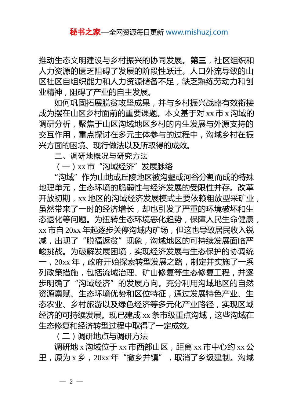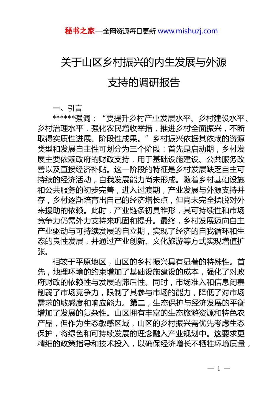 秘书之家—全网资源每日更新 www.mishuzj.com关于山区乡村振兴的内生发展与外源支持的调研报告一、引言******强调:“要提升乡村产业发展水平、乡村建设水平、乡村治理水平,强化农民增收举措,推进乡村全面振兴,不断取得实质性进展、阶段性成果。”乡村振兴依据其依赖的资源类型和发展自主性可划分为三个阶段:首先是启动期,乡村发展主要依赖政府的财政支持,用于基础设施建设、公共服务改善以及直接经济补贴。这一阶段的特征是乡村发展缺乏自主可持续的经济活动,自我发展能力尚未形成。随着乡村基础设施和公共服务的初步完善,进入过渡期,产业发展与外源支持并存,乡村逐渐培育出自己的经济增长点,但尚未完全摆脱对外来援助的依赖。此时,产业链条初具雏形,其可持续性和市场竞争力仍需外力支持来巩固和提升。最终,乡村发展迈向自主产业驱动与可持续发展的自立期,实现了经济的自我循环和生态的良性发展,并通过产业创新、文化旅游等方式实现增值扩张。相较于平原地区,山区的乡村振兴具有显著的特殊性。首先,地理环境的约束增加了基础设施建设的成本,强化了对政府财政的依赖性与发展的滞后性。同时,市场准入和信息闭塞削弱了市场竞争力,限制了其参与市场的能力,降低了对市场需求的敏感度和响应能力。第二,生态保护与经济发展的平衡增加了发展的复杂性。山区拥有丰富的生态旅游资源和特色农产品,但作为生态敏感区域,山区的乡村振兴需优先考虑生态保护,将绿色和可持续发展的理念融入产业规划中。这要求更精细的政策指导和技术投入,以确保经济增长不牺牲环境质量,— 1 —秘书之家—全网资源每日更新 www.mishuzj.com推动生态文明建设与乡村振兴的协同发展。第三,社区组织和人力资源的匮乏阻碍了发展的阶段性跃迁。人口外流导致的山区社区自组织能力和人力资源储备不足,缺乏熟练劳动力和创业精神,阻碍了产业的自主发展。如何巩固拓展脱贫攻坚成果,并与乡村振兴战略有效衔接成为摆在山区乡村面前的重要课题。本文基于对 xx 市 x 沟域的调研分析,聚焦于山区沟域地区乡村的内生发展与外源支持的交互作用,重点探讨在多元主体参与的过程中,沟域乡村在振兴方面的困境、现行做法以及所取得的成效。二、调研地概况与研究方法(一)xx 市“沟域经济”发展脉络“沟域”作为山地或丘陵地区被沟壑或河谷分割而成的特殊地理单元,生态环境的脆弱性与经济发展的受限性并存。改革开放初期,xx 地区的沟域经济发展模式主要依赖粗放型采矿业,虽然带来了一时的经济增长,却也引发了严重的环境破坏和生态退化等问题。为扭转生态环境恶化趋势,保障人民生命健康,xx 市自 20xx 年起逐步关停沟域内矿场,但这也导致居民收入锐减,出现了“脱福返贫”现象,沟域地区的可持续发展面临严峻挑战。为破解发展困境,实现经济发展与生态保护的协调统一,20xx 年,政府开始探索转型发展之路,制定并实施了一系列政策措施,包括流域治理、矿山修复等生态修复工程,并逐步明确了“沟域经济”的发展方向。充分利用沟域地区的自然资源禀赋、生态环境优势和区位特征,通过发展特色产业、生态农业、乡村旅游以及绿色经济等多元化产业路径,实现区域经济的可持续发展。现已建成 xx 条市级重点沟域,这些沟域在生态修复和经济转型过程中取得了一定成效。(二)调研地点与调研方法调研地 x 沟域位于 xx 市西部山区,距离 xx 市中心约 xx 公里,原为 x 乡,20xx 年“撤乡并镇”,取消了乡级建制。沟域— 2 —秘书之家—全网资源每日更新 www.mishuzj.com下辖 x 个行政村,总面积约为 xx 平方公里,海拔高度在 xxx 米至 xxxx 米之间,地形以山地、丘陵为主,自然资源丰富,拥有丰富的森林、水资源以及独特的田园风光。沟域内历史文化底蕴深厚,拥有明清古村落历史文化遗迹。沟域内村庄分布较为分散,且规模差距较大,呈“三大村、三小村”的布局。经济发展水平相对落后,村民收入主要依靠外出务工、公益性岗位和有限的农业生产,常住人口以老年人为主。近年来,沟域内各村积极探索发展路径,依托生态资源和文化资源,发展特色农业、乡村旅游等产业,推动农文...