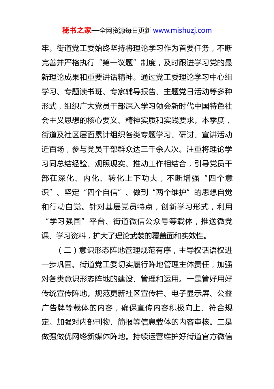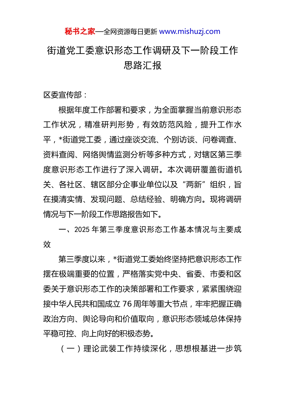 秘书之家—全网资源每日更新 www.mishuzj.com街道党工委意识形态工作调研及下一阶段工作思路汇报 区委宣传部:根据年度工作部署和要求,为全面掌握当前意识形态工作状况,精准研判形势,有效防范风险,提升工作水平,*街道党工委,通过座谈交流、个别访谈、问卷调查、资料查阅、网络舆情监测分析等多种方式,对辖区第三季度意识形态工作进行了深入调研。本次调研覆盖街道机关、各社区、辖区部分企事业单位以及“两新”组织,旨在摸清实情、发现问题、总结经验、明确方向。现将调研情况与下一阶段工作思路报告如下。一、2025 年第三季度意识形态工作基本情况与主要成效第三季度以来,*街道党工委始终坚持把意识形态工作摆在极端重要的位置,严格落实党中央、省委、市委和区委关于意识形态工作的决策部署和工作要求,紧紧围绕迎接中华人民共和国成立 76 周年等重大节点,牢牢把握正确政治方向、舆论导向和价值取向,意识形态领域总体保持平稳可控、向上向好的积极态势。(一)理论武装工作持续深化,思想根基进一步筑秘书之家—全网资源每日更新 www.mishuzj.com牢。街道党工委始终坚持将理论学习作为首要任务,不断完善并严格执行“第一议题”制度,及时跟进学习党的最新理论成果和重要讲话精神。通过党工委理论学习中心组学习、专题读书班、专家辅导报告、主题党日活动等多种形式,组织广大党员干部深入学习领会新时代中国特色社会主义思想的核心要义、精神实质和实践要求。本季度,街道及社区层面累计组织各类专题学习、研讨、宣讲活动近百场,参与党员干部群众达三千余人次。注重将理论学习同总结经验、观照现实、推动工作相结合,引导党员干部在深化、内化、转化上下功夫,不断增强“四个意识”、坚定“四个自信”、做到“两个维护”的思想自觉和行动自觉。针对基层党员特点,创新学习形式,利用“学习强国”平台、街道微信公众号等载体,推送微党课、学习资料,扩大了理论武装的覆盖面和实效性。(二)意识形态阵地管理规范有序,主导权话语权进一步巩固。街道党工委切实履行阵地管理主体责任,加强对各类意识形态阵地的建设、管理和运用。一是管好用好传统宣传阵地。规范更新社区宣传栏、电子显示屏、公益广告牌等载体的内容,确保宣传内容积极向上、符合规定。加强对内部刊物、简报等信息载体的内容审核。二是做强做优网络新媒体阵地。持续运营维护好街道官方微信秘书之家—全网资源每日更新 www.mishuzj.com公众号、视频号等平台,围绕中心工作、政策解读、民生服务、典型宣传等,精心策划推送了一批内容鲜活、形式新颖、群众喜闻乐见的网络宣传产品。三季度,街道新媒体平台总阅读量、互动量稳步提升。三是严格管理文化活动阵地。对街道综合文化站、社区文化活动室、新时代文明实践所(站)等场所的活动内容、讲座报告等加强引导和管理,确保各类文化活动健康向上。四是有效监管社会宣传阵地。对辖区内的户外广告、商业展陈等涉及意识形态内容的部分保持关注,发现问题及时协调处置。(三)风险防范化解能力稳步提升,安全底线进一步守牢。街道党工委高度关注意识形态领域风险隐患,建立健全分析研判、监测预警、应急处置机制。一是定期开展风险排查。每季度组织力量对辖区各领域、各群体存在的意识形态风险点进行系统梳理和研判,特别是针对经济社会热点问题、敏感时间节点、特定利益群体等可能引发的思想波动和舆论风险,做到心中有数。二是加强网络舆情监测。指定专人负责日常网络舆情信息的收集、整理和报送,密切关注涉及本街道的各类网络言论,特别是针对可能影响社会稳定、损害党和政府形象的谣言、负面信息等,做到早发现、早报告、早处置。三季度,成功稳妥处置了数起苗头性、局部性网络舆情。三是着力化解矛盾纠秘书之家—全网资源每日更新 www.mishuzj.com纷。将意识形态工作与信访维稳、矛盾纠纷排查化解相结合,针对部分群众因利益诉求引发的思想困惑和不满情绪,主动做好政策解释、思想疏导和困难帮扶工作,努力把风险化解在萌芽状态。(四)主流思想舆论不断壮大,良好氛围进一步营造。围绕庆祝新中国成立 76 周年,街道精心组织策划了系列主题宣...
