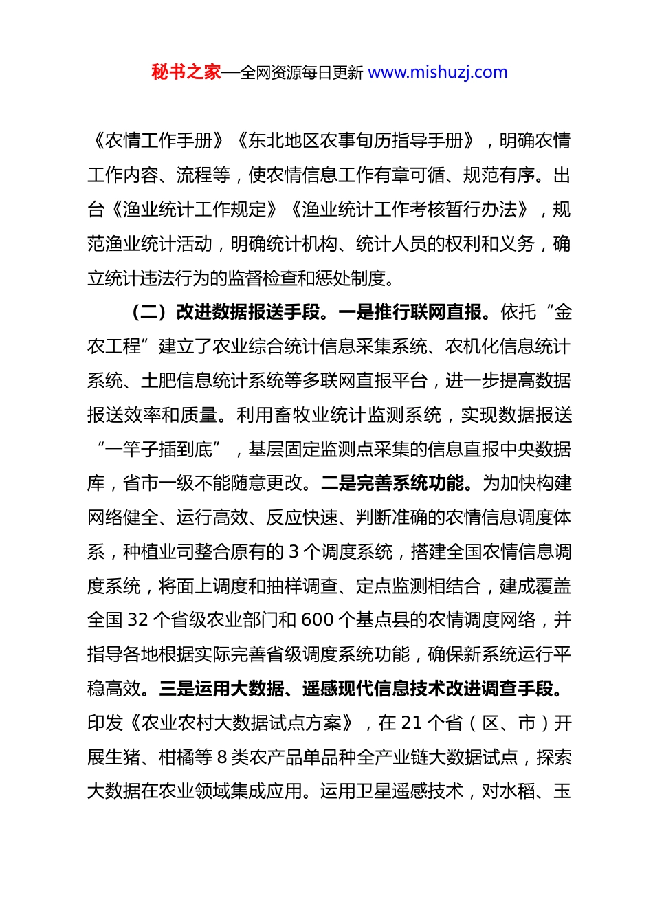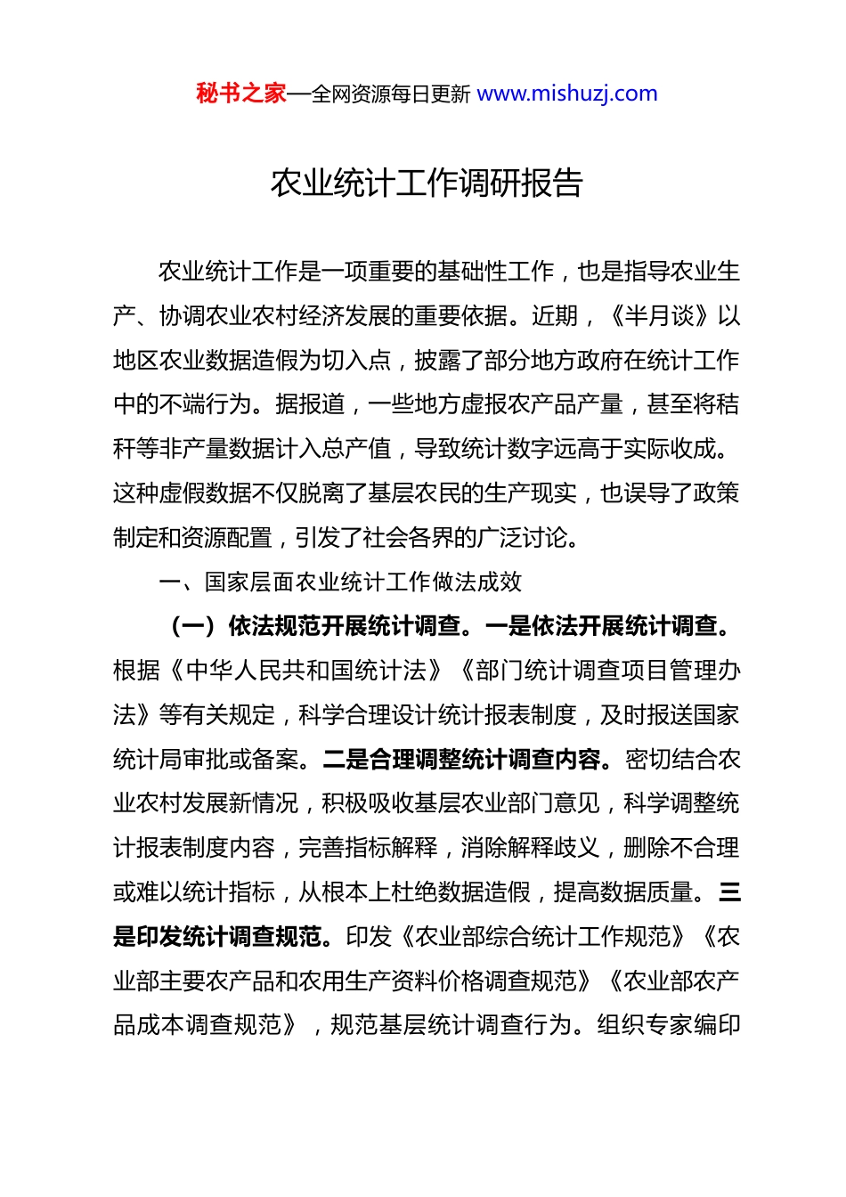 秘书之家—全网资源每日更新 www.mishuzj.com农业统计工作调研报告农业统计工作是一项重要的基础性工作,也是指导农业生产、协调农业农村经济发展的重要依据。近期,《半月谈》以地区农业数据造假为切入点,披露了部分地方政府在统计工作中的不端行为。据报道,一些地方虚报农产品产量,甚至将秸秆等非产量数据计入总产值,导致统计数字远高于实际收成。这种虚假数据不仅脱离了基层农民的生产现实,也误导了政策制定和资源配置,引发了社会各界的广泛讨论。一、国家层面农业统计工作做法成效(一)依法规范开展统计调查。一是依法开展统计调查。根据《中华人民共和国统计法》《部门统计调查项目管理办法》等有关规定,科学合理设计统计报表制度,及时报送国家统计局审批或备案。二是合理调整统计调查内容。密切结合农业农村发展新情况,积极吸收基层农业部门意见,科学调整统计报表制度内容,完善指标解释,消除解释歧义,删除不合理或难以统计指标,从根本上杜绝数据造假,提高数据质量。三是印发统计调查规范。印发《农业部综合统计工作规范》《农业部主要农产品和农用生产资料价格调查规范》《农业部农产品成本调查规范》,规范基层统计调查行为。组织专家编印秘书之家—全网资源每日更新 www.mishuzj.com《农情工作手册》《东北地区农事旬历指导手册》,明确农情工作内容、流程等,使农情信息工作有章可循、规范有序。出台《渔业统计工作规定》《渔业统计工作考核暂行办法》,规范渔业统计活动,明确统计机构、统计人员的权利和义务,确立统计违法行为的监督检查和惩处制度。 (二)改进数据报送手段。一是推行联网直报。依托“金农工程”建立了农业综合统计信息采集系统、农机化信息统计系统、土肥信息统计系统等多联网直报平台,进一步提高数据报送效率和质量。利用畜牧业统计监测系统,实现数据报送“一竿子插到底”,基层固定监测点采集的信息直报中央数据库,省市一级不能随意更改。二是完善系统功能。为加快构建网络健全、运行高效、反应快速、判断准确的农情信息调度体系,种植业司整合原有的 3 个调度系统,搭建全国农情信息调度系统,将面上调度和抽样调查、定点监测相结合,建成覆盖全国 32 个省级农业部门和 600 个基点县的农情调度网络,并指导各地根据实际完善省级调度系统功能,确保新系统运行平稳高效。三是运用大数据、遥感现代信息技术改进调查手段。印发《农业农村大数据试点方案》,在 21 个省(区、市)开展生猪、柑橘等 8 类农产品单品种全产业链大数据试点,探索大数据在农业领域集成应用。运用卫星遥感技术,对水稻、玉秘书之家—全网资源每日更新 www.mishuzj.com米、棉花等 5 大作物长势、产量及灾情和土壤墒情等进行监测,提高决策精准化、科学化。 (三)加强数据质量审核和监督检查。一是明确专人审核数据,明确专人负责农经统计数据审核,建立由统计人员与各业务处室双把关的审核机制,发现错误数据退回修正,发现异动数据要求各省提交异动说明,力求数据能够真实、准确地反映农村经营管理各方面情况。探索建立统计专家团队,抽调省级统计骨干组成专家团队,集中审核数据。二是实行交叉审核,验证上报数据的准确性。三是开展数据质量督查。渔业局按照《中华人民共和国统计法》《渔业统计工作规定》要求,定期组织开展渔业统计监督检查,重点检查渔业统计工作保障、制度建设、工作开展以及组织纪律等情况,确保渔业统计工作依法依规开展,维护渔业统计数据的严肃性和权威性,为渔业转方式调结构提供更加有力的数据支撑。 (四)积极探索“三新”统计。随着农村一二三产业不断融合发展,新产业新业态新商业模式不断涌现,2015 年开展休闲渔业发展监测指标体系研究,2016 年建立休闲渔业发展监测报表,2017 年正式开展休闲渔业发展情况监测,首次将休闲渔业发展状况结构化、量化,为全面反映渔业转型升级和转方式调结构成效提供重要支撑。 秘书之家—全网资源每日更新 www.mishuzj.com(五)加强队伍建设。加强统计人员业务培训和工作考核,不断强化队伍支撑。每年安排农经统计培训班,邀请专家对土地制度改革情况、集体产权...