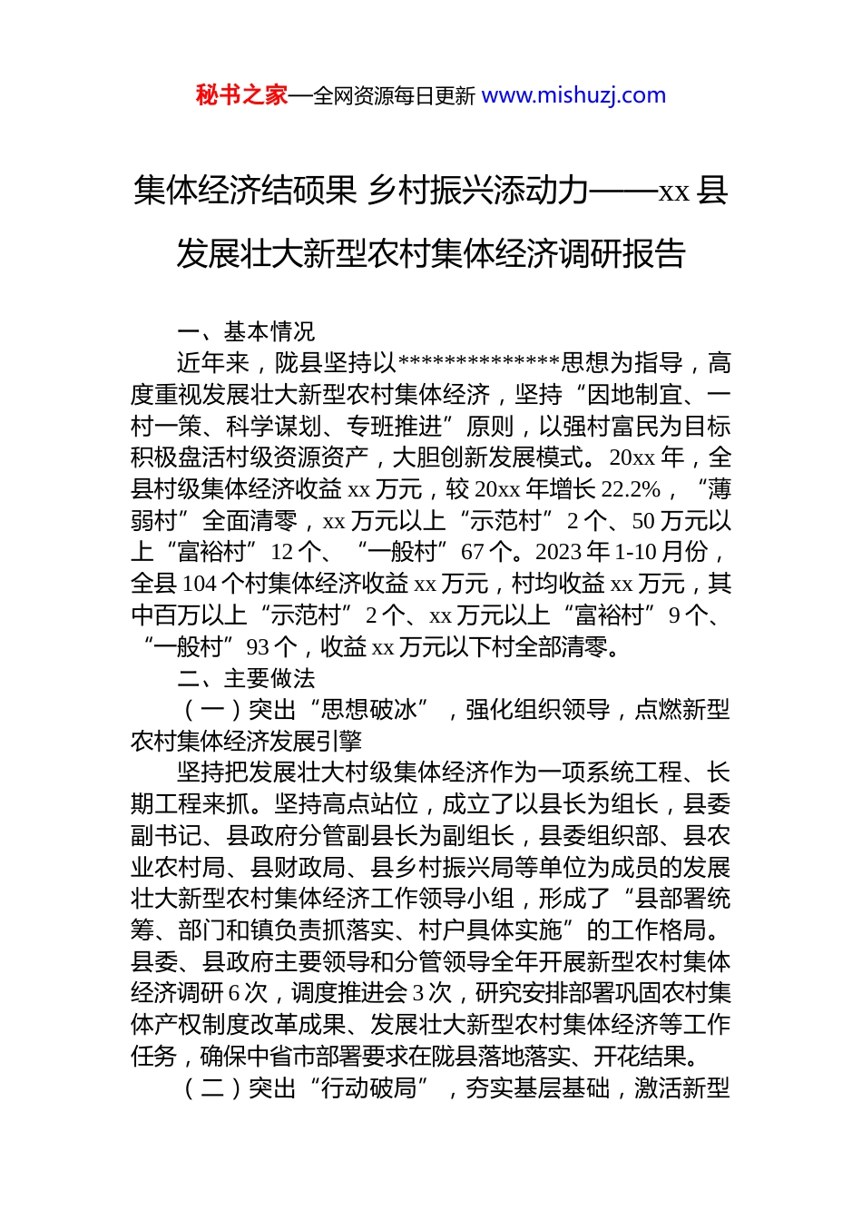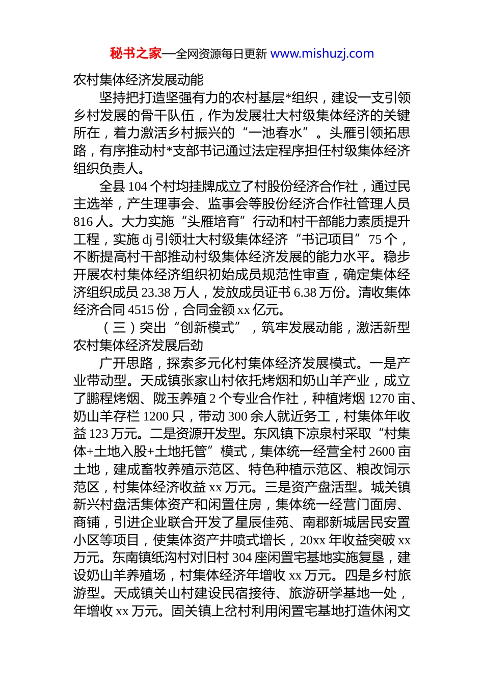 秘书之家—全网资源每日更新 www.mishuzj.com集体经济结硕果 乡村振兴添动力——xx 县发展壮大新型农村集体经济调研报告一、基本情况近年来,陇县坚持以**************思想为指导,高度重视发展壮大新型农村集体经济,坚持“因地制宜、一村一策、科学谋划、专班推进”原则,以强村富民为目标积极盘活村级资源资产,大胆创新发展模式。20xx 年,全县村级集体经济收益 xx 万元,较 20xx 年增长 22.2%,“薄弱村”全面清零,xx 万元以上“示范村”2 个、50 万元以上“富裕村”12 个、“一般村”67 个。2023 年 1-10 月份,全县 104 个村集体经济收益 xx 万元,村均收益 xx 万元,其中百万以上“示范村”2 个、xx 万元以上“富裕村”9 个、“一般村”93 个,收益 xx 万元以下村全部清零。二、主要做法(一)突出“思想破冰”,强化组织领导,点燃新型农村集体经济发展引擎坚持把发展壮大村级集体经济作为一项系统工程、长期工程来抓。坚持高点站位,成立了以县长为组长,县委副书记、县政府分管副县长为副组长,县委组织部、县农业农村局、县财政局、县乡村振兴局等单位为成员的发展壮大新型农村集体经济工作领导小组,形成了“县部署统筹、部门和镇负责抓落实、村户具体实施”的工作格局。县委、县政府主要领导和分管领导全年开展新型农村集体经济调研 6 次,调度推进会 3 次,研究安排部署巩固农村集体产权制度改革成果、发展壮大新型农村集体经济等工作任务,确保中省市部署要求在陇县落地落实、开花结果。(二)突出“行动破局”,夯实基层基础,激活新型秘书之家—全网资源每日更新 www.mishuzj.com农村集体经济发展动能坚持把打造坚强有力的农村基层*组织,建设一支引领乡村发展的骨干队伍,作为发展壮大村级集体经济的关键所在,着力激活乡村振兴的“一池春水”。头雁引领拓思路,有序推动村*支部书记通过法定程序担任村级集体经济组织负责人。全县 104 个村均挂牌成立了村股份经济合作社,通过民主选举,产生理事会、监事会等股份经济合作社管理人员816 人。大力实施“头雁培育”行动和村干部能力素质提升工程,实施 dj 引领壮大村级集体经济“书记项目”75 个,不断提高村干部推动村级集体经济发展的能力水平。稳步开展农村集体经济组织初始成员规范性审查,确定集体经济组织成员 23.38 万人,发放成员证书 6.38 万份。清收集体经济合同 4515 份,合同金额 xx 亿元。(三)突出“创新模式”,筑牢发展动能,激活新型农村集体经济发展后劲广开思路,探索多元化村集体经济发展模式。一是产业带动型。天成镇张家山村依托烤烟和奶山羊产业,成立了鹏程烤烟、陇玉养殖 2 个专业合作社,种植烤烟 1270 亩、奶山羊存栏 1200 只,带动 300 余人就近务工,村集体年收益 123 万元。二是资源开发型。东风镇下凉泉村采取“村集体+土地入股+土地托管”模式,集体统一经营全村 2600 亩土地,建成畜牧养殖示范区、特色种植示范区、粮改饲示范区,村集体经济收益 xx 万元。三是资产盘活型。城关镇新兴村盘活集体资产和闲置住房,集体统一经营门面房、商铺,引进企业联合开发了星辰佳苑、南郡新城居民安置小区等项目,使集体资产井喷式增长,20xx 年收益突破 xx万元。东南镇纸沟村对旧村 304 座闲置宅基地实施复垦,建设奶山羊养殖场,村集体经济年增收 xx 万元。四是乡村旅游型。天成镇关山村建设民宿接待、旅游研学基地一处,年增收 xx 万元。固关镇上岔村利用闲置宅基地打造休闲文秘书之家—全网资源每日更新 www.mishuzj.com化露营地,实现村集体经济增收 xx 万元。五是股份合作型。曹家湾镇流渠村整合村级 260 亩土地资源,争取产业扶贫等资金 xx 万元,入股到佳元香菇农民专业合作社,约定保底分红,经入股分红每年可收益 xx 万元。(四)突出“机制破障”,压实工作责任,凝聚新型农村集体经济发展合力注重发挥考核奖惩指挥棒作用,着力增强农村*组织的战斗力和凝聚力。强化责任链条化,拧紧“压力阀”,建立县委副书记主导、分管副县长主推、镇和部门主抓、村*支部书记主攻的责任联抓机制。考核精准化...