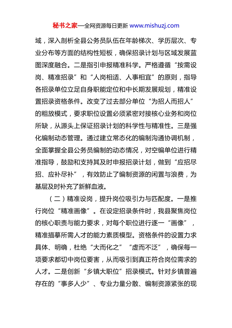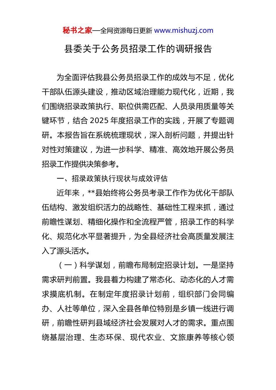 秘书之家—全网资源每日更新 www.mishuzj.com县委关于公务员招录工作的调研报告 为全面评估我县公务员招录工作的成效与不足,优化干部队伍源头建设,推动区域治理能力现代化,近期,我们围绕招录政策执行、职位供需匹配、人员录用质量等关键环节,结合 2025 年度招录工作的实践,开展了专题调研。本报告旨在系统梳理现状,深入剖析问题,并提出针对性对策建议,为进一步科学、精准、高效地开展公务员招录工作提供决策参考。一、招录政策执行现状与成效评估近年来,**县始终将公务员考录工作作为优化干部队伍结构、激发组织活力的战略性、基础性工程来抓,通过前瞻性谋划、精细化操作和全流程严管,招录工作的科学化、规范化水平显著提升,为全县经济社会高质量发展注入了源头活水。(一)科学谋划,前瞻布局制定招录计划。一是坚持需求研判前置。我县着力构建了常态化、动态化的人才需求摸底机制。在制定年度招录计划前,组织部门会同编办、人社等单位,深入全县各单位特别是乡镇一线进行调研,前瞻性研判县域经济社会发展对人才的需求。重点围绕基层治理、生态环保、现代农业、文旅康养等核心领秘书之家—全网资源每日更新 www.mishuzj.com域,深入剖析全县公务员队伍在年龄梯次、学历层次、专业分布等方面的结构性短板,确保招录计划与区域发展蓝图深度融合。二是指引申报精准科学。严格遵循“按需设岗、精准招录”和“人岗相适、人事相宜”的原则,指导各招录单位立足自身职能定位和中长期发展规划,精准设置招录资格条件。改变了过去部分单位“为招人而招人”的粗放模式,要求职位设置必须紧密对接核心业务和岗位所缺,从源头上保证招录计划的科学性与精准性。三是强化编制动态管理。通过建立常态化的编制沟通协调机制,全面掌握全县公务员编制的动态情况,对空编单位进行精准指导,鼓励和支持其及时申报招录计划,做到“应招尽招、应补尽补”,有效防止了编制资源的闲置与浪费,为基层及时补充了新鲜血液。(二)精准设岗,提升岗位吸引力与匹配度。一是推行岗位“精准画像”。在设定招录条件时,我县聚焦岗位的核心职责与能力要求,对每个职位进行逐一“画像”,精准描摹所需人才的能力素质模型。资格条件的设置力求具体、明确,杜绝“大而化之”“虚而不泛”,确保每一项要求都切中岗位要害,从而吸引到真正符合岗位需求的人才。二是创新“乡镇大职位”招录模式。针对乡镇普遍存在的“事多人少”、专业力量分散、编制资源紧张的现秘书之家—全网资源每日更新 www.mishuzj.com实困境,我县打破了过去按具体下属站所设置岗位的传统限制,创新采用了“乡镇大职位”的招录模式。该模式围绕基层治理、乡村振兴、民生服务等共性核心职能,整合设置综合性岗位,不限具体专业,或设置宽口径专业要求,有效盘活了编制资源,拓宽了选人视野。这种模式招录的人员具有更强的综合协调能力和岗位适应性,进入乡镇后能够更快地融入多岗位工作。三是建立适配度评估反馈机制。为形成招录工作的闭环管理,我县健全了岗位适配度评估纪实机制。通过持续跟踪新录用公务员试用期的表现,结合其年度考核、群众评议和个人述职,综合评估其履职成效与人岗匹配度。评估结果不仅作为个人转正定级的重要依据,更作为关键数据反哺下一年度的招录工作,为优化招录计划和调整岗位设置提供了科学、客观的数据支撑。(三)严格程序,确保招录公平与人员质量。一是严守资格审查关口。在资格审查阶段,我县始终坚持“一把尺子量到底”,严格对标政策规定。审查小组实行“组工骨干+业务专干”的配置模式,并采用“双人交叉审核+组长复核”的工作机制,对报考者的学历、专业、工作经历等关键信息进行逐项核对。对存在疑点的材料,坚持追溯源头,确保报考资格的真实性、合规性,从入口处筑牢秘书之家—全网资源每日更新 www.mishuzj.com“防火墙”。二是深化录用考察维度。在考察环节,我县构建了“政治素质+现实表现+综合风险”的三维考察体系。考察组由经验丰富的科级领导干部带队,深入考察对象所在单位、学校、社区,通过查阅档案、个别谈话、实地走访等多种方式,全面了解其政治立场、道德品行、履职能...