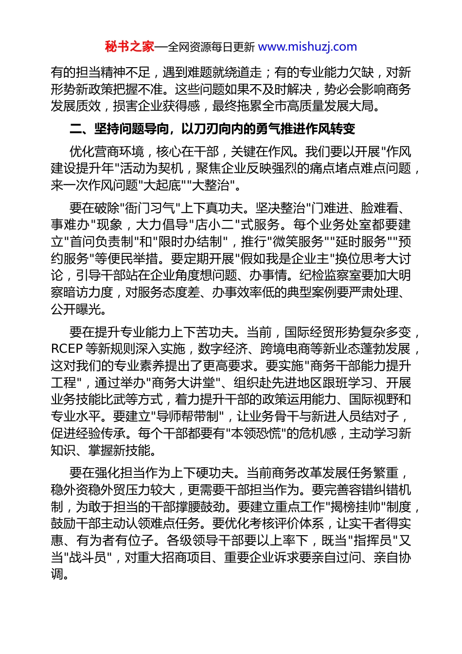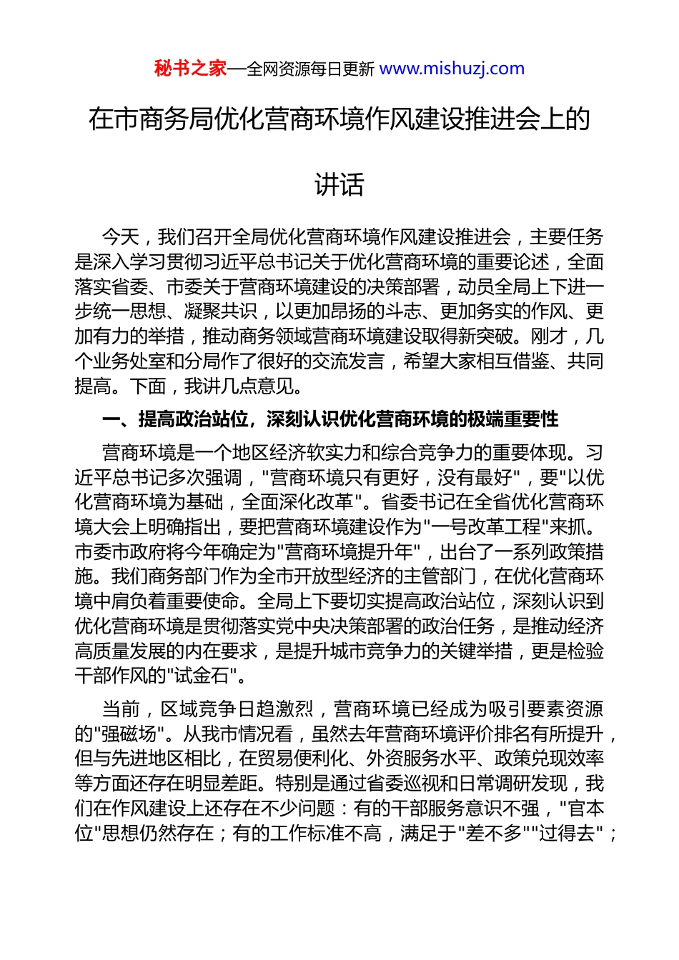 秘书之家—全网资源每日更新 www.mishuzj.com在市商务局优化营商环境作风建设推进会上的讲话今天,我们召开全局优化营商环境作风建设推进会,主要任务是深入学习贯彻习近平总书记关于优化营商环境的重要论述,全面落实省委、市委关于营商环境建设的决策部署,动员全局上下进一步统一思想、凝聚共识,以更加昂扬的斗志、更加务实的作风、更加有力的举措,推动商务领域营商环境建设取得新突破。刚才,几个业务处室和分局作了很好的交流发言,希望大家相互借鉴、共同提高。下面,我讲几点意见。一、提高政治站位,深刻认识优化营商环境的极端重要性营商环境是一个地区经济软实力和综合竞争力的重要体现。习近平总书记多次强调,"营商环境只有更好,没有最好",要"以优化营商环境为基础,全面深化改革"。省委书记在全省优化营商环境大会上明确指出,要把营商环境建设作为"一号改革工程"来抓。市委市政府将今年确定为"营商环境提升年",出台了一系列政策措施。我们商务部门作为全市开放型经济的主管部门,在优化营商环境中肩负着重要使命。全局上下要切实提高政治站位,深刻认识到优化营商环境是贯彻落实党中央决策部署的政治任务,是推动经济高质量发展的内在要求,是提升城市竞争力的关键举措,更是检验干部作风的"试金石"。当前,区域竞争日趋激烈,营商环境已经成为吸引要素资源的"强磁场"。从我市情况看,虽然去年营商环境评价排名有所提升,但与先进地区相比,在贸易便利化、外资服务水平、政策兑现效率等方面还存在明显差距。特别是通过省委巡视和日常调研发现,我们在作风建设上还存在不少问题:有的干部服务意识不强,"官本位"思想仍然存在;有的工作标准不高,满足于"差不多""过得去";秘书之家—全网资源每日更新 www.mishuzj.com有的担当精神不足,遇到难题就绕道走;有的专业能力欠缺,对新形势新政策把握不准。这些问题如果不及时解决,势必会影响商务发展质效,损害企业获得感,最终拖累全市高质量发展大局。二、坚持问题导向,以刀刃向内的勇气推进作风转变优化营商环境,核心在干部,关键在作风。我们要以开展"作风建设提升年"活动为契机,聚焦企业反映强烈的痛点堵点难点问题,来一次作风问题"大起底""大整治"。要在破除"衙门习气"上下真功夫。坚决整治"门难进、脸难看、事难办"现象,大力倡导"店小二"式服务。每个业务处室都要建立"首问负责制"和"限时办结制",推行"微笑服务""延时服务""预约服务"等便民举措。要定期开展"假如我是企业主"换位思考大讨论,引导干部站在企业角度想问题、办事情。纪检监察室要加大明察暗访力度,对服务态度差、办事效率低的典型案例要严肃处理、公开曝光。要在提升专业能力上下苦功夫。当前,国际经贸形势复杂多变,RCEP 等新规则深入实施,数字经济、跨境电商等新业态蓬勃发展,这对我们的专业素养提出了更高要求。要实施"商务干部能力提升工程",通过举办"商务大讲堂"、组织赴先进地区跟班学习、开展业务技能比武等方式,着力提升干部的政策运用能力、国际视野和专业水平。要建立"导师帮带制",让业务骨干与新进人员结对子,促进经验传承。每个干部都要有"本领恐慌"的危机感,主动学习新知识、掌握新技能。要在强化担当作为上下硬功夫。当前商务改革发展任务繁重,稳外资稳外贸压力较大,更需要干部担当作为。要完善容错纠错机制,为敢于担当的干部撑腰鼓劲。要建立重点工作"揭榜挂帅"制度,鼓励干部主动认领难点任务。要优化考核评价体系,让实干者得实惠、有为者有位子。各级领导干部要以上率下,既当"指挥员"又当"战斗员",对重大招商项目、重要企业诉求要亲自过问、亲自协调。秘书之家—全网资源每日更新 www.mishuzj.com要在创新服务方式上下巧功夫。数字化转型是提升服务效能的必由之路。要加快推进"智慧商务"建设,年内要实现外贸备案、展会补贴等高频事项"一网通办"。要开发商务政策"计算器"小程序,让企业一键查询可享受的政策红利。要建立重点企业"一对一"线上服务平台,实现诉求直通、政策直达。要运用大数据分析企业需求,提供精准化、个性化服务。三、聚焦关键环节,以务实举措推动营商环境持续优化作风建设不能空...