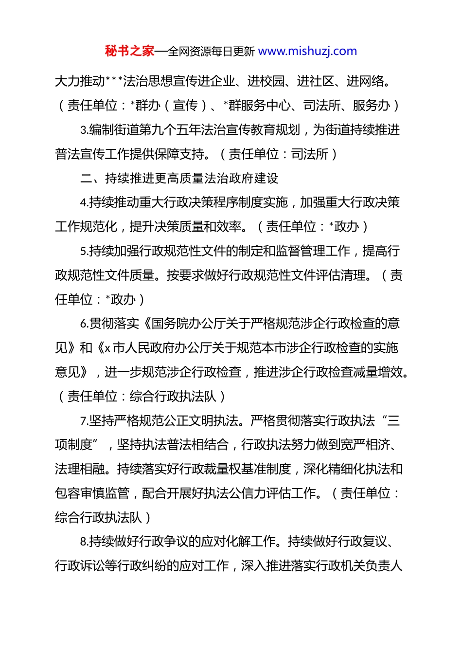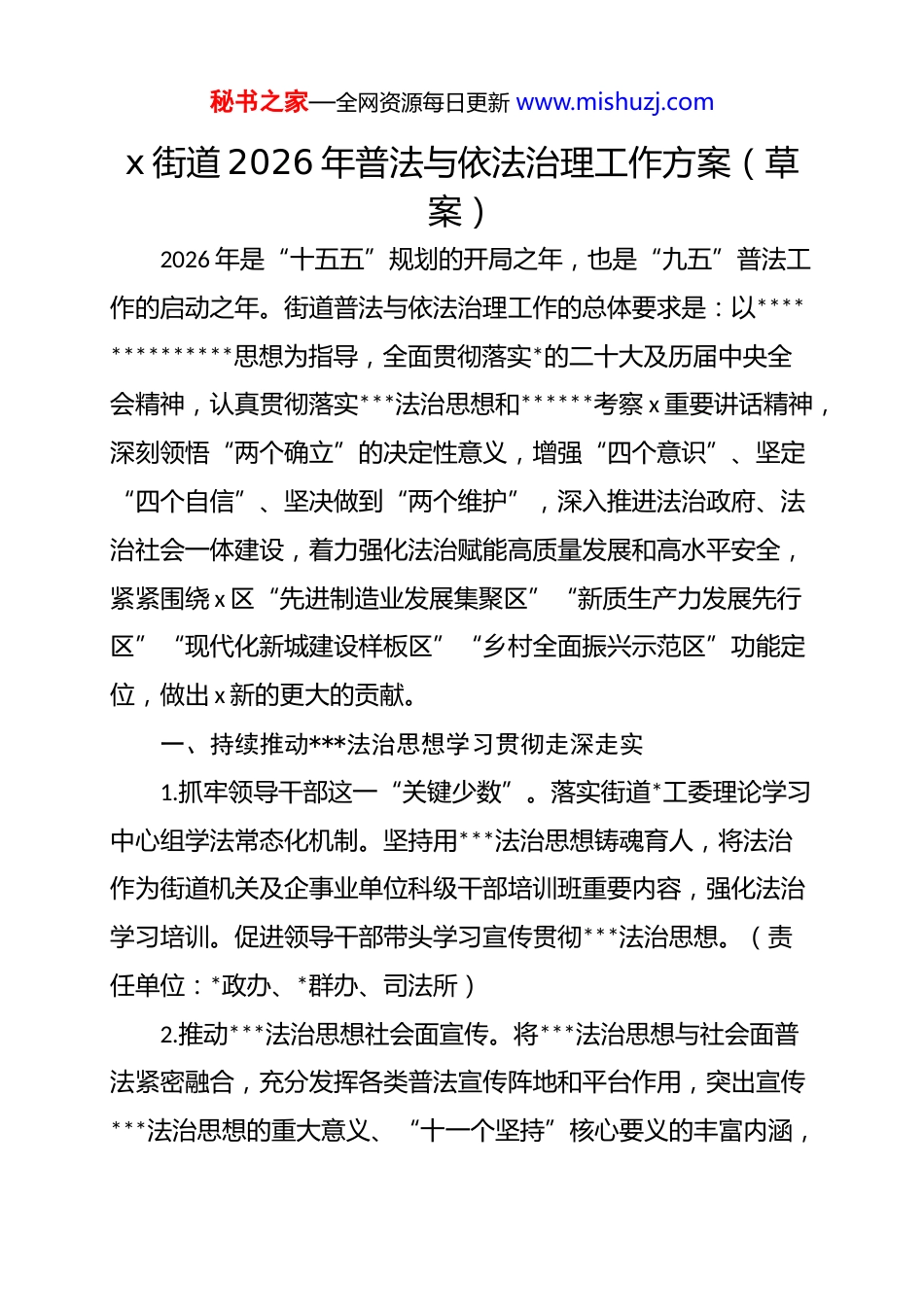 秘书之家—全网资源每日更新 www.mishuzj.comx 街道 2026 年普法与依法治理工作方案(草案)2026 年是“十五五”规划的开局之年,也是“九五”普法工作的启动之年。街道普法与依法治理工作的总体要求是:以**************思想为指导,全面贯彻落实*的二十大及历届中央全会精神,认真贯彻落实***法治思想和******考察 x 重要讲话精神,深刻领悟“两个确立”的决定性意义,增强“四个意识”、坚定“四个自信”、坚决做到“两个维护”,深入推进法治政府、法治社会一体建设,着力强化法治赋能高质量发展和高水平安全,紧紧围绕 x 区“先进制造业发展集聚区”“新质生产力发展先行区”“现代化新城建设样板区”“乡村全面振兴示范区”功能定位,做出 x 新的更大的贡献。一、持续推动***法治思想学习贯彻走深走实1.抓牢领导干部这一“关键少数”。落实街道*工委理论学习中心组学法常态化机制。坚持用***法治思想铸魂育人,将法治作为街道机关及企事业单位科级干部培训班重要内容,强化法治学习培训。促进领导干部带头学习宣传贯彻***法治思想。(责任单位:*政办、*群办、司法所)2.推动***法治思想社会面宣传。将***法治思想与社会面普法紧密融合,充分发挥各类普法宣传阵地和平台作用,突出宣传***法治思想的重大意义、“十一个坚持”核心要义的丰富内涵,秘书之家—全网资源每日更新 www.mishuzj.com大力推动***法治思想宣传进企业、进校园、进社区、进网络。(责任单位:*群办(宣传)、*群服务中心、司法所、服务办)3.编制街道第九个五年法治宣传教育规划,为街道持续推进普法宣传工作提供保障支持。(责任单位:司法所)二、持续推进更高质量法治政府建设4.持续推动重大行政决策程序制度实施,加强重大行政决策工作规范化,提升决策质量和效率。(责任单位:*政办)5.持续加强行政规范性文件的制定和监督管理工作,提高行政规范性文件质量。按要求做好行政规范性文件评估清理。(责任单位:*政办)6.贯彻落实《国务院办公厅关于严格规范涉企行政检查的意见》和《x 市人民政府办公厅关于规范本市涉企行政检查的实施意见》,进一步规范涉企行政检查,推进涉企行政检查减量增效。(责任单位:综合行政执法队)7.坚持严格规范公正文明执法。严格贯彻落实行政执法“三项制度”,坚持执法普法相结合,行政执法努力做到宽严相济、法理相融。持续落实好行政裁量权基准制度,深化精细化执法和包容审慎监管,配合开展好执法公信力评估工作。(责任单位:综合行政执法队)8.持续做好行政争议的应对化解工作。持续做好行政复议、行政诉讼等行政纠纷的应对工作,深入推进落实行政机关负责人秘书之家—全网资源每日更新 www.mishuzj.com出庭、旁听、讲评“三合一”工作,推动行政争议的实质性化解。(责任单位:司法所,各部门、各单位)三、全面深入推进法治社会建设9.结合宪法宣传周、民法典宣传月等重要时间节点,开展宪法、民法典等主题法治宣传教育活动。持续开展普法大讲堂活动,进一步加强*内法规学习宣传力度。(责任单位:dj 办(宣传),司法所)10.持续深化社区“1 名法律顾问+n 名法律明白人”工作,持续加强“法治带头人”和“法律明白人”培育,不断提升“法治带头人”“法律明白人”的法治素养。(责任单位:司法所)11.不断深化基层法治观察建议工作,持续优化基层立法联系点建设,配合开展好法治为民办实事项目征集,切实提升法治工作的亲民性。(责任单位:人大工委、司法所)12.持续优化公共法律服务供给。加强街道公共法律服务站、社区公共法律服务室和九里工坊公共法律服务工作点建设,继续做深公共法律服务融入“15 分钟社区服务圈”,切实服务好各类主体。(责任单位:司法所)13.不断优化法治化营商环境。精准回应企业经营法治需求,配合开展落实好“律政护航 g60”活动和“法治体检”,指导企业完善法律风险防范应对机制。(责任单位:司法所)14.深入推进矛盾纠纷多元化解。为“三所联动”矛盾纠纷化秘书之家—全网资源每日更新 www.mishuzj.com解机制有效运作提供坚实保障,深入开展社会矛盾纠纷排查,持续提升解纷“一件事”平台服务效能。持...