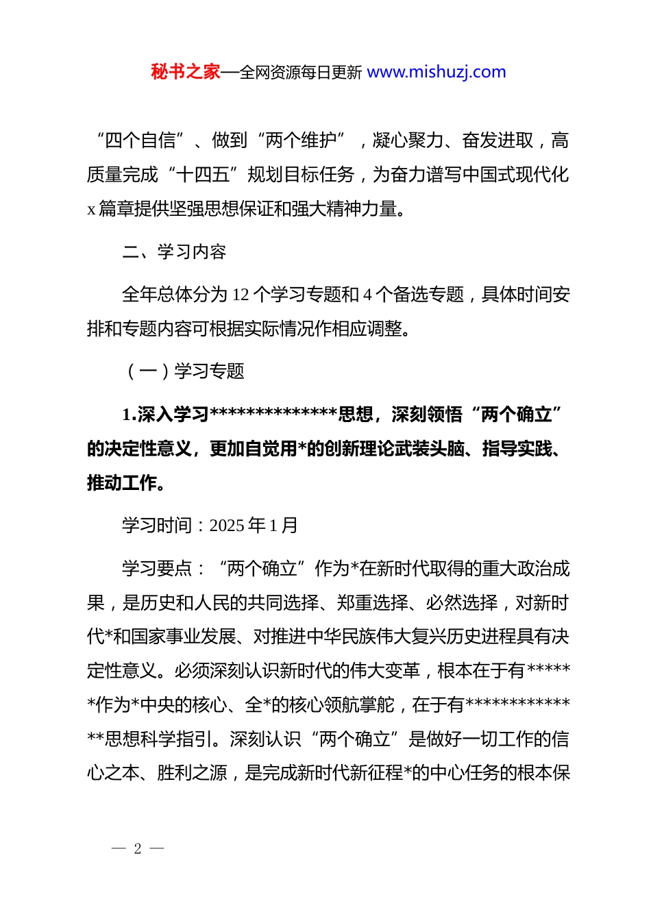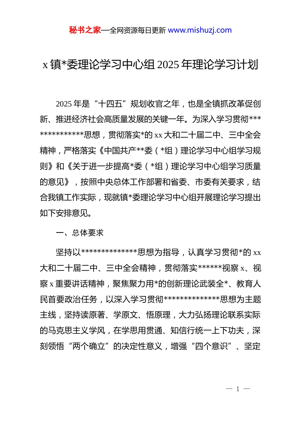 秘书之家—全网资源每日更新 www.mishuzj.comx 镇*委理论学习中心组 2025 年理论学习计划2025 年是“十四五”规划收官之年,也是全镇抓改革促创新、推进经济社会高质量发展的关键一年。为深入学习贯彻**************思想,贯彻落实*的 xx 大和二十届二中、三中全会精神,严格落实《中国共产**委(*组)理论学习中心组学习规则》和《关于进一步提高*委(*组)理论学习中心组学习质量的意见》,按照中央总体工作部署和省委、市委有关要求,结合我镇工作实际,现就镇*委理论学习中心组开展理论学习提出如下安排意见。一、总体要求坚持以**************思想为指导,认真学习贯彻*的 xx大和二十届二中、三中全会精神,贯彻落实******视察 x、视察 x 重要讲话精神,聚焦聚力用*的创新理论武装全*、教育人民首要政治任务,以深入学习贯彻**************思想为主题主线,坚持读原著、学原文、悟原理,大力弘扬理论联系实际的马克思主义学风,在学思用贯通、知信行统一上下功夫,深刻领悟“两个确立”的决定性意义,增强“四个意识”、坚定— 1 —秘书之家—全网资源每日更新 www.mishuzj.com“四个自信”、做到“两个维护”,凝心聚力、奋发进取,高质量完成“十四五”规划目标任务,为奋力谱写中国式现代化x 篇章提供坚强思想保证和强大精神力量。二、学习内容全年总体分为 12 个学习专题和 4 个备选专题,具体时间安排和专题内容可根据实际情况作相应调整。(一)学习专题1.深入学习**************思想,深刻领悟“两个确立”的决定性意义,更加自觉用*的创新理论武装头脑、指导实践、推动工作。学习时间:2025 年 1 月学习要点:“两个确立”作为*在新时代取得的重大政治成果,是历史和人民的共同选择、郑重选择、必然选择,对新时代*和国家事业发展、对推进中华民族伟大复兴历史进程具有决定性意义。必须深刻认识新时代的伟大变革,根本在于有******作为*中央的核心、全*的核心领航掌舵,在于有**************思想科学指引。深刻认识“两个确立”是做好一切工作的信心之本、胜利之源,是完成新时代新征程*的中心任务的根本保— 2 —秘书之家—全网资源每日更新 www.mishuzj.com证,对于我们应对各种风险挑战、推进中国式现代化建设具有决定性意义。要全面系统掌握**************思想的体系结构、内在逻辑以及各领域各部分理论观点的相互关系,深刻领会这一思想的世界观、方法论和贯穿其中的立场观点方法,坚持把学习贯彻不断向各领域各方面深化,不断提高政治判断力、政治领悟力、政治执行力,更加自觉在思想上政治上行动上同以***同志为核心的*中央保持高度一致。重点篇目:1.《***著作选读》《***谈治国理政》《**************思想专题摘编》《**************思想的世界观和方法论专题摘编》、***:《在二十届中央政治局第四次集体学习时的讲话》《开辟马克思主义中国化时代化新境界》等;2.《**************思想学习纲要》《**************思想学习问答》《**************思想三十讲》等。2.深入学习******关于全面深化改革的一系列新思想、新观点、新论断,以抓改革创新促高质量发展,奋力谱写中国式现代化 x 篇章。学习时间:2025 年 2 月学习要点:改革开放是*和人民事业大踏步赶上时代的重要— 3 —秘书之家—全网资源每日更新 www.mishuzj.com法宝,是决定当代中国命运的关键一招。必须深入学习领会******关于全面深化改革的一系列新思想、新观点、新论断,全面准确把握进一步全面深化改革的主题、重大原则、重大举措、根本保证,坚定扛牢“走在前、勇争先”的使命担当,牢牢把握“一个万亿、五个倍增”和加力实现“十个新突破”重点任务,努力把蓝图变为现实。自觉把改革摆在更加突出位置,紧紧围绕推进中国式现代化进一步全面深化改革,坚持解放思想、实事求是、与时俱进、求真务实,进一步解放和发展社会生产力、激发和增强社会活力,以经济体制改革为牵引,以促进社会公平正义、增进人民福祉为出发点和落脚点,更加注重系统集成、更加注重突出重点、更加注重改革实效,在进一步全面深化改革上当好排头兵。重点篇目:1.******在*的二十届...