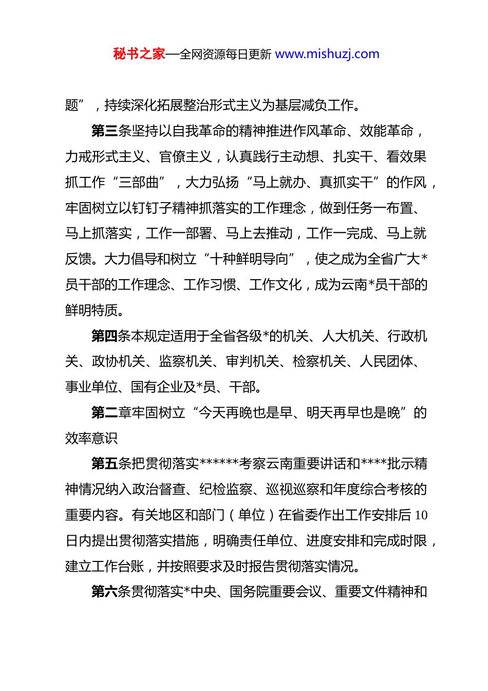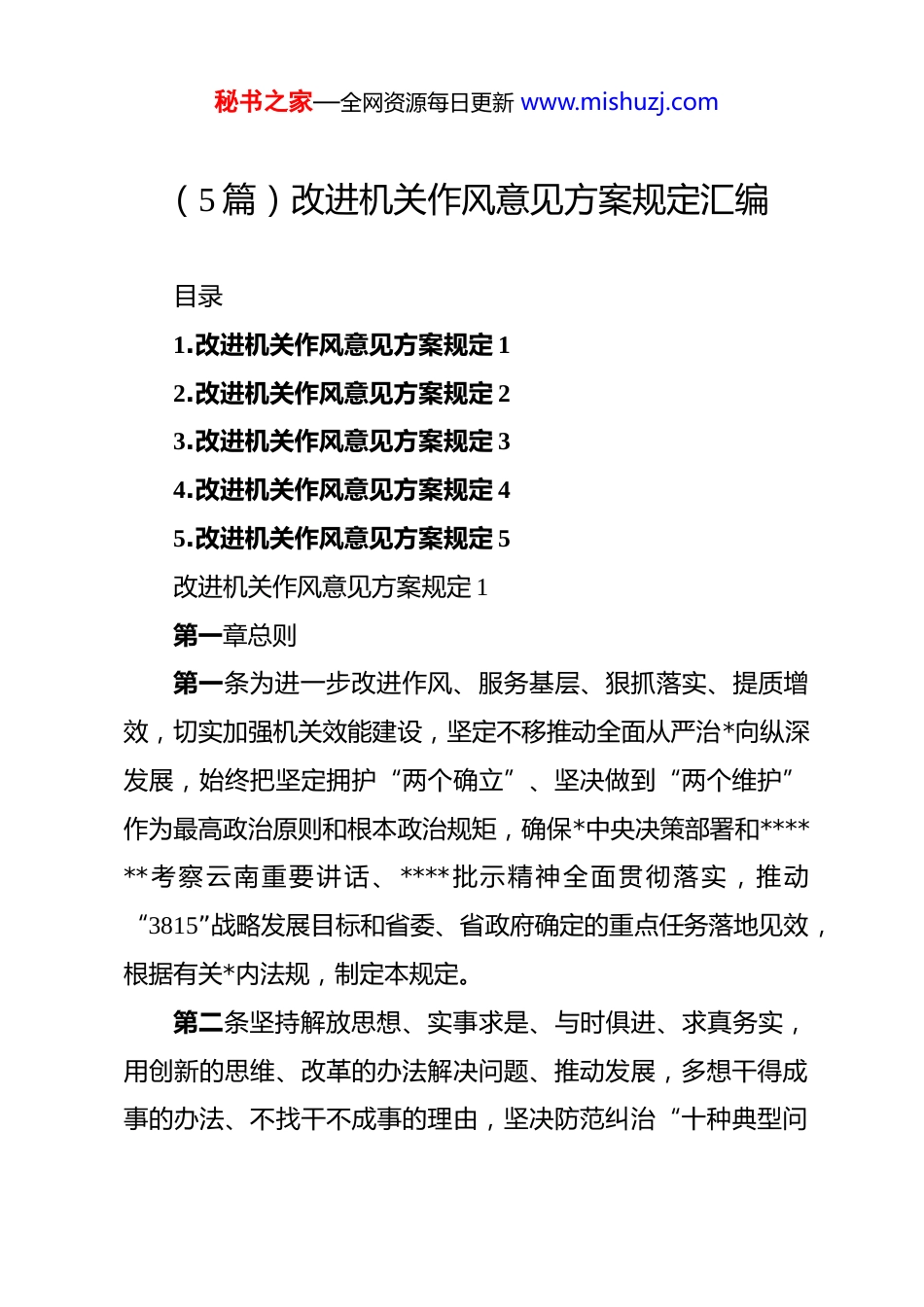 秘书之家—全网资源每日更新 www.mishuzj.com(5 篇)改进机关作风意见方案规定汇编目录1.改进机关作风意见方案规定 12.改进机关作风意见方案规定 23.改进机关作风意见方案规定 34.改进机关作风意见方案规定 45.改进机关作风意见方案规定 5改进机关作风意见方案规定 1第一章总则第一条为进一步改进作风、服务基层、狠抓落实、提质增效,切实加强机关效能建设,坚定不移推动全面从严治*向纵深发展,始终把坚定拥护“两个确立”、坚决做到“两个维护”作为最高政治原则和根本政治规矩,确保*中央决策部署和******考察云南重要讲话、****批示精神全面贯彻落实,推动“3815”战略发展目标和省委、省政府确定的重点任务落地见效,根据有关*内法规,制定本规定。第二条坚持解放思想、实事求是、与时俱进、求真务实,用创新的思维、改革的办法解决问题、推动发展,多想干得成事的办法、不找干不成事的理由,坚决防范纠治“十种典型问秘书之家—全网资源每日更新 www.mishuzj.com题”,持续深化拓展整治形式主义为基层减负工作。第三条坚持以自我革命的精神推进作风革命、效能革命,力戒形式主义、官僚主义,认真践行主动想、扎实干、看效果抓工作“三部曲”,大力弘扬“马上就办、真抓实干”的作风,牢固树立以钉钉子精神抓落实的工作理念,做到任务一布置、马上抓落实,工作一部署、马上去推动,工作一完成、马上就反馈。大力倡导和树立“十种鲜明导向”,使之成为全省广大*员干部的工作理念、工作习惯、工作文化,成为云南*员干部的鲜明特质。第四条本规定适用于全省各级*的机关、人大机关、行政机关、政协机关、监察机关、审判机关、检察机关、人民团体、事业单位、国有企业及*员、干部。第二章牢固树立“今天再晚也是早、明天再早也是晚”的效率意识第五条把贯彻落实******考察云南重要讲话和****批示精神情况纳入政治督查、纪检监察、巡视巡察和年度综合考核的重要内容。有关地区和部门(单位)在省委作出工作安排后 10日内提出贯彻落实措施,明确责任单位、进度安排和完成时限,建立工作台账,并按照要求及时报告贯彻落实情况。第六条贯彻落实*中央、国务院重要会议、重要文件精神和秘书之家—全网资源每日更新 www.mishuzj.com重大决策部署,有关地区和部门(单位)在省委、省政府作出工作安排后 20 日内提出贯彻落实措施,并按照要求报告贯彻落实情况。*中央、国务院文件要求制定配套文件的,在规定时限内制定;没有明确时限要求的,在 3 个月内制定,特殊情况可在半年内制定;省委办公厅、省政府办公厅建立*中央、国务院文件配套文件制定管理台账,每月梳理汇总 1 次落实情况。第七条贯彻落实省委、省政府工作安排,各地区各部门在1 个月内提出具体工作措施,并建立落实反馈机制,按照要求报告贯彻落实情况。省委、省政府重要文件发布后,牵头起草部门每年书面汇报 1 次落实情况,重要工作及时报告。第八条严格落实*内法规执行责任制,各地区各部门*委(*组)在职责范围内领导、组织、推进本地区本部门(本系统)*内法规执行工作,推动*内法规全面深入实施。建立健全*内法规和规范性文件实施评估制度,制定机关定期开展评估。第九条提高批办性、指导性批示件办理落实效率,有时限要求的,按照要求落实反馈;没有时限要求的,7 个工作日内落实反馈,特殊情况不超过 15 个工作日;紧急情况随到随办,及时反馈;情况复杂,在规定时限内未办结的,定期报告进展情况。第十条省委、省政府确定的重大建设项目,实行多评合一,秘书之家—全网资源每日更新 www.mishuzj.com全流程联审联办,建立省级重大项目清单制度,相关地区和部门全程跟踪协调、帮办代办。对项目立项、要素保障、规划施工、竣工验收等阶段的行政审批、中介服务、公共服务事项进行梳理,编制全流程落实计划表,倒排节点、挂图作战。第十一条发生重大突发事件,事发地*委、政府和相关部门要认真履行属地责任和部门责任,主要负责同志第一时间赶赴现场,及时果断处置。发生区域性、系统性问题时,主要负责同志要掌握全局、坐镇指挥,不顾此失彼。重大突发事件发生后,除极特殊情况外,事发地乡镇...