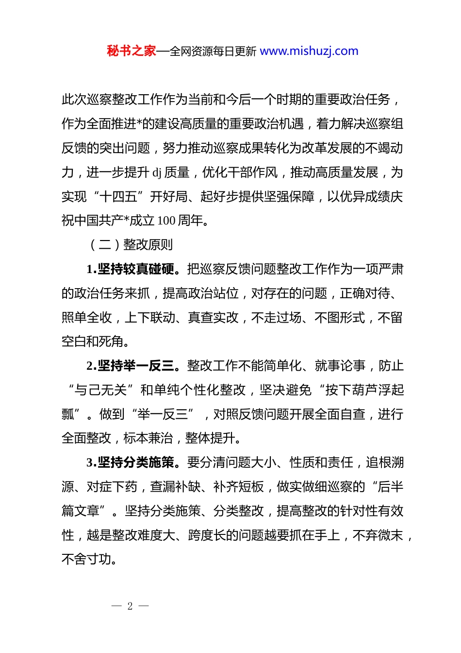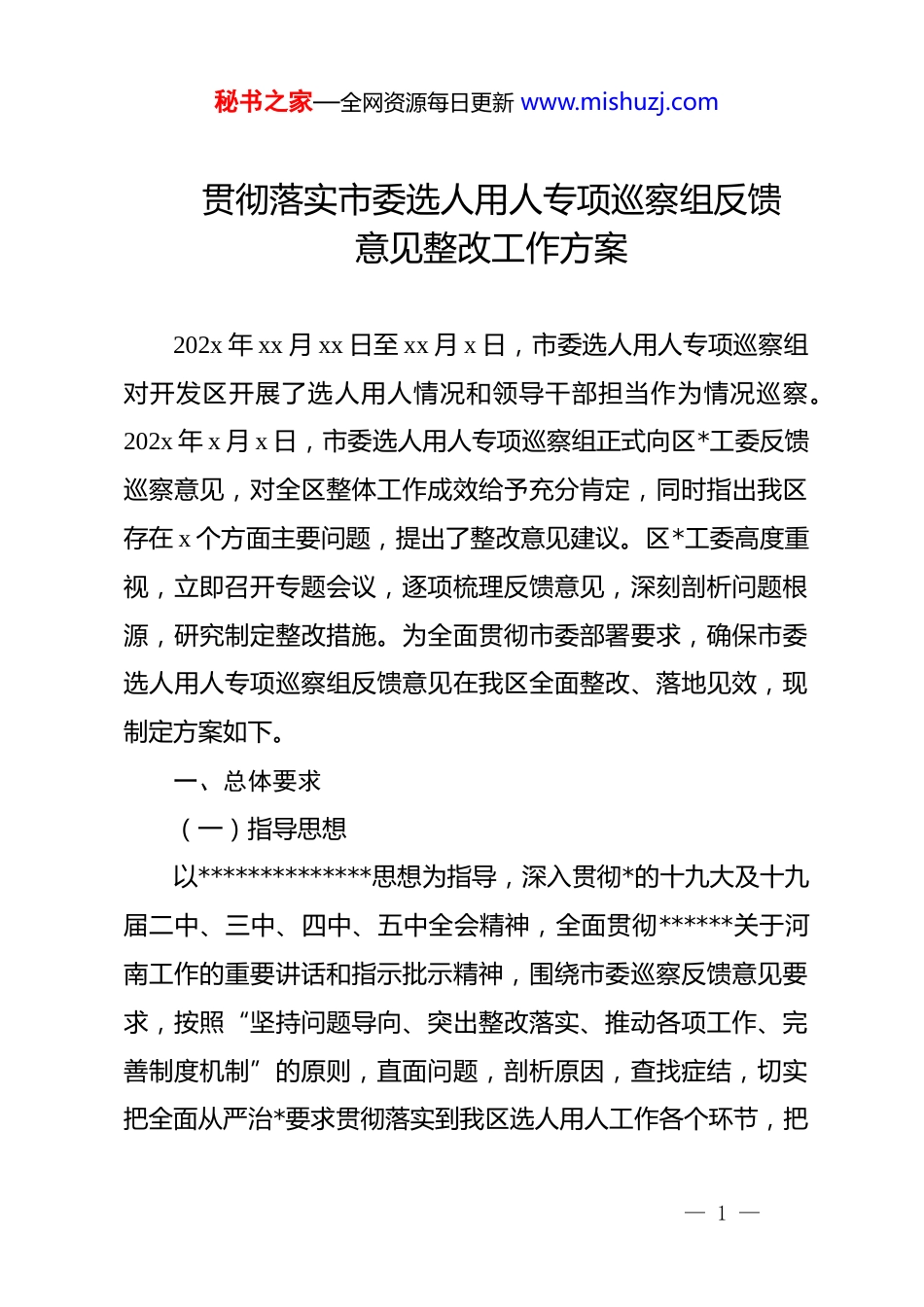 秘书之家—全网资源每日更新 www.mishuzj.com贯彻落实市委选人用人专项巡察组反馈意见整改工作方案202x 年 xx 月 xx 日至 xx 月 x 日,市委选人用人专项巡察组对开发区开展了选人用人情况和领导干部担当作为情况巡察。202x 年 x 月 x 日,市委选人用人专项巡察组正式向区*工委反馈巡察意见,对全区整体工作成效给予充分肯定,同时指出我区存在 x 个方面主要问题,提出了整改意见建议。区*工委高度重视,立即召开专题会议,逐项梳理反馈意见,深刻剖析问题根源,研究制定整改措施。为全面贯彻市委部署要求,确保市委选人用人专项巡察组反馈意见在我区全面整改、落地见效,现制定方案如下。一、总体要求(一)指导思想以**************思想为指导,深入贯彻*的十九大及十九届二中、三中、四中、五中全会精神,全面贯彻******关于河南工作的重要讲话和指示批示精神,围绕市委巡察反馈意见要求,按照“坚持问题导向、突出整改落实、推动各项工作、完善制度机制”的原则,直面问题,剖析原因,查找症结,切实把全面从严治*要求贯彻落实到我区选人用人工作各个环节,把— 1 —秘书之家—全网资源每日更新 www.mishuzj.com此次巡察整改工作作为当前和今后一个时期的重要政治任务,作为全面推进*的建设高质量的重要政治机遇,着力解决巡察组反馈的突出问题,努力推动巡察成果转化为改革发展的不竭动力,进一步提升 dj 质量,优化干部作风,推动高质量发展,为实现“十四五”开好局、起好步提供坚强保障,以优异成绩庆祝中国共产*成立 100 周年。(二)整改原则1.坚持较真碰硬。把巡察反馈问题整改工作作为一项严肃的政治任务来抓,提高政治站位,对存在的问题,正确对待、照单全收,上下联动、真查实改,不走过场、不图形式,不留空白和死角。2.坚持举一反三。整改工作不能简单化、就事论事,防止“与己无关”和单纯个性化整改,坚决避免“按下葫芦浮起瓢”。做到“举一反三”,对照反馈问题开展全面自查,进行全面整改,标本兼治,整体提升。3.坚持分类施策。要分清问题大小、性质和责任,追根溯源、对症下药,查漏补缺、补齐短板,做实做细巡察的“后半篇文章”。坚持分类施策、分类整改,提高整改的针对性有效性,越是整改难度大、跨度长的问题越要抓在手上,不弃微末,不舍寸功。— 2 —秘书之家—全网资源每日更新 www.mishuzj.com(三)整改目标。对整改反馈问题区分轻重缓急,能在集中整改期内整改的,全部整改到位;需要较长时间整改的,明确时间节点,限期整改到位;需要长期整改的,建立长效机制,持续抓好整改;瞄准问题做工作,克服弱项求提升。通过扎扎实实的整改,全面提高我区选人用人工作整体质量和水平。二、主要问题及整改措施整改工作采取自上而下、上下联动、一体推进的方式,从202x 年 x 月 xx 日至 x 月 xx 日,是集中整改时限,共分三个阶段进行。(一)动员部署阶段(202x 年 x 月 xx 日至 x 月 xx 日)区*工委召开专题会议学习贯彻落实市委 xx 巡察组反馈意见,并对整改落实工作进行研究部署;成立开发区选人用人专项整改工作领导小组及其办公室,研究出台《贯彻落实市委选人用人专项巡察组反馈意见整改工作方案》,并制定整改落实台账,明确工作责任、具体措施和时间节点;区*工委召开巡察整改专题民主生活会,会前,将班子和个人对照检查材料报市委 xx 巡察组审核把关。(二)集中整改阶段(202x 年 x 月 xx 日至 x 月 xx 日)1 月 xx 日前,区*工委印发《贯彻落实市委选人用人专项巡察组反馈意见整改工作方案》,并报市委巡察办、市纪委监委、— 3 —秘书之家—全网资源每日更新 www.mishuzj.com市委组织部相关科室。各单位根据《贯彻落实市委选人用人专项巡察组反馈意见整改工作方案》,结合各自实际认真查找存在的问题,完善修改各自的整改工作方案、工作台账;在此基础上建立任务清单,明确目标任务、整改措施、完成时限,积极开展整改。x 月 xx 日前,各乡(镇、办)*(工)委、区直各单位*组织召开巡察一体整改专题民主生活会。区*工委选人用人专项整改工作领导小组适时召开阶段性整...