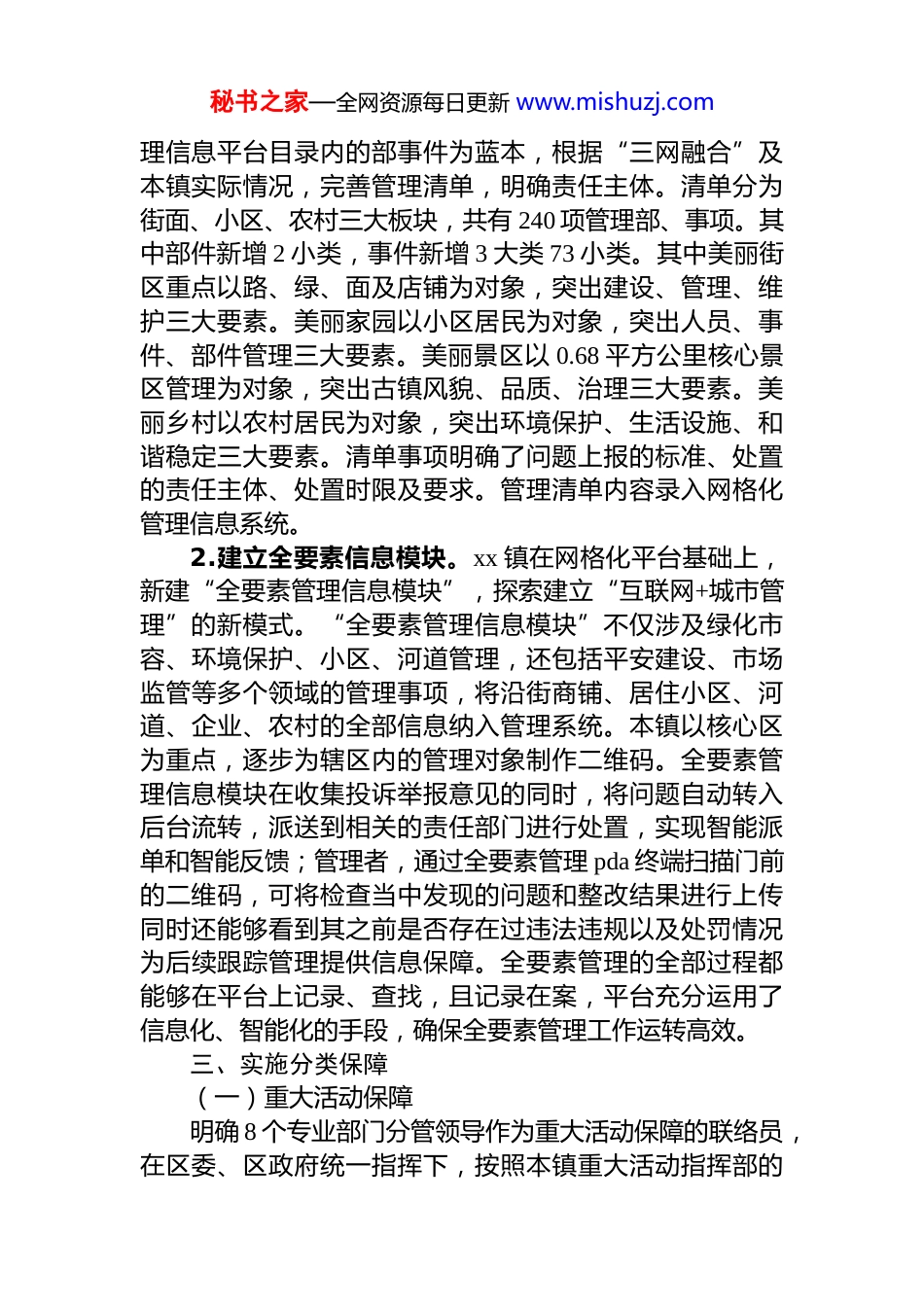 秘书之家—全网资源每日更新 www.mishuzj.com某镇网格精细化管理实施方案各村居、企事业单位、机关各科室:为贯彻落实《xx 区城市管理精细化工作三年行动计划(201x-202x)》,加快推进本镇网格精细化管理工作,在认真学习 xx 镇服务进博会网格精细化管理和总结我镇服务进博会工作的基础上,结合本镇实际,特制定本实施方案。一、工作目标按照管理区域清晰、责任主体明确、管理内容全面、运行机制顺畅的要求,实施 dj 服务网、社会治理网、城市管理网“三网融合”和全要素管理的模式。构建科学合理的工作架构,突出专业部门对块上的有效支撑,依托“一站两中心”的资源,将区、镇专业部门人员、网格监督员*员志愿者、平安志愿者、社会综治力量、镇第三方力量、市民群众纳入网格全天候巡查体系,分类实施网格巡查处置一体化工作。明确东井街居委会、北大街居委会、张马村 3 个责任网格,打造为本镇网格精细化管理样板创建区。二、重点工作(一)统一网格划分按照“三网融合”的工作要求,全镇划分为 38 个责任网格,以村居行政区域边界为网格划分标准,与“一站两中心”工作区域相对应。38 个责任网格下设 86 个管理网格,管理网格以 1 个或若干个村民小组、居民小区划分,与“一站两中心”基层工作力量相匹配。每个管理网格中有网格巡查人员、*员志愿者或村(居)民志愿者、社会综治人员参与巡查,巡查人员配置城管通 pda,通过网格平台对问题的发现、上报、流转、处置。(二)完善管理清单1.梳理全要素管理信息。以上海市城市网格化综合管秘书之家—全网资源每日更新 www.mishuzj.com理信息平台目录内的部事件为蓝本,根据“三网融合”及本镇实际情况,完善管理清单,明确责任主体。清单分为街面、小区、农村三大板块,共有 240 项管理部、事项。其中部件新增 2 小类,事件新增 3 大类 73 小类。其中美丽街区重点以路、绿、面及店铺为对象,突出建设、管理、维护三大要素。美丽家园以小区居民为对象,突出人员、事件、部件管理三大要素。美丽景区以 0.68 平方公里核心景区管理为对象,突出古镇风貌、品质、治理三大要素。美丽乡村以农村居民为对象,突出环境保护、生活设施、和谐稳定三大要素。清单事项明确了问题上报的标准、处置的责任主体、处置时限及要求。管理清单内容录入网格化管理信息系统。2.建立全要素信息模块。xx 镇在网格化平台基础上,新建“全要素管理信息模块”,探索建立“互联网+城市管理”的新模式。“全要素管理信息模块”不仅涉及绿化市容、环境保护、小区、河道管理,还包括平安建设、市场监管等多个领域的管理事项,将沿街商铺、居住小区、河道、企业、农村的全部信息纳入管理系统。本镇以核心区为重点,逐步为辖区内的管理对象制作二维码。全要素管理信息模块在收集投诉举报意见的同时,将问题自动转入后台流转,派送到相关的责任部门进行处置,实现智能派单和智能反馈;管理者,通过全要素管理 pda 终端扫描门前的二维码,可将检查当中发现的问题和整改结果进行上传同时还能够看到其之前是否存在过违法违规以及处罚情况为后续跟踪管理提供信息保障。全要素管理的全部过程都能够在平台上记录、查找,且记录在案,平台充分运用了信息化、智能化的手段,确保全要素管理工作运转高效。三、实施分类保障(一)重大活动保障明确 8 个专业部门分管领导作为重大活动保障的联络员,在区委、区政府统一指挥下,按照本镇重大活动指挥部的秘书之家—全网资源每日更新 www.mishuzj.com统一部署,集中在同一地点办公。本镇将古镇重点区域和外围部分(东方绿舟、彩虹桥、沈巷社区、张马村)分成11 个区域开展分区域综合巡查;各村居、企事业单位加强属地范围内的综合巡查。1.实行 24 小时值班制度镇指挥部全体成员,分成两班不间断值守指挥部,统筹、指挥、协调全镇巡查工作值班地点:镇政府防汛指挥室(332 室)2.巡查区域划分范围:3.08 平方公里古镇区,东方绿舟,淀山湖彩虹桥,张马美丽乡村区域,沈巷社区,以及周边主干道路、高速公路、轨交沿线、宾馆、商业综合体等。区域划分:11 个区域(见附件 1)3.巡查内容基础设...