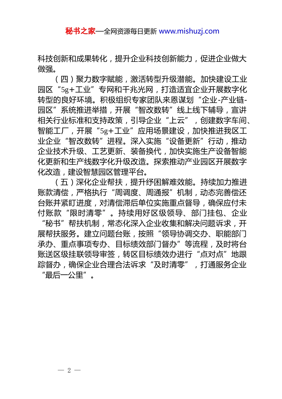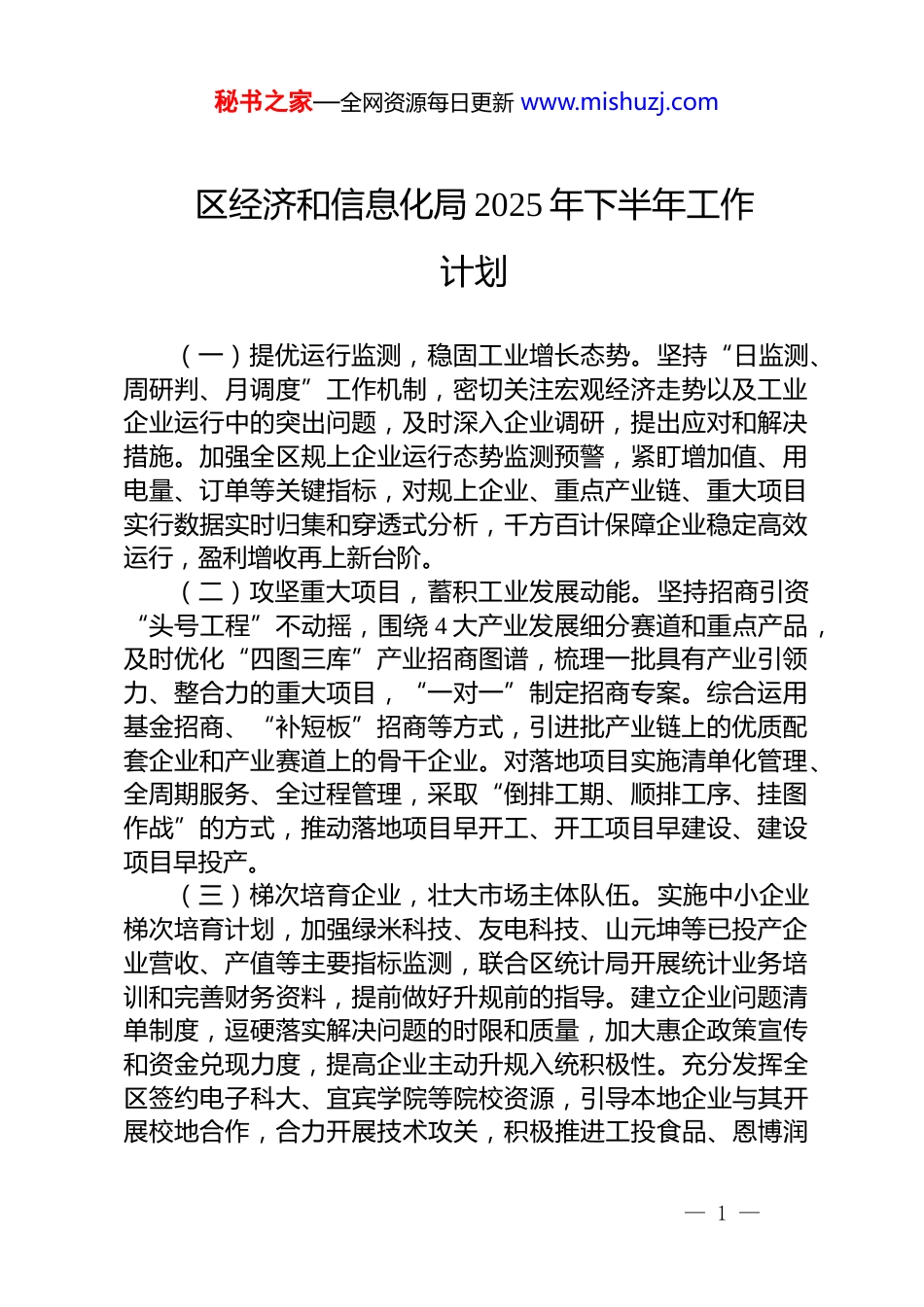 秘书之家—全网资源每日更新 www.mishuzj.com区经济和信息化局 2025 年下半年工作计划(一)提优运行监测,稳固工业增长态势。坚持“日监测、周研判、月调度”工作机制,密切关注宏观经济走势以及工业企业运行中的突出问题,及时深入企业调研,提出应对和解决措施。加强全区规上企业运行态势监测预警,紧盯增加值、用电量、订单等关键指标,对规上企业、重点产业链、重大项目实行数据实时归集和穿透式分析,千方百计保障企业稳定高效运行,盈利增收再上新台阶。(二)攻坚重大项目,蓄积工业发展动能。坚持招商引资“头号工程”不动摇,围绕 4 大产业发展细分赛道和重点产品,及时优化“四图三库”产业招商图谱,梳理一批具有产业引领力、整合力的重大项目,“一对一”制定招商专案。综合运用基金招商、“补短板”招商等方式,引进批产业链上的优质配套企业和产业赛道上的骨干企业。对落地项目实施清单化管理、全周期服务、全过程管理,采取“倒排工期、顺排工序、挂图作战”的方式,推动落地项目早开工、开工项目早建设、建设项目早投产。(三)梯次培育企业,壮大市场主体队伍。实施中小企业梯次培育计划,加强绿米科技、友电科技、山元坤等已投产企业营收、产值等主要指标监测,联合区统计局开展统计业务培训和完善财务资料,提前做好升规前的指导。建立企业问题清单制度,逗硬落实解决问题的时限和质量,加大惠企政策宣传和资金兑现力度,提高企业主动升规入统积极性。充分发挥全区签约电子科大、宜宾学院等院校资源,引导本地企业与其开展校地合作,合力开展技术攻关,积极推进工投食品、恩博润— 1 —秘书之家—全网资源每日更新 www.mishuzj.com科技创新和成果转化,提升企业科技创新能力,促进企业做大做强。(四)聚力数字赋能,激活转型升级潜能。加快建设工业园区“5g+工业”专网和千兆光网,打造适宜企业开展数字化转型的良好环境。积极组织专家团队来恩谋划“企业-产业链-园区”系统推进举措,开展“智改数转”线上线下辅导,宣讲相关行业标准和支持政策,引导企业“上云”,创建数字车间、智能工厂,开展“5g+工业”应用场景建设,加快推进我区工业企业“智改数转”进程。深入实施“设备更新”行动,推动企业技术升级、工艺更新、装备换代,加快实施生产设备智能化更新和生产线数字化升级改造。探索推动产业园区开展数字化改造,建设智慧园区管理平台。(五)深化企业帮扶,提升纾困解难效能。持续加力推进账款清偿,严格执行“周调度、周通报”机制,动态完善偿还台账并紧盯进度,对清偿滞后单位实施重点督导,确保应付未付账款“限时清零”。持续用好区级领导、部门挂包、企业“秘书”帮扶机制,常态化深入企业收集和解决问题诉求,开展帮扶服务。建立问题台账,按照“领导协调交办、职能部门承办、重点事项专办、目标绩效部门督办”等流程,及时将台账送区级挂联领导审签,转区目标绩效办进行“点对点”地跟踪督办,确保企业合理合法诉求“及时清零”,打通服务企业“最后一公里”。— 2 —