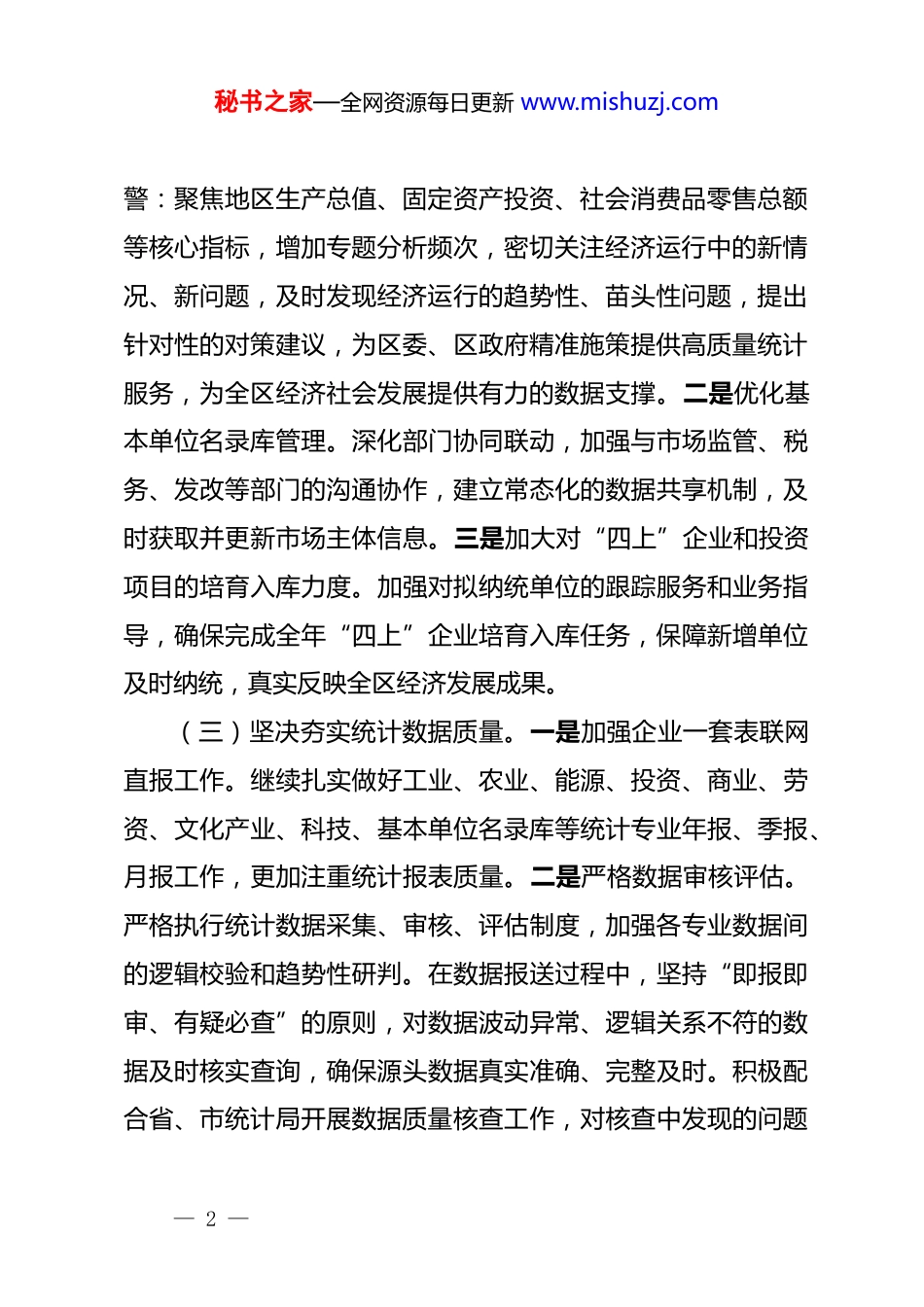 秘书之家—全网资源每日更新 www.mishuzj.com区统计局 2025 年下半年工作计划2025 年下半年,xx 区统计局将以**************思想为指导,全面贯彻*的二十大和二十届二中、三中全会精神及中央经济工作会议精神,紧紧围绕区委、区政府决策部署和省、市统计工作要求,以提高统计数据质量为中心,以提供优质高效服务为宗旨,全面贯彻落实中央八项规定精神学习教育工作要求,各项工作取得阶段性成效。(一)持续深化*的建设。一是加强理论学习。深入学习贯彻*的二十大和二十届二中、三中全会精神。持续深化中央八项规定精神学习教育,创新学习形式,丰富学习内容,引导*员干部学纪、知纪、明纪、守纪,增强纪律意识和规矩意识。二是落实主体责任。压紧压实全面从严治*主体责任,定期召开*风廉政建设专题会议,分析研判*风廉政建设形势,研究解决存在的问题,开展警示教育活动,筑牢*员干部廉洁自律思想防线,营造风清气正的政治生态。三是强化意识形态工作。严格落实意识形态工作责任制,加强对意识形态工作的领导和管理,确保发布的统计信息准确、权威。加强重要时间节点舆情监测研判和有效处置,及时回应社会关切,维护统计部门良好形象。(二)着力提升统计服务效能。一是加强经济运行监测预— 1 —秘书之家—全网资源每日更新 www.mishuzj.com警:聚焦地区生产总值、固定资产投资、社会消费品零售总额等核心指标,增加专题分析频次,密切关注经济运行中的新情况、新问题,及时发现经济运行的趋势性、苗头性问题,提出针对性的对策建议,为区委、区政府精准施策提供高质量统计服务,为全区经济社会发展提供有力的数据支撑。二是优化基本单位名录库管理。深化部门协同联动,加强与市场监管、税务、发改等部门的沟通协作,建立常态化的数据共享机制,及时获取并更新市场主体信息。三是加大对“四上”企业和投资项目的培育入库力度。加强对拟纳统单位的跟踪服务和业务指导,确保完成全年“四上”企业培育入库任务,保障新增单位及时纳统,真实反映全区经济发展成果。(三)坚决夯实统计数据质量。一是加强企业一套表联网直报工作。继续扎实做好工业、农业、能源、投资、商业、劳资、文化产业、科技、基本单位名录库等统计专业年报、季报、月报工作,更加注重统计报表质量。二是严格数据审核评估。严格执行统计数据采集、审核、评估制度,加强各专业数据间的逻辑校验和趋势性研判。在数据报送过程中,坚持“即报即审、有疑必查”的原则,对数据波动异常、逻辑关系不符的数据及时核实查询,确保源头数据真实准确、完整及时。积极配合省、市统计局开展数据质量核查工作,对核查中发现的问题— 2 —秘书之家—全网资源每日更新 www.mishuzj.com及时整改落实。三是推进电子统计台账全覆盖。加快推进企业电子统计台账全覆盖工作,加强督导检查和业务指导。建立电子统计台账使用情况通报制度,定期对企业电子统计台账使用情况进行通报,提高“四上”企业电子统计台账使用率,进一步提高数据报送效率和准确性。(四)纵深推进统计法治建设。一是加大普法宣传力度。充分利用“9·20”统计开放日、“12·8”《统计法》颁布纪念日等重要节点,组织开展形式多样的普法宣传活动。通过设置宣传展板、发放宣传资料、现场讲解、举办知识竞赛等方式,广泛宣传统计法律法规知识,提高全社会统计法治意识。创新宣传方式,利用新媒体平台,制作发布统计法治宣传短视频、动漫等,扩大宣传覆盖面,增强宣传效果。二是加强执法队伍建设。积极组织人员参加国家统计执法资格考试,加强对执法人员的业务培训和实践锻炼,增强统计执法力量。加大统计执法检查力度,严肃查处各类统计违法行为,形成有力震慑。(五)扎实推进调查任务。高质量完成 1%人口抽样调查。按照国家和省、市统一部署,精心组织实施 1%人口抽样调查工作。加强对调查各环节的质量控制,严格执行调查方案和工作流程,确保调查数据真实准确。认真做好调查入户登记、数据审核评估和上报工作,按时发布主要数据公报,为全区人口— 3 —秘书之家—全网资源每日更新 www.mishuzj.com政策制定和经济社会发展规划提供科学依据。— 4 —