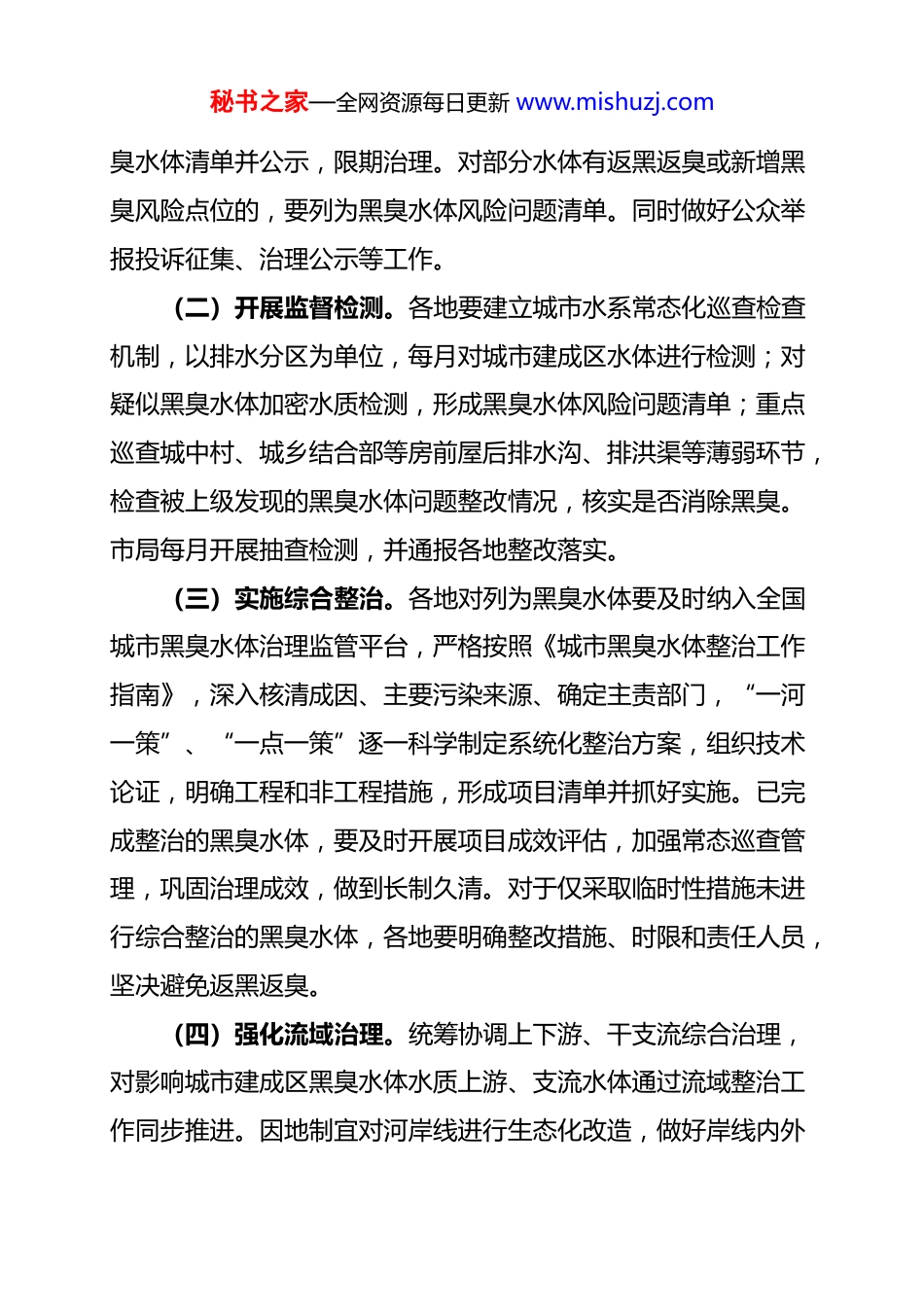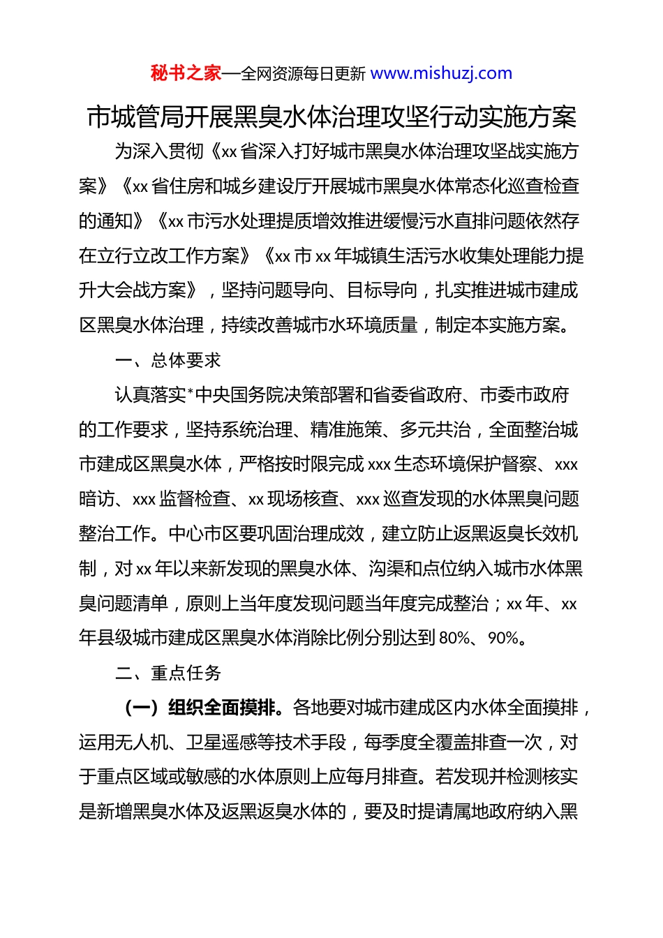 秘书之家—全网资源每日更新 www.mishuzj.com市城管局开展黑臭水体治理攻坚行动实施方案为深入贯彻《xx 省深入打好城市黑臭水体治理攻坚战实施方案》《xx 省住房和城乡建设厅开展城市黑臭水体常态化巡查检查的通知》《xx 市污水处理提质增效推进缓慢污水直排问题依然存在立行立改工作方案》《xx 市 xx 年城镇生活污水收集处理能力提升大会战方案》,坚持问题导向、目标导向,扎实推进城市建成区黑臭水体治理,持续改善城市水环境质量,制定本实施方案。一、总体要求认真落实*中央国务院决策部署和省委省政府、市委市政府的工作要求,坚持系统治理、精准施策、多元共治,全面整治城市建成区黑臭水体,严格按时限完成 xxx 生态环境保护督察、xxx暗访、xxx 监督检查、xx 现场核查、xxx 巡查发现的水体黑臭问题整治工作。中心市区要巩固治理成效,建立防止返黑返臭长效机制,对 xx 年以来新发现的黑臭水体、沟渠和点位纳入城市水体黑臭问题清单,原则上当年度发现问题当年度完成整治;xx 年、xx年县级城市建成区黑臭水体消除比例分别达到 80%、90%。二、重点任务(一)组织全面摸排。各地要对城市建成区内水体全面摸排,运用无人机、卫星遥感等技术手段,每季度全覆盖排查一次,对于重点区域或敏感的水体原则上应每月排查。若发现并检测核实是新增黑臭水体及返黑返臭水体的,要及时提请属地政府纳入黑秘书之家—全网资源每日更新 www.mishuzj.com臭水体清单并公示,限期治理。对部分水体有返黑返臭或新增黑臭风险点位的,要列为黑臭水体风险问题清单。同时做好公众举报投诉征集、治理公示等工作。(二)开展监督检测。各地要建立城市水系常态化巡查检查机制,以排水分区为单位,每月对城市建成区水体进行检测;对疑似黑臭水体加密水质检测,形成黑臭水体风险问题清单;重点巡查城中村、城乡结合部等房前屋后排水沟、排洪渠等薄弱环节,检查被上级发现的黑臭水体问题整改情况,核实是否消除黑臭。市局每月开展抽查检测,并通报各地整改落实。(三)实施综合整治。各地对列为黑臭水体要及时纳入全国城市黑臭水体治理监管平台,严格按照《城市黑臭水体整治工作指南》,深入核清成因、主要污染来源、确定主责部门,“一河一策”、“一点一策”逐一科学制定系统化整治方案,组织技术论证,明确工程和非工程措施,形成项目清单并抓好实施。已完成整治的黑臭水体,要及时开展项目成效评估,加强常态巡查管理,巩固治理成效,做到长制久清。对于仅采取临时性措施未进行综合整治的黑臭水体,各地要明确整改措施、时限和责任人员,坚决避免返黑返臭。(四)强化流域治理。统筹协调上下游、干支流综合治理,对影响城市建成区黑臭水体水质上游、支流水体通过流域整治工作同步推进。因地制宜对河岸线进行生态化改造,做好岸线内外秘书之家—全网资源每日更新 www.mishuzj.com污水垃圾收集处理。落实城区水系保洁责任,及时对水体及河岸垃圾、漂浮物进行清理处置,严禁将其作为水体治理工程回填材料。(五)加快管网建设。开展流域排水管网深度排查,查清断头管、雨污混接、排污口接驳不到等情况,形成排水管网“一张图”。全面推进污水管网建设,加快完善城中村、老旧城区、城乡结合部污水管网改造,消除管网空白区,全面实施雨污混接、断接、漏接和管道破损修复,加快修复沿河截污管道渗漏,加快推进沿河挂管上岸工程,扎实推进雨污分流。(六)开展排口整治。开展源头治理以及排污口整治、规范化建设、维护管理等;以河道为单位,组织开展排口整治效果评价,对于未达到整治要求的,及时整改提升完善。xx 年 9 月底前完成中督提出的中心市区 552 个排口治理,重点整治美山路、南威软件园等附近的穿堤排口。各地要按照《xx 市中心市区主城区排水系统截流技术指引(试行)》要求,开展既有截流设施评估,提升截流设施建设标准,避免污水冒溢、外水入侵等现象。(七)落实排水许可。加大重点排水户和沿河排水户的治理力度,开展教育培训及医疗机构、企业、施工工地、洗车餐饮场所、商业综合体、酒店宾馆等重点排水户专项整治行动,推进“小散乱污”企业污水排入雨水篦、雨水管...