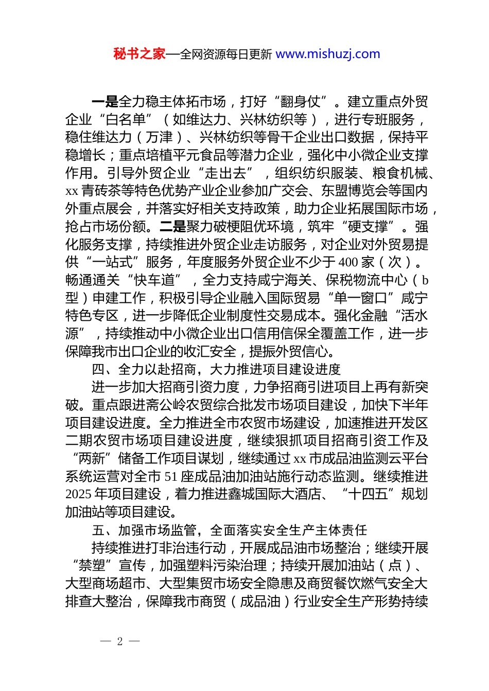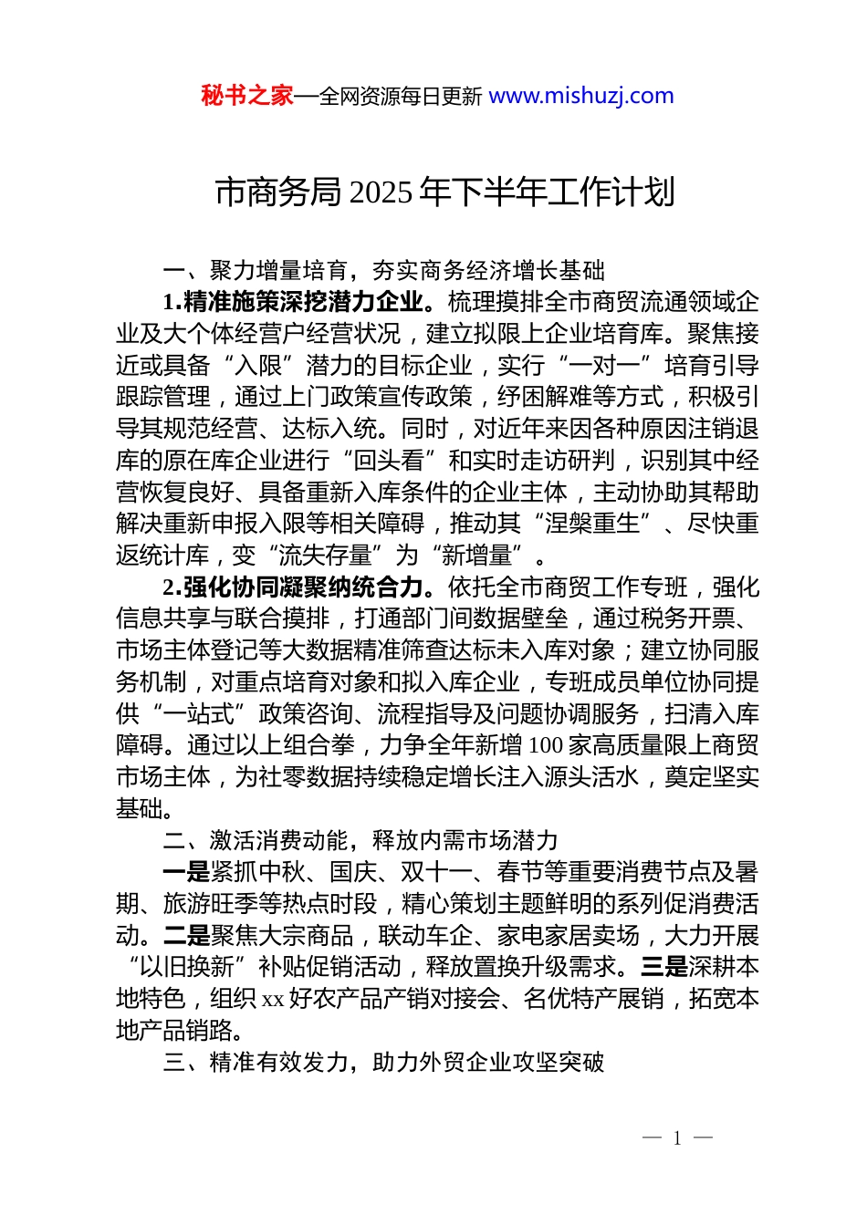 秘书之家—全网资源每日更新 www.mishuzj.com市商务局 2025 年下半年工作计划一、聚力增量培育,夯实商务经济增长基础1.精准施策深挖潜力企业。梳理摸排全市商贸流通领域企业及大个体经营户经营状况,建立拟限上企业培育库。聚焦接近或具备“入限”潜力的目标企业,实行“一对一”培育引导跟踪管理,通过上门政策宣传政策,纾困解难等方式,积极引导其规范经营、达标入统。同时,对近年来因各种原因注销退库的原在库企业进行“回头看”和实时走访研判,识别其中经营恢复良好、具备重新入库条件的企业主体,主动协助其帮助解决重新申报入限等相关障碍,推动其“涅槃重生”、尽快重返统计库,变“流失存量”为“新增量”。2.强化协同凝聚纳统合力。依托全市商贸工作专班,强化信息共享与联合摸排,打通部门间数据壁垒,通过税务开票、市场主体登记等大数据精准筛查达标未入库对象;建立协同服务机制,对重点培育对象和拟入库企业,专班成员单位协同提供“一站式”政策咨询、流程指导及问题协调服务,扫清入库障碍。通过以上组合拳,力争全年新增 100 家高质量限上商贸市场主体,为社零数据持续稳定增长注入源头活水,奠定坚实基础。二、激活消费动能,释放内需市场潜力一是紧抓中秋、国庆、双十一、春节等重要消费节点及暑期、旅游旺季等热点时段,精心策划主题鲜明的系列促消费活动。二是聚焦大宗商品,联动车企、家电家居卖场,大力开展“以旧换新”补贴促销活动,释放置换升级需求。三是深耕本地特色,组织 xx 好农产品产销对接会、名优特产展销,拓宽本地产品销路。三、精准有效发力,助力外贸企业攻坚突破— 1 —秘书之家—全网资源每日更新 www.mishuzj.com一是全力稳主体拓市场,打好“翻身仗”。建立重点外贸企业“白名单”(如维达力、兴林纺织等),进行专班服务,稳住维达力(万津)、兴林纺织等骨干企业出口数据,保持平稳增长;重点培植平元食品等潜力企业,强化中小微企业支撑作用。引导外贸企业“走出去”,组织纺织服装、粮食机械、xx 青砖茶等特色优势产业企业参加广交会、东盟博览会等国内外重点展会,并落实好相关支持政策,助力企业拓展国际市场,抢占市场份额。二是聚力破梗阻优环境,筑牢“硬支撑”。强化服务支撑,持续推进外贸企业走访服务,对企业对外贸易提供“一站式”服务,年度服务外贸企业不少于 400 家(次)。畅通通关“快车道”,全力支持咸宁海关、保税物流中心(b型)申建工作,积极引导企业融入国际贸易“单一窗口”咸宁特色专区,进一步降低企业制度性交易成本。强化金融“活水源”,持续推动中小微企业出口信用信保全覆盖工作,进一步保障我市出口企业的收汇安全,提振外贸信心。四、全力以赴招商,大力推进项目建设进度进一步加大招商引资力度,力争招商引进项目上再有新突破。重点跟进斋公岭农贸综合批发市场项目建设,加快下半年项目建设进度。全力推进全市农贸市场建设,加速推进开发区二期农贸市场项目建设进度,继续狠抓项目招商引资工作及“两新”储备工作项目谋划,继续通过 xx 市成品油监测云平台系统运营对全市 51 座成品油加油站施行动态监测。继续推进2025 年项目建设,着力推进鑫城国际大酒店、“十四五”规划加油站等项目建设。五、加强市场监管,全面落实安全生产主体责任持续推进打非治违行动,开展成品油市场整治;继续开展“禁塑”宣传,加强塑料污染治理;持续开展加油站(点)、大型商场超市、大型集贸市场安全隐患及商贸餐饮燃气安全大排查大整治,保障我市商贸(成品油)行业安全生产形势持续— 2 —秘书之家—全网资源每日更新 www.mishuzj.com稳定。按照“四个最严”要求,严防严管严控食品安全风险隐患,守稳筑牢食品安全防线,持续参与食品质量安全专项整治活动和部门联合执法,重点抓好各类主要食品的安全专项检查,强化常态化监督和专项整治相结合,全力推进我市各主要农贸市场产品溯源体系建设,督促城区各大型商超及主要农贸市场按照食品安全标准做好食品安全常态化管理,保障我市商贸系统食品安全创建和监管水平的全面提升。六、健全商贸流通,着力加快市场体系建设推动县域商业体系示范...