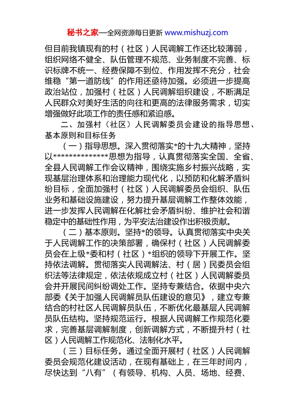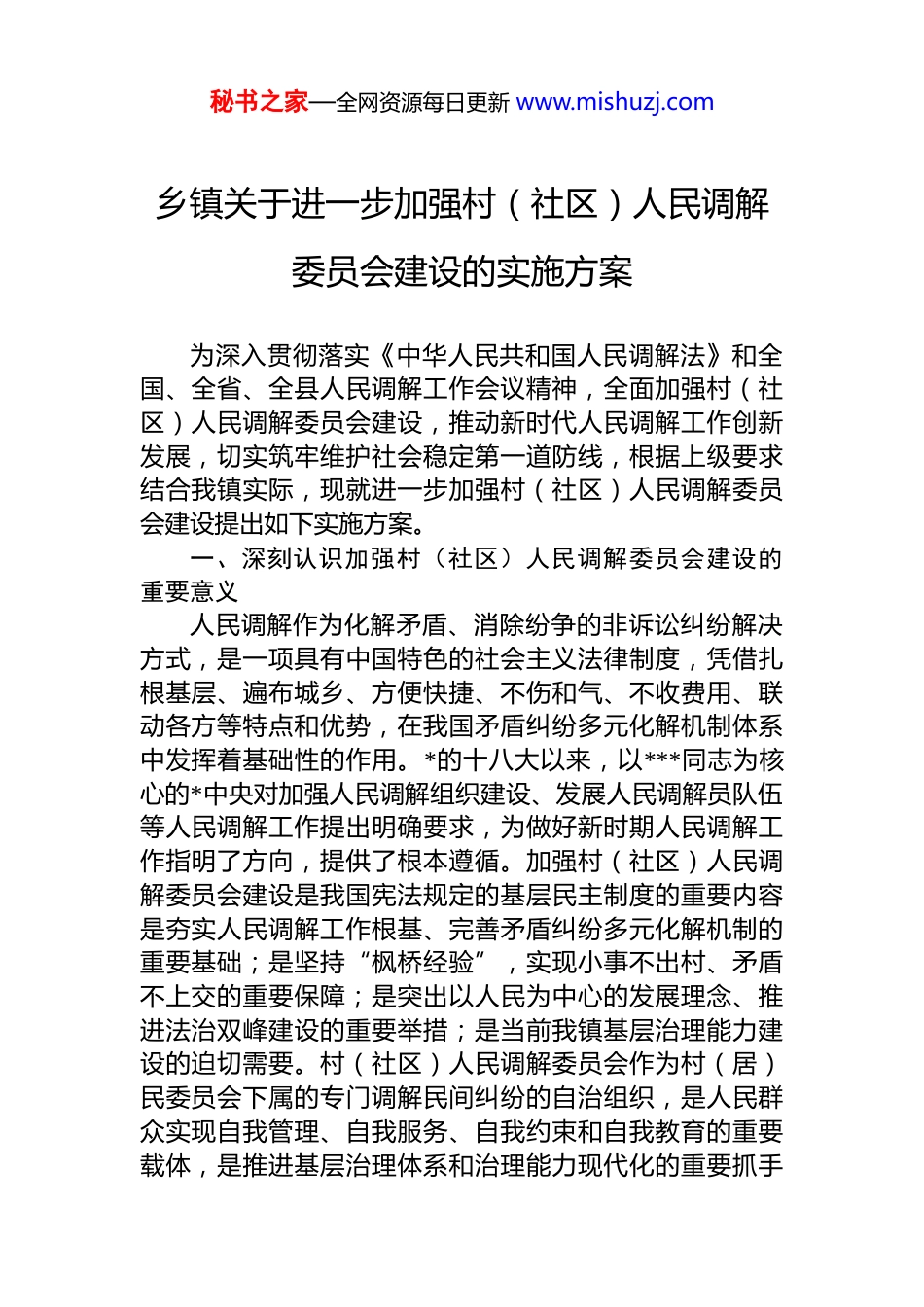 秘书之家—全网资源每日更新 www.mishuzj.com乡镇关于进一步加强村(社区)人民调解委员会建设的实施方案为深入贯彻落实《中华人民共和国人民调解法》和全国、全省、全县人民调解工作会议精神,全面加强村(社区)人民调解委员会建设,推动新时代人民调解工作创新发展,切实筑牢维护社会稳定第一道防线,根据上级要求结合我镇实际,现就进一步加强村(社区)人民调解委员会建设提出如下实施方案。一、深刻认识加强村(社区)人民调解委员会建设的重要意义人民调解作为化解矛盾、消除纷争的非诉讼纠纷解决方式,是一项具有中国特色的社会主义法律制度,凭借扎根基层、遍布城乡、方便快捷、不伤和气、不收费用、联动各方等特点和优势,在我国矛盾纠纷多元化解机制体系中发挥着基础性的作用。*的十八大以来,以***同志为核心的*中央对加强人民调解组织建设、发展人民调解员队伍等人民调解工作提出明确要求,为做好新时期人民调解工作指明了方向,提供了根本遵循。加强村(社区)人民调解委员会建设是我国宪法规定的基层民主制度的重要内容是夯实人民调解工作根基、完善矛盾纠纷多元化解机制的重要基础;是坚持“枫桥经验”,实现小事不出村、矛盾不上交的重要保障;是突出以人民为中心的发展理念、推进法治双峰建设的重要举措;是当前我镇基层治理能力建设的迫切需要。村(社区)人民调解委员会作为村(居)民委员会下属的专门调解民间纠纷的自治组织,是人民群众实现自我管理、自我服务、自我约束和自我教育的重要载体,是推进基层治理体系和治理能力现代化的重要抓手秘书之家—全网资源每日更新 www.mishuzj.com但目前我镇现有的村(社区)人民调解工作还比较薄弱,组织网络不健全、队伍管理不规范、业务制度不完善、标识标牌不统一、经费保障不到位、作用发挥不充分,社会维稳“第一道防线”的作用还亟待加强。必须进一步提高政治站位,加强村(社区)人民调解组织建设,不断满足人民群众对美好生活的向往和更高的法律服务需求,切实增强做好此项工作的责任感和紧迫感。二、加强村(社区)人民调解委员会建设的指导思想、基本原则和目标任务(一)指导思想。深入贯彻落实*的十九大精神,坚持以**************思想为指导,认真贯彻落实全国、全省、全县人民调解工作会议精神,围绕实施乡村振兴战略,实现基层治理体系和治理能力现代化,以预防和化解矛盾纠纷目标,全面加强村(社区)人民调解委员会组织、队伍业务和基础设施建设,努力提升基层调解工作整体效能,进一步发挥人民调解在化解社会矛盾纠纷、维护社会和谐稳定中的基础性作用,为平安法治建设作出积极贡献。(二)基本原则。坚持*的领导。认真贯彻落实中央关于人民调解工作的决策部署,确保村(社区)人民调解委员会在上级*委和村(社区)*组织的领导下开展工作。坚持依法调解。贯彻落实人民调解法、村(居)民委员会组织法等法律规定,依法依规成立村(社区)人民调解委员会并开展民间纠纷调处工作。坚持专兼结合。依据中央六部委《关于加强人民调解员队伍建设的意见》,建立专兼结合的村社区人民调解员队伍,不断优化最基层人民调解员队伍结构。坚持规范运行。根据人民调解工作规范化要求,完善基层调解制度,创新调解方式,不断提升村(社区)人民调解工作规范化、法制化水平。(三)目标任务。通过全面开展村(社区)人民调解委员会规范化建设活动,在现有基础上,在三年时间内,尽快达到“八有”(有领导、机构、人员、场地、经费、秘书之家—全网资源每日更新 www.mishuzj.com制度、考核、奖惩)、“六统一”(统一标牌、印章、标识、徽章、程序、文书)的基本要求,实现全镇村(社区)人民调解委员会组织健全、制度完善、流程统一、文书规范、保障到位,有效预防和化解矛盾纠纷的能力得到加强,人民调解员队伍素质不断提高,村(社区)自治、法治、德治“三治融合”的能力明显提升的总目标。2019年村(社区)人民调解组织建设规范化率要达到 50%以上;2020 年达到 70%以上;2021 年力争全部实现规范化。三、建立健全村(社区)人民调解组织网络根据《中华人民共和国人民调解法》和实际工作需要,全镇各村(...