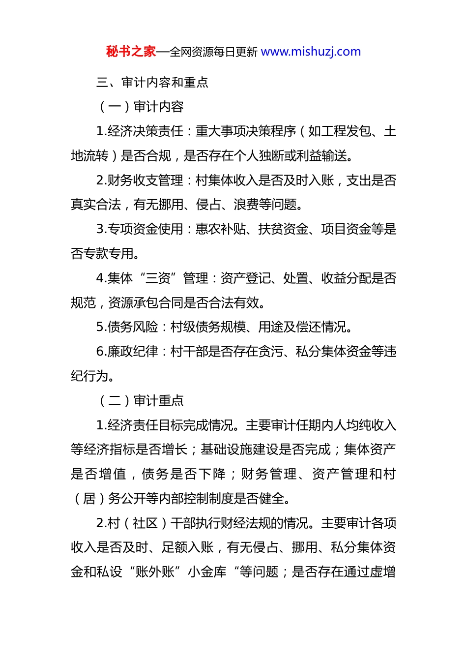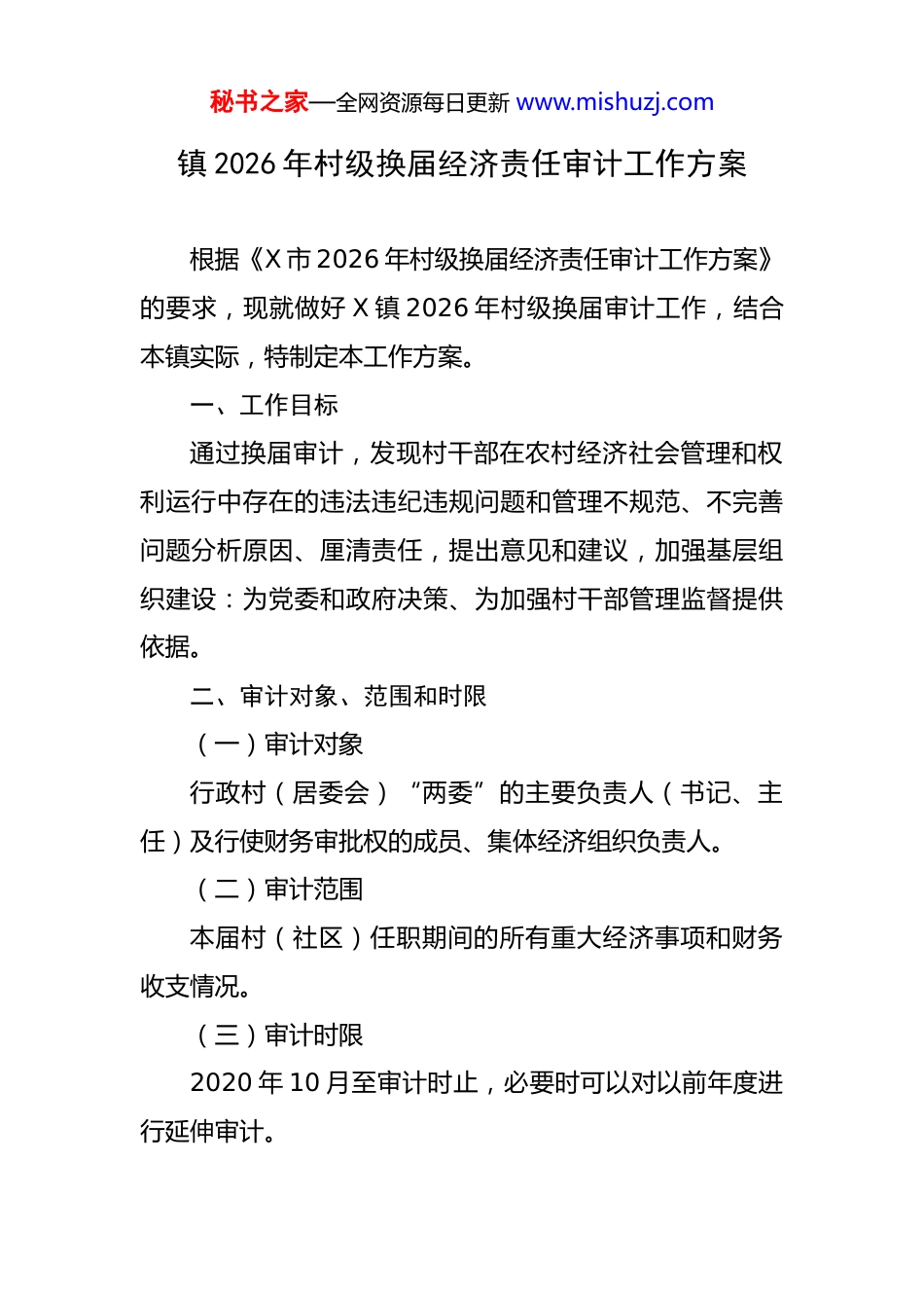 秘书之家—全网资源每日更新 www.mishuzj.com镇 2026 年村级换届经济责任审计工作方案 根据《X 市 2026 年村级换届经济责任审计工作方案》的要求,现就做好 X 镇 2026 年村级换届审计工作,结合本镇实际,特制定本工作方案。一、工作目标通过换届审计,发现村干部在农村经济社会管理和权利运行中存在的违法违纪违规问题和管理不规范、不完善问题分析原因、厘清责任,提出意见和建议,加强基层组织建设:为党委和政府决策、为加强村干部管理监督提供依据。二、审计对象、范围和时限(一)审计对象行政村(居委会)“两委”的主要负责人(书记、主任)及行使财务审批权的成员、集体经济组织负责人。(二)审计范围本届村(社区)任职期间的所有重大经济事项和财务收支情况。(三)审计时限2020 年 10 月至审计时止,必要时可以对以前年度进行延伸审计。秘书之家—全网资源每日更新 www.mishuzj.com三、审计内容和重点(一)审计内容1.经济决策责任:重大事项决策程序(如工程发包、土地流转)是否合规,是否存在个人独断或利益输送。2.财务收支管理:村集体收入是否及时入账,支出是否真实合法,有无挪用、侵占、浪费等问题。3.专项资金使用:惠农补贴、扶贫资金、项目资金等是否专款专用。4.集体“三资”管理:资产登记、处置、收益分配是否规范,资源承包合同是否合法有效。5.债务风险:村级债务规模、用途及偿还情况。6.廉政纪律:村干部是否存在贪污、私分集体资金等违纪行为。(二)审计重点1.经济责任目标完成情况。主要审计任期内人均纯收入等经济指标是否增长;基础设施建设是否完成;集体资产是否增值,债务是否下降;财务管理、资产管理和村(居)务公开等内部控制制度是否健全。2.村(社区)干部执行财经法规的情况。主要审计各项收入是否及时、足额入账,有无侵占、挪用、私分集体资金和私设“账外账”小金库“等问题;是否存在通过虚增秘书之家—全网资源每日更新 www.mishuzj.com债权的手段”虚增收入”以及将收入或非法收入挂在往来账上虚增债务等问题;是否存在滥用职权侵占、挪用、平调集体资产等问题。3.群众关注的热点问题。主要审计农村征地补偿款管理和分配情况,农村资源性资产发包、承包情况,涉农补助资金管理和使用情况,民主决策和民主监督程序履行情况以及村务财务公开情况是否符合规定。四、审计工作组织(一)工作专班为加强对村级换届经济责任审计工作的领导,成立 X镇 2026 年村级换届经济责任审计工作专班,协调和指导审计工作。(二)工作小组根据本镇实际情况,由镇经济发展办、农业农村办、公共服务办、财政结算中心等部门人员组成 2 个审计工作小组(附件 3),具体负责各村(社区)的审计工作。五、审计实施(一)部署阶段(8 月 1 日-8 月 15 日):制定审计工作方案,明确审计目标、范围、内容和方法;组建审计工作小组,进行人员分工,完成相关业务培训;收集与审计相关的法律法规、政策文件和被审计村(社区)的基本秘书之家—全网资源每日更新 www.mishuzj.com资料;开展审前调查,了解被审计村(社区)的经济活动和财务管理情况,确定审计重点和风险点;向被审计村(社区)送达审计通知书。(二)实施阶段(8 月 16 日-9 月 12 日):审计工作小组按照分工进驻被审计村(社区),根据审计工作方案开展现场审计工作。通过审查财务账目、凭证、报表,查阅会议记录、合同协议等资料,盘点资产、资源,走访相关人员等方式,收集审计证据,核实经济事项,查找存在的问题。审计过程中,及时与被审计村(社区)沟通交流,听取意见和解释,对发现的问题进行初步定性和分析。各审计小组在审计过程中要严格按照要求填写统计表。(三)总结阶段(9 月 13 日-9 月 30 日):审计工作小组根据审计实施情况,撰写各被审计村(社区)审计报告初稿,并征求其意见。被审计村(社区)应在两个工作日内提出书面反馈意见,审计工作小组对反馈意见进行认真研究和核实,对审计报告进行修改,确保审计结论事实清楚、证据充分、定性准确,完善后的审计报告要即时在村(社区)党务、村(居)务公开栏进行公示(15 天...