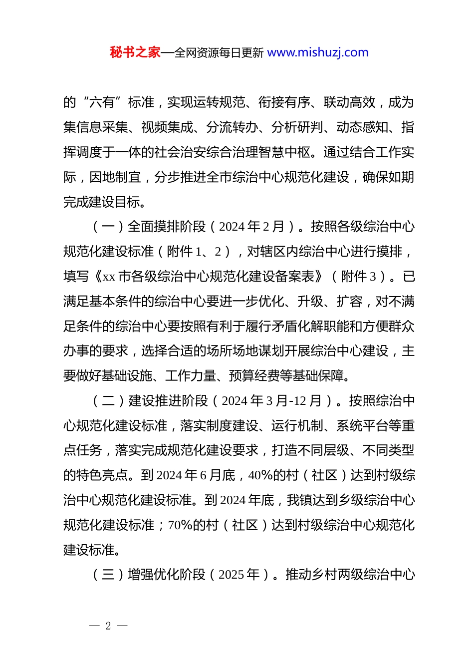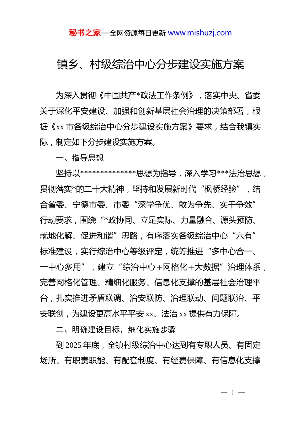 秘书之家—全网资源每日更新 www.mishuzj.com镇乡、村级综治中心分步建设实施方案为深入贯彻《中国共产*政法工作条例》,落实中央、省委关于深化平安建设、加强和创新基层社会治理的决策部署,根据《xx 市各级综治中心分步建设实施方案》要求,结合我镇实际,制定如下分步建设实施方案。一、指导思想坚持以**************思想为指导,深入学习***法治思想,贯彻落实*的二十大精神,坚持和发展新时代“枫桥经验”,结合省委、宁德市委、市委“深学争优、敢为争先、实干争效”行动要求,围绕“*政协同、立足实际、力量融合、源头预防、就地化解、促进和谐”思路,有序落实各级综治中心“六有”标准建设,实行综治中心等级评定,统筹推进“多中心合一、一中心多用”,建立“综治中心+网格化+大数据”治理体系,完善网格化管理、精细化服务、信息化支撑的基层社会治理平台,扎实推进矛盾联调、治安联防、治理联动、问题联治、平安联创,为建设更高水平平安 xx、法治 xx 提供有力保障。二、明确建设目标,细化实施步骤到 2025 年底,全镇村级综治中心达到有专职人员、有固定场所、有职责职能、有配套制度、有经费保障、有信息化支撑— 1 —秘书之家—全网资源每日更新 www.mishuzj.com的“六有”标准,实现运转规范、衔接有序、联动高效,成为集信息采集、视频集成、分流转办、分析研判、动态感知、指挥调度于一体的社会治安综合治理智慧中枢。通过结合工作实际,因地制宜,分步推进全市综治中心规范化建设,确保如期完成建设目标。(一)全面摸排阶段(2024 年 2 月)。按照各级综治中心规范化建设标准(附件 1、2),对辖区内综治中心进行摸排,填写《xx 市各级综治中心规范化建设备案表》(附件 3)。已满足基本条件的综治中心要进一步优化、升级、扩容,对不满足条件的综治中心要按照有利于履行矛盾化解职能和方便群众办事的要求,选择合适的场所场地谋划开展综治中心建设,主要做好基础设施、工作力量、预算经费等基础保障。(二)建设推进阶段(2024 年 3 月-12 月)。按照综治中心规范化建设标准,落实制度建设、运行机制、系统平台等重点任务,落实完成规范化建设要求,打造不同层级、不同类型的特色亮点。到 2024 年 6 月底,40%的村(社区)达到村级综治中心规范化建设标准。到 2024 年底,我镇达到乡级综治中心规范化建设标准;70%的村(社区)达到村级综治中心规范化建设标准。(三)增强优化阶段(2025 年)。推动乡村两级综治中心— 2 —秘书之家—全网资源每日更新 www.mishuzj.com全面达到规范化建设标准,持续优化完善各级综治中心组织架构、基础阵地、功能区域、信息平台,整体提升一体化运作、实体化运行、实战化运用能力水平。三、聚焦目标任务,规范建设标准(一)明确功能定位1.乡级综治中心。突出实战运转,注重组团服务、诉求受理、事件分流,建立健全网格事件、矛盾纠纷“受理一录入一研判一分流一反馈一评价”等线上线下全链条闭环处置和联动处置机制,按照“1+6+n”法治服务矩阵建设模式,落实“政法委员统筹”的工作要求,指导平安办、派出所、司法所、人民法庭等各方力量开展工作,变“各自为战”为“协同作战”。2.村级综治中心。突出网格治理,依托基层*组织“战斗堡垒”作用,动员村(社区)干部及网格员,落实网格化服务管理事项清单工作内容,了解掌握社情民意、矛盾纠纷、治安状况,配合开展调处纠纷、信息上报、法治宣传、志愿服务等工作,进一步夯实基层基础。(二)统一建设规范1.规范场所功能。镇综治中心要选择开放式、便捷性场所,设置完善综合服务大厅(窗口)、群众接待室、矛盾纠纷调解室、视频监控调度室、公共法律服务室、心理咨询室等功能室,— 3 —秘书之家—全网资源每日更新 www.mishuzj.com并保障进驻部门和人员的工作场地。暂无法具备独立办公条件的乡级综治中心,可依托派出所、司法所等办公场地,满足基本功能设置的需求,可视情“一室多用”。有条件的村(社区)综治中心可在*群服务中心周边选择独立办公场地开展工作;其他不具备独立办公条件的,可依托*群服务中心设立综治中心区域,进行功...