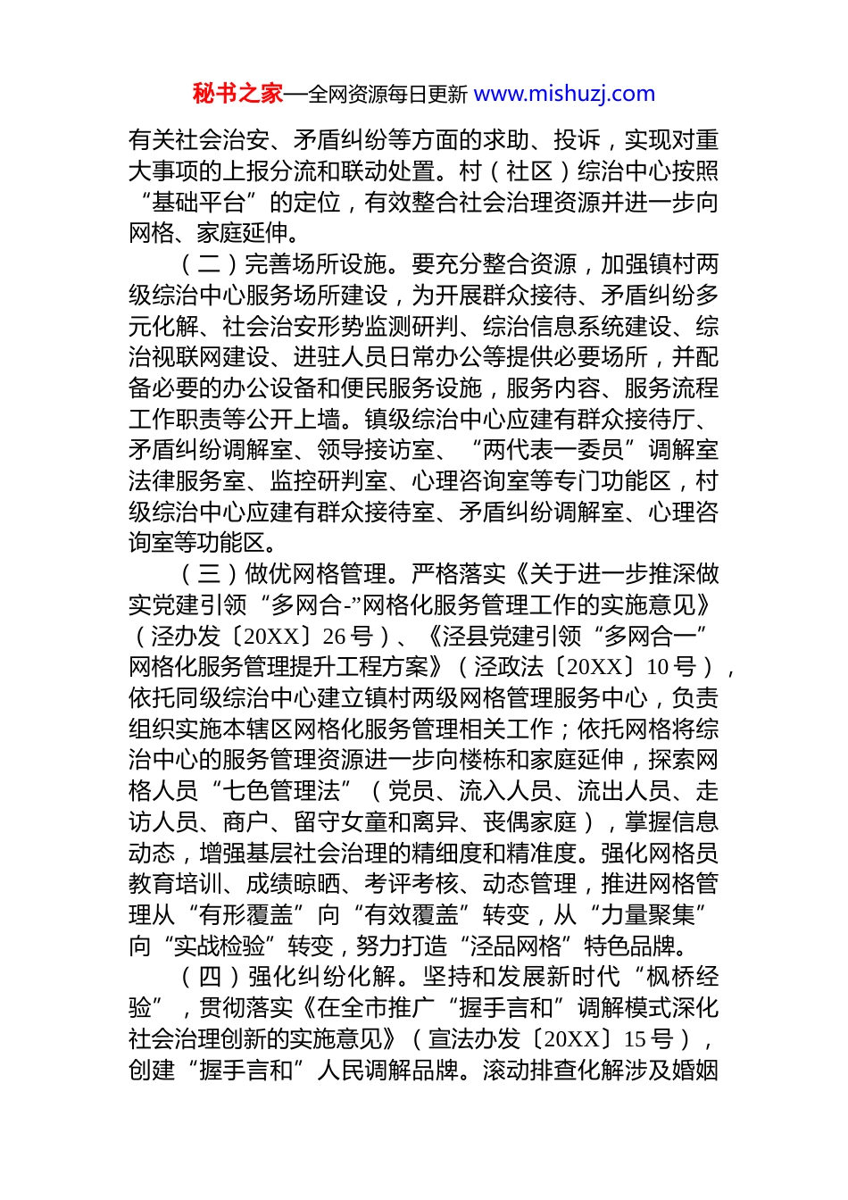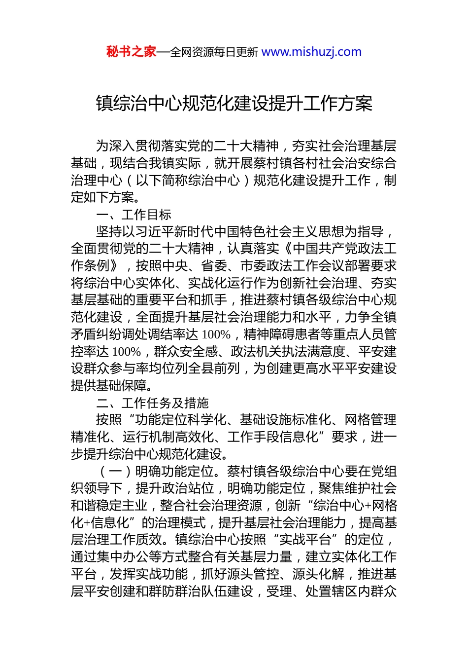 秘书之家—全网资源每日更新 www.mishuzj.com镇综治中心规范化建设提升工作方案为深入贯彻落实党的二十大精神,夯实社会治理基层基础,现结合我镇实际,就开展蔡村镇各村社会治安综合治理中心(以下简称综治中心)规范化建设提升工作,制定如下方案。一、工作目标坚持以习近平新时代中国特色社会主义思想为指导,全面贯彻党的二十大精神,认真落实《中国共产党政法工作条例》,按照中央、省委、市委政法工作会议部署要求将综治中心实体化、实战化运行作为创新社会治理、夯实基层基础的重要平台和抓手,推进蔡村镇各级综治中心规范化建设,全面提升基层社会治理能力和水平,力争全镇矛盾纠纷调处调结率达 100%,精神障碍患者等重点人员管控率达 100%,群众安全感、政法机关执法满意度、平安建设群众参与率均位列全县前列,为创建更高水平平安建设提供基础保障。二、工作任务及措施按照“功能定位科学化、基础设施标准化、网格管理精准化、运行机制高效化、工作手段信息化”要求,进一步提升综治中心规范化建设。(一)明确功能定位。蔡村镇各级综治中心要在党组织领导下,提升政治站位,明确功能定位,聚焦维护社会和谐稳定主业,整合社会治理资源,创新“综治中心+网格化+信息化”的治理模式,提升基层社会治理能力,提高基层治理工作质效。镇综治中心按照“实战平台”的定位,通过集中办公等方式整合有关基层力量,建立实体化工作平台,发挥实战功能,抓好源头管控、源头化解,推进基层平安创建和群防群治队伍建设,受理、处置辖区内群众秘书之家—全网资源每日更新 www.mishuzj.com有关社会治安、矛盾纠纷等方面的求助、投诉,实现对重大事项的上报分流和联动处置。村(社区)综治中心按照“基础平台”的定位,有效整合社会治理资源并进一步向网格、家庭延伸。(二)完善场所设施。要充分整合资源,加强镇村两级综治中心服务场所建设,为开展群众接待、矛盾纠纷多元化解、社会治安形势监测研判、综治信息系统建设、综治视联网建设、进驻人员日常办公等提供必要场所,并配备必要的办公设备和便民服务设施,服务内容、服务流程工作职责等公开上墙。镇级综治中心应建有群众接待厅、矛盾纠纷调解室、领导接访室、“两代表一委员”调解室法律服务室、监控研判室、心理咨询室等专门功能区,村级综治中心应建有群众接待室、矛盾纠纷调解室、心理咨询室等功能区。(三)做优网格管理。严格落实《关于进一步推深做实党建引领“多网合-”网格化服务管理工作的实施意见》(泾办发〔20XX〕26 号)、《泾县党建引领“多网合一”网格化服务管理提升工程方案》(泾政法〔20XX〕10 号),依托同级综治中心建立镇村两级网格管理服务中心,负责组织实施本辖区网格化服务管理相关工作;依托网格将综治中心的服务管理资源进一步向楼栋和家庭延伸,探索网格人员“七色管理法”(党员、流入人员、流出人员、走访人员、商户、留守女童和离异、丧偶家庭),掌握信息动态,增强基层社会治理的精细度和精准度。强化网格员教育培训、成绩晾晒、考评考核、动态管理,推进网格管理从“有形覆盖”向“有效覆盖”转变,从“力量聚集”向“实战检验”转变,努力打造“泾品网格”特色品牌。(四)强化纠纷化解。坚持和发展新时代“枫桥经验”,贯彻落实《在全市推广“握手言和”调解模式深化社会治理创新的实施意见》(宣法办发〔20XX〕15 号),创建“握手言和”人民调解品牌。滚动排查化解涉及婚姻秘书之家—全网资源每日更新 www.mishuzj.com(婚恋)家庭、邻里、宅基地等方面矛盾纠纷,涉及群众切身利益的房屋拆迁、土地征收流转、矿产开采、损害赔偿、劳动社保等方面矛盾纠纷,涉及刑满释放、社区矫正社区戒毒、闲散青少年、缺乏有效监护的留守儿童、孤寡鳏独等人员纠纷,涉及对社会不满、性格偏激、有扬言实施个人极端行为及缠访闹访等人员纠纷,涉及因生产经营活动引发的合同、劳动争议等矛盾纠纷,清单化、闭环式推进多元调处化解工作,切实把矛盾解决在萌芽状态、化解在基层,实现小事不出村、大事不出镇、矛盾不上交,坚决防止发生“民转刑”“刑转命”案件。(五)狠抓机制运行。蔡村镇综治中心...