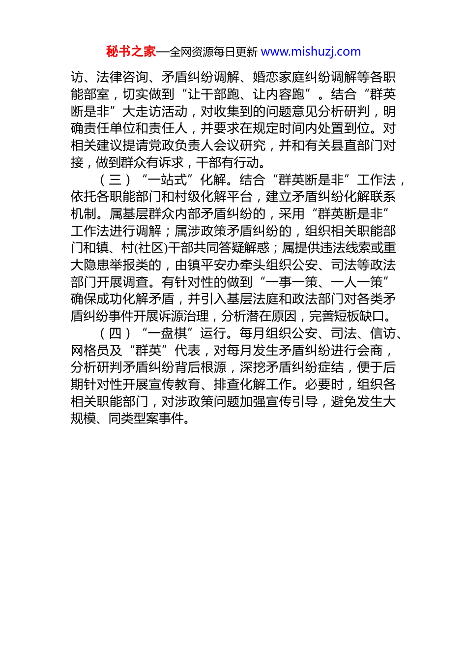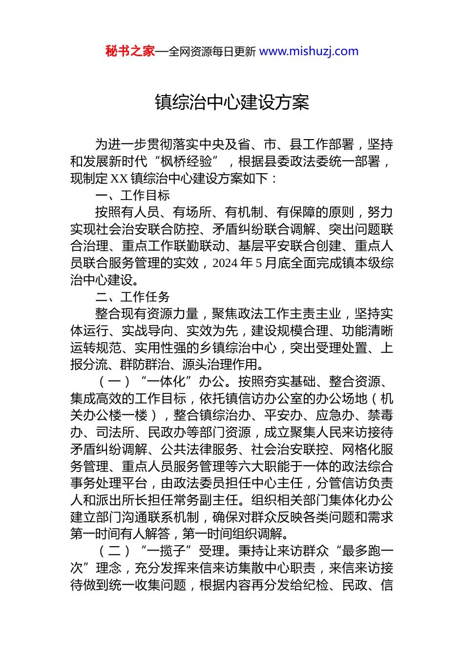 秘书之家—全网资源每日更新 www.mishuzj.com镇综治中心建设方案为进一步贯彻落实中央及省、市、县工作部署,坚持和发展新时代“枫桥经验”,根据县委政法委统一部署,现制定 XX 镇综治中心建设方案如下:一、工作目标按照有人员、有场所、有机制、有保障的原则,努力实现社会治安联合防控、矛盾纠纷联合调解、突出问题联合治理、重点工作联勤联动、基层平安联合创建、重点人员联合服务管理的实效,2024 年 5 月底全面完成镇本级综治中心建设。二、工作任务整合现有资源力量,聚焦政法工作主责主业,坚持实体运行、实战导向、实效为先,建设规模合理、功能清晰运转规范、实用性强的乡镇综治中心,突出受理处置、上报分流、群防群治、源头治理作用。(一)“一体化”办公。按照夯实基础、整合资源、集成高效的工作目标,依托镇信访办公室的办公场地(机关办公楼一楼),整合镇综治办、平安办、应急办、禁毒办、司法所、民政办等部门资源,成立聚集人民来访接待矛盾纠纷调解、公共法律服务、社会治安联控、网格化服务管理、重点人员服务管理等六大职能于一体的政法综合事务处理平台,由政法委员担任中心主任,分管信访负责人和派出所长担任常务副主任。组织相关部门集体化办公建立部门沟通联系机制,确保对群众反映各类问题和需求第一时间有人解答,第一时间组织调解。(二)“一揽子”受理。秉持让来访群众“最多跑一次”理念,充分发挥来信来访集散中心职责,来信来访接待做到统一收集问题,根据内容再分发给纪检、民政、信秘书之家—全网资源每日更新 www.mishuzj.com访、法律咨询、矛盾纠纷调解、婚恋家庭纠纷调解等各职能部室,切实做到“让干部跑、让内容跑”。结合“群英断是非”大走访活动,对收集到的问题意见分析研判,明确责任单位和责任人,并要求在规定时间内处置到位。对相关建议提请党政负责人会议研究,并和有关县直部门对接,做到群众有诉求,干部有行动。(三)“一站式”化解。结合“群英断是非”工作法,依托各职能部门和村级化解平台,建立矛盾纠纷化解联系机制。属基层群众内部矛盾纠纷的,采用“群英断是非”工作法进行调解;属涉政策矛盾纠纷的,组织相关职能部门和镇、村(社区)干部共同答疑解惑;属提供违法线索或重大隐患举报类的,由镇平安办牵头组织公安、司法等政法部门开展调查。有针对性的做到“一事一策、一人一策”确保成功化解矛盾,并引入基层法庭和政法部门对各类矛盾纠纷事件开展诉源治理,分析潜在原因,完善短板缺口。(四)“一盘棋”运行。每月组织公安、司法、信访、网格员及“群英”代表,对每月发生矛盾纠纷进行会商,分析研判矛盾纠纷背后根源,深挖矛盾纠纷症结,便于后期针对性开展宣传教育、排查化解工作。必要时,组织各相关职能部门,对涉政策问题加强宣传引导,避免发生大规模、同类型案事件。