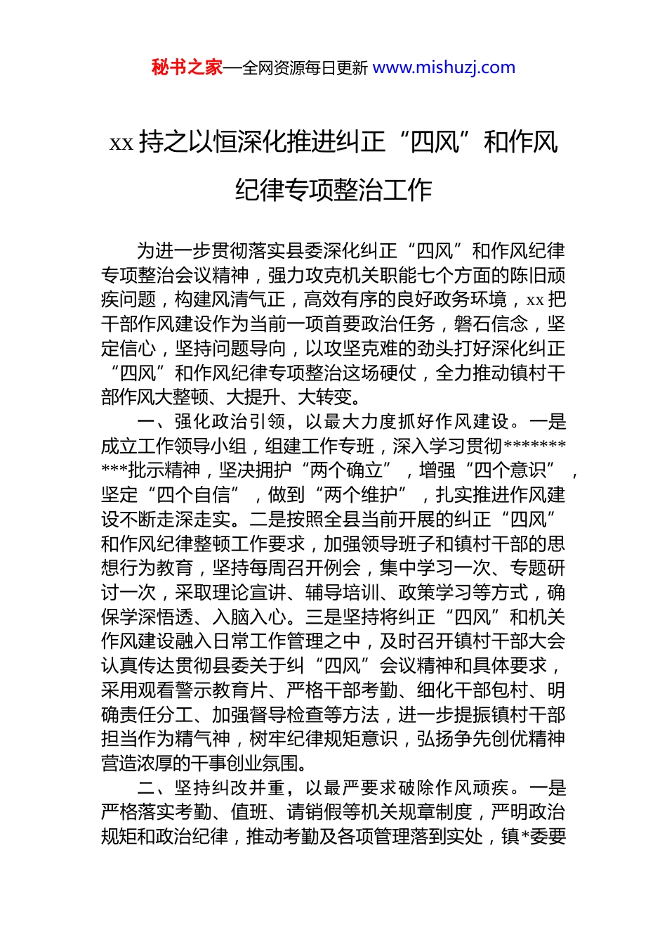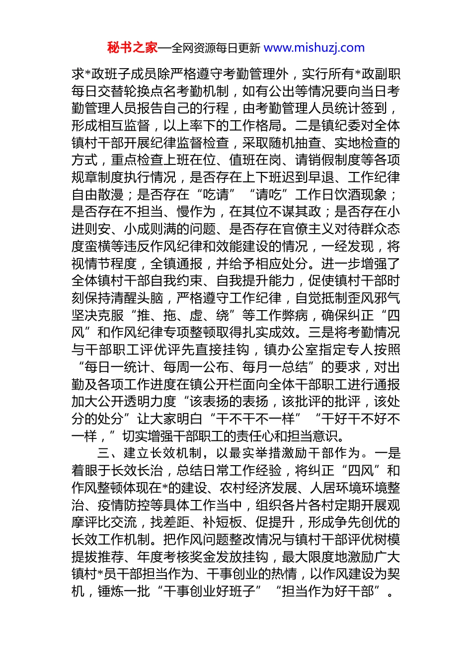 秘书之家—全网资源每日更新 www.mishuzj.comxx 持之以恒深化推进纠正“四风”和作风纪律专项整治工作为进一步贯彻落实县委深化纠正“四风”和作风纪律专项整治会议精神,强力攻克机关职能七个方面的陈旧顽疾问题,构建风清气正,高效有序的良好政务环境,xx 把干部作风建设作为当前一项首要政治任务,磐石信念,坚定信心,坚持问题导向,以攻坚克难的劲头打好深化纠正“四风”和作风纪律专项整治这场硬仗,全力推动镇村干部作风大整顿、大提升、大转变。一、强化政治引领,以最大力度抓好作风建设。一是成立工作领导小组,组建工作专班,深入学习贯彻**********批示精神,坚决拥护“两个确立”,增强“四个意识”,坚定“四个自信”,做到“两个维护”,扎实推进作风建设不断走深走实。二是按照全县当前开展的纠正“四风”和作风纪律整顿工作要求,加强领导班子和镇村干部的思想行为教育,坚持每周召开例会,集中学习一次、专题研讨一次,采取理论宣讲、辅导培训、政策学习等方式,确保学深悟透、入脑入心。三是坚持将纠正“四风”和机关作风建设融入日常工作管理之中,及时召开镇村干部大会认真传达贯彻县委关于纠“四风”会议精神和具体要求,采用观看警示教育片、严格干部考勤、细化干部包村、明确责任分工、加强督导检查等方法,进一步提振镇村干部担当作为精气神,树牢纪律规矩意识,弘扬争先创优精神营造浓厚的干事创业氛围。二、坚持纠改并重,以最严要求破除作风顽疾。一是严格落实考勤、值班、请销假等机关规章制度,严明政治规矩和政治纪律,推动考勤及各项管理落到实处,镇*委要秘书之家—全网资源每日更新 www.mishuzj.com求*政班子成员除严格遵守考勤管理外,实行所有*政副职每日交替轮换点名考勤机制,如有公出等情况要向当日考勤管理人员报告自己的行程,由考勤管理人员统计签到,形成相互监督,以上率下的工作格局。二是镇纪委对全体镇村干部开展纪律监督检查,采取随机抽查、实地检查的方式,重点检查上班在位、值班在岗、请销假制度等各项规章制度执行情况,是否存在上下班迟到早退、工作纪律自由散漫;是否存在“吃请”“请吃”工作日饮酒现象;是否存在不担当、慢作为,在其位不谋其政;是否存在小进则安、小成则满的问题、是否存在官僚主义对待群众态度蛮横等违反作风纪律和效能建设的情况,一经发现,将视情节程度,全镇通报,并给予相应处分。进一步增强了全体镇村干部自我约束、自我提升能力,促使镇村干部时刻保持清醒头脑,严格遵守工作纪律,自觉抵制歪风邪气坚决克服“推、拖、虚、绕”等工作弊病,确保纠正“四风”和作风纪律专项整顿取得扎实成效。三是将考勤情况与干部职工评优评先直接挂钩,镇办公室指定专人按照“每日一统计、每周一公布、每月一总结”的要求,对出勤及各项工作进度在镇公开栏面向全体干部职工进行通报加大公开透明力度“该表扬的表扬,该批评的批评,该处分的处分”让大家明白“干不干不一样”“干好干不好不一样,”切实增强干部职工的责任心和担当意识。三、建立长效机制,以最实举措激励干部作为。一是着眼于长效长治,总结日常工作经验,将纠正“四风”和作风整顿体现在*的建设、农村经济发展、人居环境环境整治、疫情防控等具体工作当中,组织各片各村定期开展观摩评比交流,找差距、补短板、促提升,形成争先创优的长效工作机制。把作风问题整改情况与镇村干部评优树模提拔推荐、年度考核奖金发放挂钩,最大限度地激励广大镇村*员干部担当作为、干事创业的热情,以作风建设为契机,锤炼一批“干事创业好班子”“担当作为好干部”。秘书之家—全网资源每日更新 www.mishuzj.com二是镇纪委监委选取近年来查处的不作为、慢作为、乱作为典型案件,集中开展警示教育活动,用身边事教育身边人,促使镇村*员干部知敬畏、存戒惧、守底线。三是狠抓工作落实,紧紧围绕县委、县政府的各项工作决策部署,结合纠正“四风”工作纪律整顿的东风,统筹推进 2022 年各项工作开好局、起好步,紧盯任务节点,紧盯问题整改紧盯发展机遇,加快推进乡村振兴战略各项工作,为建设“xx”提供坚实保障。