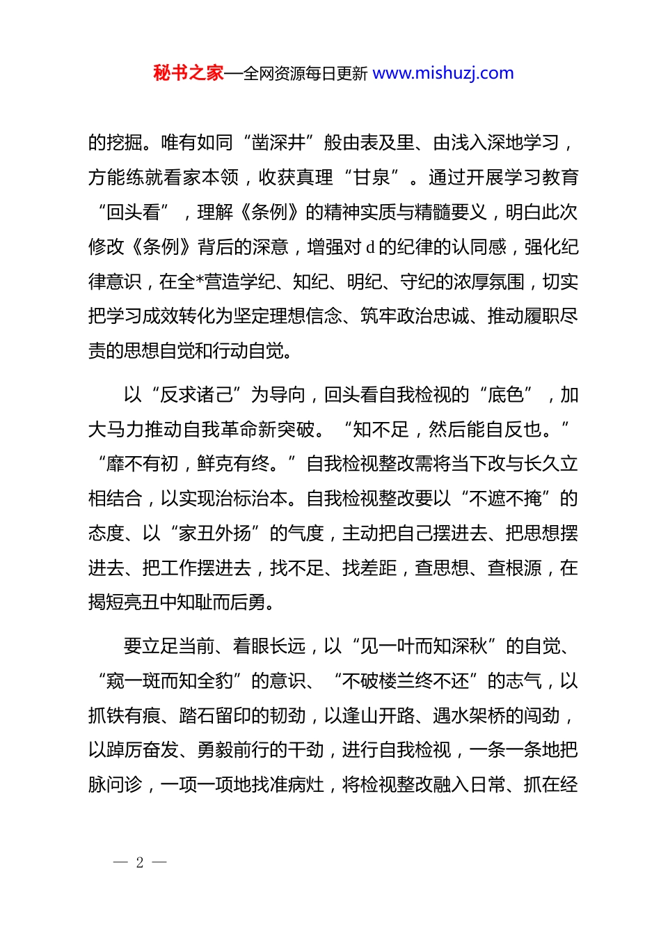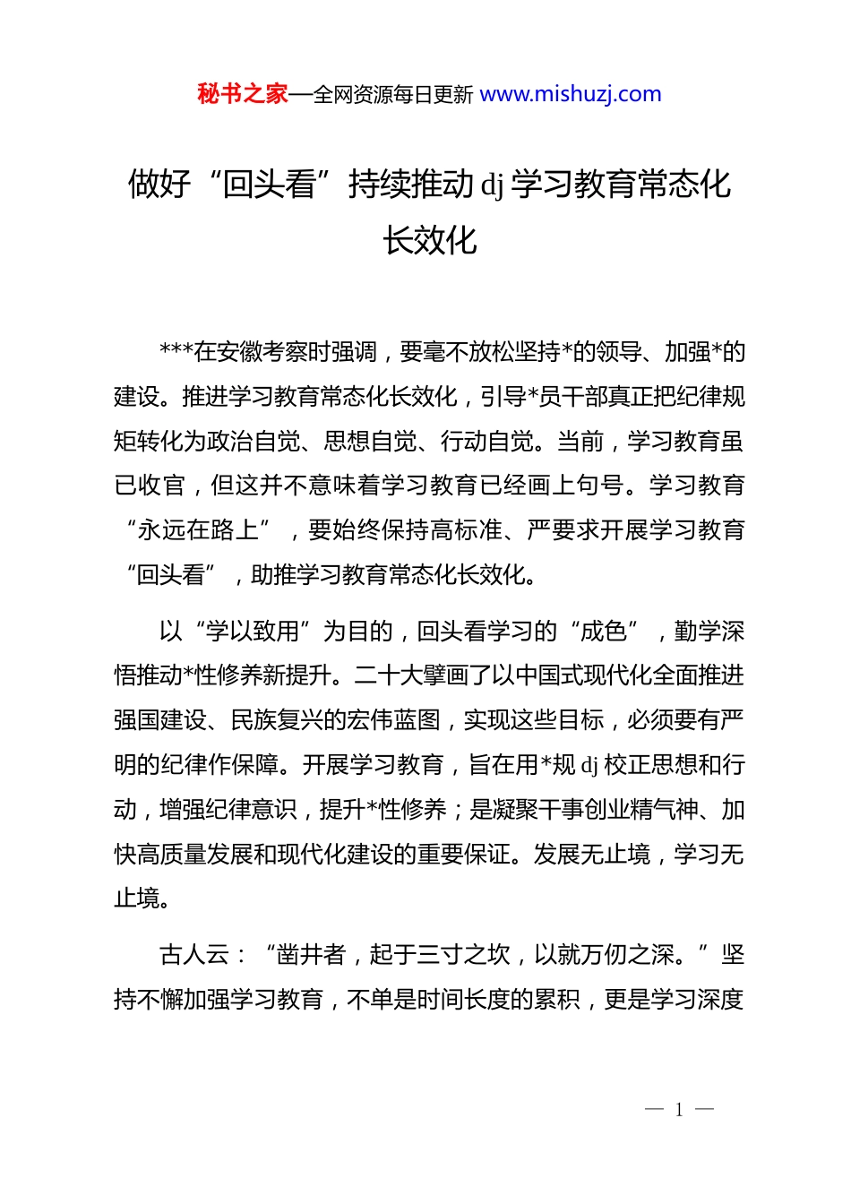 秘书之家—全网资源每日更新 www.mishuzj.com做好“回头看”持续推动 dj 学习教育常态化长效化***在安徽考察时强调,要毫不放松坚持*的领导、加强*的建设。推进学习教育常态化长效化,引导*员干部真正把纪律规矩转化为政治自觉、思想自觉、行动自觉。当前,学习教育虽已收官,但这并不意味着学习教育已经画上句号。学习教育“永远在路上”,要始终保持高标准、严要求开展学习教育“回头看”,助推学习教育常态化长效化。以“学以致用”为目的,回头看学习的“成色”,勤学深悟推动*性修养新提升。二十大擘画了以中国式现代化全面推进强国建设、民族复兴的宏伟蓝图,实现这些目标,必须要有严明的纪律作保障。开展学习教育,旨在用*规 dj 校正思想和行动,增强纪律意识,提升*性修养;是凝聚干事创业精气神、加快高质量发展和现代化建设的重要保证。发展无止境,学习无止境。古人云:“凿井者,起于三寸之坎,以就万仞之深。”坚持不懈加强学习教育,不单是时间长度的累积,更是学习深度— 1 —秘书之家—全网资源每日更新 www.mishuzj.com的挖掘。唯有如同“凿深井”般由表及里、由浅入深地学习,方能练就看家本领,收获真理“甘泉”。通过开展学习教育“回头看”,理解《条例》的精神实质与精髓要义,明白此次修改《条例》背后的深意,增强对 d 的纪律的认同感,强化纪律意识,在全*营造学纪、知纪、明纪、守纪的浓厚氛围,切实把学习成效转化为坚定理想信念、筑牢政治忠诚、推动履职尽责的思想自觉和行动自觉。以“反求诸己”为导向,回头看自我检视的“底色”,加大马力推动自我革命新突破。“知不足,然后能自反也。”“靡不有初,鲜克有终。”自我检视整改需将当下改与长久立相结合,以实现治标治本。自我检视整改要以“不遮不掩”的态度、以“家丑外扬”的气度,主动把自己摆进去、把思想摆进去、把工作摆进去,找不足、找差距,查思想、查根源,在揭短亮丑中知耻而后勇。要立足当前、着眼长远,以“见一叶而知深秋”的自觉、“窥一斑而知全豹”的意识、“不破楼兰终不还”的志气,以抓铁有痕、踏石留印的韧劲,以逢山开路、遇水架桥的闯劲,以踔厉奋发、勇毅前行的干劲,进行自我检视,一条一条地把脉问诊,一项一项地找准病灶,将检视整改融入日常、抓在经— 2 —秘书之家—全网资源每日更新 www.mishuzj.com常,绵绵用力、久久为功,彻底铲除检视整改中的“病根”。以“担当作为”为落点,回头看人民群众的“脸色”,求真务实推动为民谋福上新台阶。学习的目的在于运用,*习教育是引导*员干部遵规守纪,始终牢记“全心全意为人民服务”的宗旨,把人民的利益放在首位,更好地服务人民。人民群众的满意,是检验学习教育工作成效的根本标准,是激励我们不断前行的动力源泉。要学以致用、学用相长,用*规 dj“内正其心”“外正其行”,真正把纪律挺在前面,进一步增强政治定力,提升担当作为的意识和能力,保持“见贤思齐焉,见不贤而内自省也”的自觉,从先进典型与反面案例的对比学习中坚定“人民至上”的政绩观,遇事先想群众诉求,干事先谋群众利益,把工作做到群众心坎上。要永葆一颗谦卑之心,时时、事事、处处照好 dj 铁规这面“镜子”,要主动听取意见建议,纠正偏差,走好风清气正的廉政大道,真心真意为群众办事,切实肩负起组织的信任、群众的期盼,切实把学习教育成效转化为一点一滴的具体行动,最终创造出不负人民、不负时代的新业绩。— 3 —
