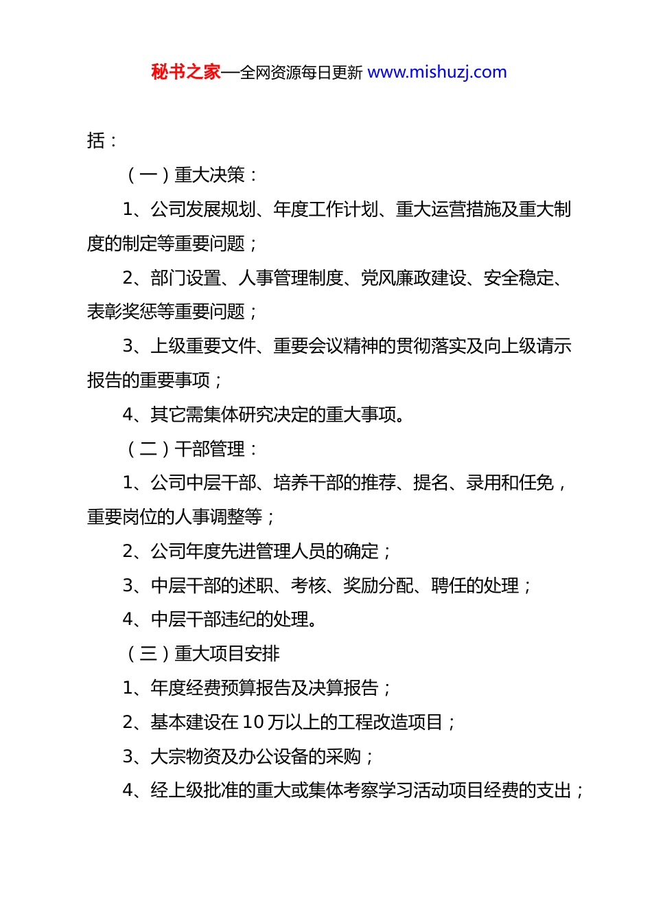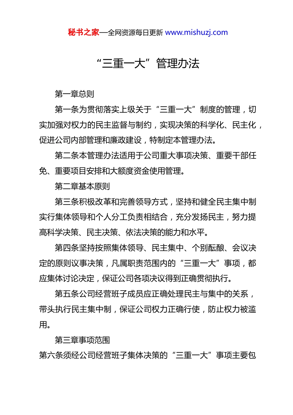 秘书之家—全网资源每日更新 www.mishuzj.com“三重一大”管理办法第一章总则第一条为贯彻落实上级关于“三重一大”制度的管理,切实加强对权力的民主监督与制约,实现决策的科学化、民主化,促进公司内部管理和廉政建设,特制定本管理办法。第二条本管理办法适用于公司重大事项决策、重要干部任免、重要项目安排和大额度资金使用管理。第二章基本原则第三条积极改革和完善领导方式,坚持和健全民主集中制实行集体领导和个人分工负责相结合,充分发扬民主,努力提高科学决策、民主决策、依法决策的能力和水平。第四条坚持按照集体领导、民主集中、个别酝酿、会议决定的原则议事决策,凡属职责范围内的“三重一大”事项,都应集体讨论决定,保证公司各项决议得到正确贯彻执行。第五条公司经营班子成员应正确处理民主与集中的关系,带头执行民主集中制,保证公司权力正确行使,防止权力被滥用。第三章事项范围第六条须经公司经营班子集体决策的“三重一大”事项主要包秘书之家—全网资源每日更新 www.mishuzj.com括:(一)重大决策:1、公司发展规划、年度工作计划、重大运营措施及重大制度的制定等重要问题;2、部门设置、人事管理制度、党风廉政建设、安全稳定、表彰奖惩等重要问题;3、上级重要文件、重要会议精神的贯彻落实及向上级请示报告的重要事项;4、其它需集体研究决定的重大事项。(二)干部管理:1、公司中层干部、培养干部的推荐、提名、录用和任免,重要岗位的人事调整等;2、公司年度先进管理人员的确定;3、中层干部的述职、考核、奖励分配、聘任的处理;4、中层干部违纪的处理。(三)重大项目安排1、年度经费预算报告及决算报告;2、基本建设在 10 万以上的工程改造项目;3、大宗物资及办公设备的采购;4、经上级批准的重大或集体考察学习活动项目经费的支出;秘书之家—全网资源每日更新 www.mishuzj.com5、重大项目投资考察的接待支出。(四)大额度资金使用管理1、单项支出在 500000 元以上(含伍拾万元)的资金款项;第四章程序第七条凡属“三重一大”事项,除遇重大突发事件或紧急情况外,应由公司经营班子集体讨论决定,不得以传阅会签或个别征求意见等方式代替集体决策。第八条经营班子决策应包括以下主要阶段:(一)酝酿决策1、涉及重大事项决策问题,应根据实际情况,经公司总经理或分管副总经理、班子成员酝酿,提出初步设想并进行广泛深入的调查研究。对专业性、技术性强的事项,应进行专家认证、技术咨询、决策评估;对与公司员工利益密切相关的事项,应实行听证和公示制度,扩大员工参与度。在充分听取各方面意见的基础上,提交公司经营班子会议集体讨论。2、涉及重要干部任免,应根据公司《员工晋升及聘用管理办法》的规定,由公司办公室提出初步意见,通过民主推荐、组织考察、征求意见等必要程序,提交公司经营班子会议集体讨论作出任免决定。秘书之家—全网资源每日更新 www.mishuzj.com3、涉及重大项目安排,必须由承办部门在充分调查研究或论证的基础上提出方案和报告,经分管副总经理审阅同意后,提交经营班子会议上讨论通过。4、涉及大额度资金使用,必须由使用部门拟定支出计划或报告,报分管副总经理审阅同意后,提交经营班子会议讨论通过。5、“三重一大”事项决策前,经营班子可通过适当形式对有关议题进行酝酿,但不得作出决定或影响集体决策。6、提交经营班子审议的“三重一大”事项议题应按规定程序提出,除遇突发事件和紧急情况外,不得临时动议。议题的有关材料要在经营班子会召开前送达参加人员,并保证其有必要时间了解相关情况。(二)集体决策1、在经营班子决策“三重一大”事项会议上,经营班子成员应对决策建议逐个明确表示同意、不同意或缓议的意见,并说明理由。因故未到的经营班子成员,可以书面形式表示意见。经营班子主要负责人应在其他成员充分发表意见的基础上,最后发表意见。对讨论中意见分歧较大或发现有重大问题尚不清楚的,除在紧急情况下按多数意见执行外,应暂缓决策,待进一步调查研究后再作决策。秘书之家—全网资源每日更新 www.mishuzj.com2、经营班子的表决意见和理由等情况,应形成会议记录...
