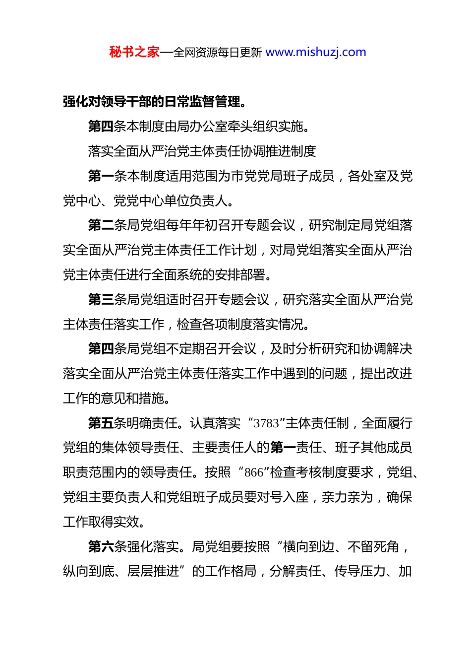 秘书之家—全网资源每日更新 www.mishuzj.com(15 篇)从严治党配套制度汇编落实全面从严治党主体责任专题会议制度第一条本制度适用范围为市党党局班子成员,各处室及党党中心、党党中心单位负责人。第二条专题会议召开时间:年初召开局系统干部大会,每半年召开一次汇报会,定期召开干部选拔任用及监督工作领导小组会议、干部监督工作联席会议。第三条会议主要任务1.年初局党组召开局系统干部大会,对市党党局落实全面从严治党主体责任作出全面安排部署。2.局党组每半年召开一次工作汇报会,听取班子成员和各处室及党党中心、党党中心落实全面从严治党主体责任情况汇报。3.适时召开专题会议,研究解决落实全面从严治党主体责任工作中出现的新问题,及时作出部署安排。4.定期召开有各处室参加的干部选拔任用工作领导小组会议,及时研究干部选拔任用及监督等工作。5.定期召开干部监督工作联席会议,由办公室和纪检部门组织各相关处室及党党中心、党党中心参加,加强联系与沟通,秘书之家—全网资源每日更新 www.mishuzj.com强化对领导干部的日常监督管理。第四条本制度由局办公室牵头组织实施。落实全面从严治党主体责任协调推进制度第一条本制度适用范围为市党党局班子成员,各处室及党党中心、党党中心单位负责人。第二条局党组每年年初召开专题会议,研究制定局党组落实全面从严治党主体责任工作计划,对局党组落实全面从严治党主体责任进行全面系统的安排部署。第三条局党组适时召开专题会议,研究落实全面从严治党主体责任落实工作,检查各项制度落实情况。第四条局党组不定期召开会议,及时分析研究和协调解决落实全面从严治党主体责任落实工作中遇到的问题,提出改进工作的意见和措施。第五条明确责任。认真落实“3783”主体责任制,全面履行党组的集体领导责任、主要责任人的第一责任、班子其他成员职责范围内的领导责任。按照“866”检查考核制度要求,党组、党组主要负责人和党组班子成员要对号入座,亲力亲为,确保工作取得实效。第六条强化落实。局党组要按照“横向到边、不留死角,纵向到底、层层推进”的工作格局,分解责任、传导压力、加秘书之家—全网资源每日更新 www.mishuzj.com强督查、考核评价、责任追究,在局系统内开展“八查八促”活动,形成一级抓一级,上下齐动手的工作氛围。局党组成员要按照各自工作要求和责任分工,把党风廉政建设具体要求和反腐败各项任务,落实到各级领导干部身上和每个岗位环节之中,形成“党员齐动手、群众齐参与”的党风廉政建设和反腐败斗争新格局。第七条局党组要把落实全面从严治党主体责任作为一项重大政治任务,列入重要议事日程。把落实主体责任与党的建设、干部队伍建设、业务工作等工作一起部署、一起检查、一起落实、一起考核,做到两手抓,两手都要硬。第八条本制度由局办公室牵头组织实施。落实全面从严治党主体责任图表分解责任制度第一条本制度适用范围为市党党局班子成员,各处室及党党中心、党党中心单位负责人。第二条按照市委落实全面从严治党主体责任工作要求,通过责任分解、责任考核、责任追究三个环节,推进市党党局党组落实全面从严治党主体责任任务分解落实工作。第三条坚持落实全面从严治党党组主体责任的原则,把全面从严治党纳入到重要议事日程,与各项业务工作同部署、同落实、同检查、同考核。秘书之家—全网资源每日更新 www.mishuzj.com第四条落实全面从严治党各项工作任务通过签订《目标责任书》和责任分解图表的形式,层层分解,责任到人,传导压力。《目标责任书》包括:主体责任清单、监督责任清单、落实责任负面清单、问责处理等方面的内容。责任分解图表包括:工作任务、具体内容、总目标、阶段性目标、具体任务和重点举措、责任单位等要素。第五条每年第一季度,完成《目标责任书》的签订和责任图表的分解,年底与其他业务工作同步考核。第六条党党中心、党党中心参照本制度,层层签订《目标责任书》,制定责任分解图表,切实做好本单位落实全面从严治党主体责任的工作落实。第七条本制度由局办公室牵头组织实施。落实全面从严治党主体责任签字背书制度第一条本制度适用范围为市党党...