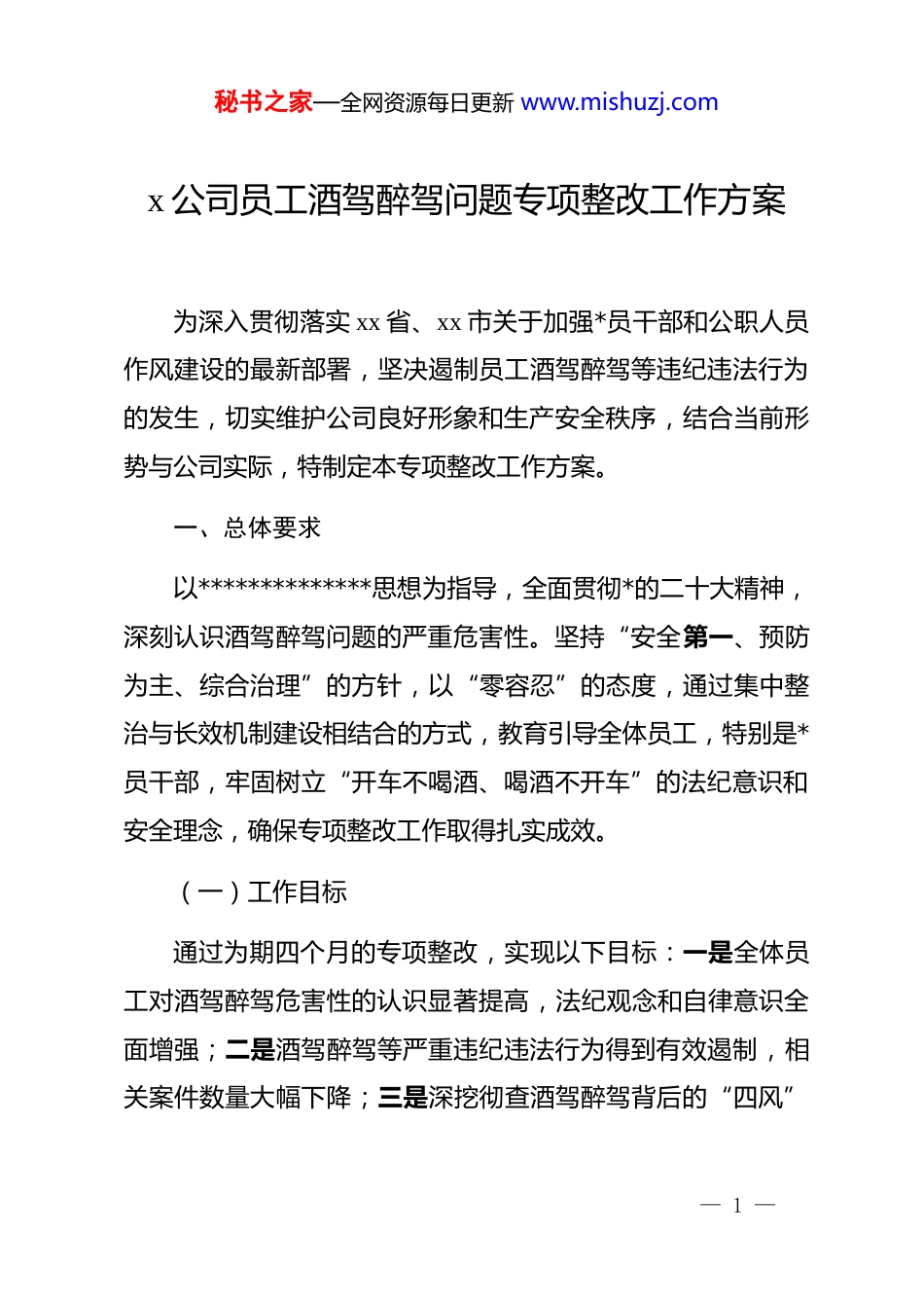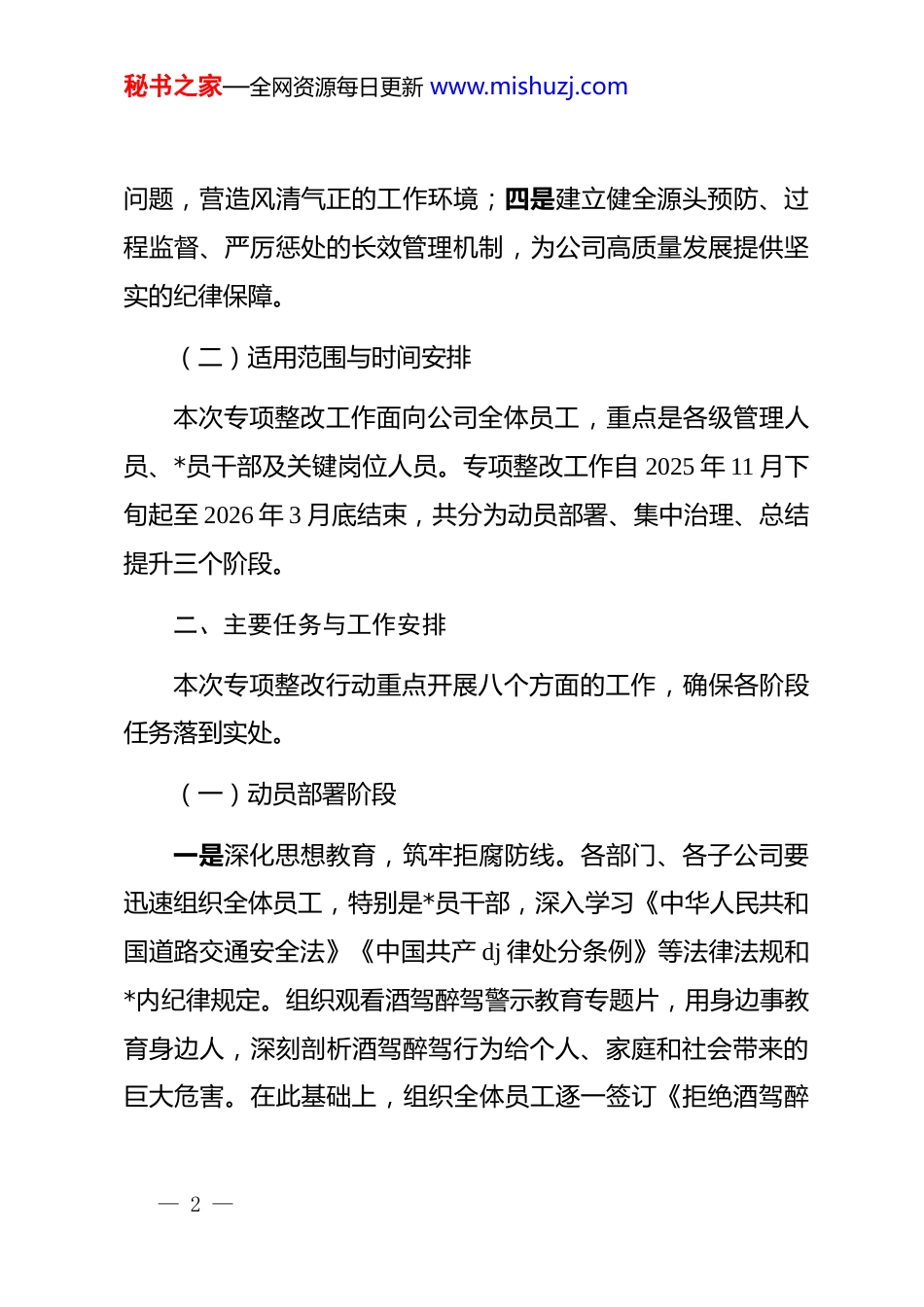 秘书之家—全网资源每日更新 www.mishuzj.comx 公司员工酒驾醉驾问题专项整改工作方案为深入贯彻落实 xx 省、xx 市关于加强*员干部和公职人员作风建设的最新部署,坚决遏制员工酒驾醉驾等违纪违法行为的发生,切实维护公司良好形象和生产安全秩序,结合当前形势与公司实际,特制定本专项整改工作方案。一、总体要求以**************思想为指导,全面贯彻*的二十大精神,深刻认识酒驾醉驾问题的严重危害性。坚持“安全第一、预防为主、综合治理”的方针,以“零容忍”的态度,通过集中整治与长效机制建设相结合的方式,教育引导全体员工,特别是*员干部,牢固树立“开车不喝酒、喝酒不开车”的法纪意识和安全理念,确保专项整改工作取得扎实成效。(一)工作目标通过为期四个月的专项整改,实现以下目标:一是全体员工对酒驾醉驾危害性的认识显著提高,法纪观念和自律意识全面增强;二是酒驾醉驾等严重违纪违法行为得到有效遏制,相关案件数量大幅下降;三是深挖彻查酒驾醉驾背后的“四风”— 1 —秘书之家—全网资源每日更新 www.mishuzj.com问题,营造风清气正的工作环境;四是建立健全源头预防、过程监督、严厉惩处的长效管理机制,为公司高质量发展提供坚实的纪律保障。(二)适用范围与时间安排本次专项整改工作面向公司全体员工,重点是各级管理人员、*员干部及关键岗位人员。专项整改工作自 2025 年 11 月下旬起至 2026 年 3 月底结束,共分为动员部署、集中治理、总结提升三个阶段。二、主要任务与工作安排本次专项整改行动重点开展八个方面的工作,确保各阶段任务落到实处。(一)动员部署阶段一是深化思想教育,筑牢拒腐防线。各部门、各子公司要迅速组织全体员工,特别是*员干部,深入学习《中华人民共和国道路交通安全法》《中国共产 dj 律处分条例》等法律法规和*内纪律规定。组织观看酒驾醉驾警示教育专题片,用身边事教育身边人,深刻剖析酒驾醉驾行为给个人、家庭和社会带来的巨大危害。在此基础上,组织全体员工逐一签订《拒绝酒驾醉— 2 —秘书之家—全网资源每日更新 www.mishuzj.com驾承诺书》,确保思想认识和行动承诺全覆盖,引导员工从内心深处敬畏法律、敬畏纪律。二是强化宣传引导,营造浓厚氛围。充分利用公司内部网站、微信公众号、宣传栏、电子显示屏等多种宣传载体,全方位、多角度宣传酒驾醉驾的危害性、相关法律法规以及本次专项整改工作的部署要求。联合市场监管部门、公安交管部门,在公司周边及员工经常出入的酒店、餐馆等涉酒场所,张贴宣传海报,开展“拒绝酒驾、平安回家”主题劝阻活动,推动形成全社会共同抵制酒驾醉驾的良好风气。(二)集中治理阶段三是全面排查线索,实施精准打击。公司纪检部门将主动对接 xx 市公安机关交通管理部门,对 2025 年以来涉及本公司员工的酒驾醉驾案件线索进行一次全面起底和梳理。建立问题线索台账,对公安机关移交或通报的案件线索,做到快速响应、及时交办、全程督办,确保不遗漏任何一条线索。四是加强联动查处,保持高压态势。积极配合公安机关每月至少开展 2 次专项检查行动,尤其在节假日、周末及夜间等重点时段,在重点路段加大对涉酒驾驶行为的查处力度。督促— 3 —秘书之家—全网资源每日更新 www.mishuzj.com公安机关在查获涉嫌酒驾醉驾人员后,第一时间进行身份比对,如涉及本公司员工,应在 24 小时内将相关信息通报至公司纪检部门,为后续依纪依规处理提供及时、准确的依据。五是深挖背后问题,根除作风顽疾。公司纪检部门在收到问题线索后,成立专项核查组,不仅要查清员工酒驾醉驾的事实、性质和情节,更要严格落实“四必查”要求,即:必查饮酒原因、必查参与人员、必查饮酒场所、必查费用来源。深挖彻查其背后是否存在公款吃喝、违规接受宴请、使用公车等隐形变异的“四风”问题。对组织、参与违规吃喝的人员,无论是否涉及酒驾醉驾,均要依规依纪严肃处理,坚决斩断由“酒杯”伸向腐败的利益链条。六是严格监督执纪,防止内外包庇。加强对案件办理全过程的监督,严肃查处在案件处理过程中可能出现的隐瞒不报、压案不查、降格处理、包庇袒护、说情抹案等...