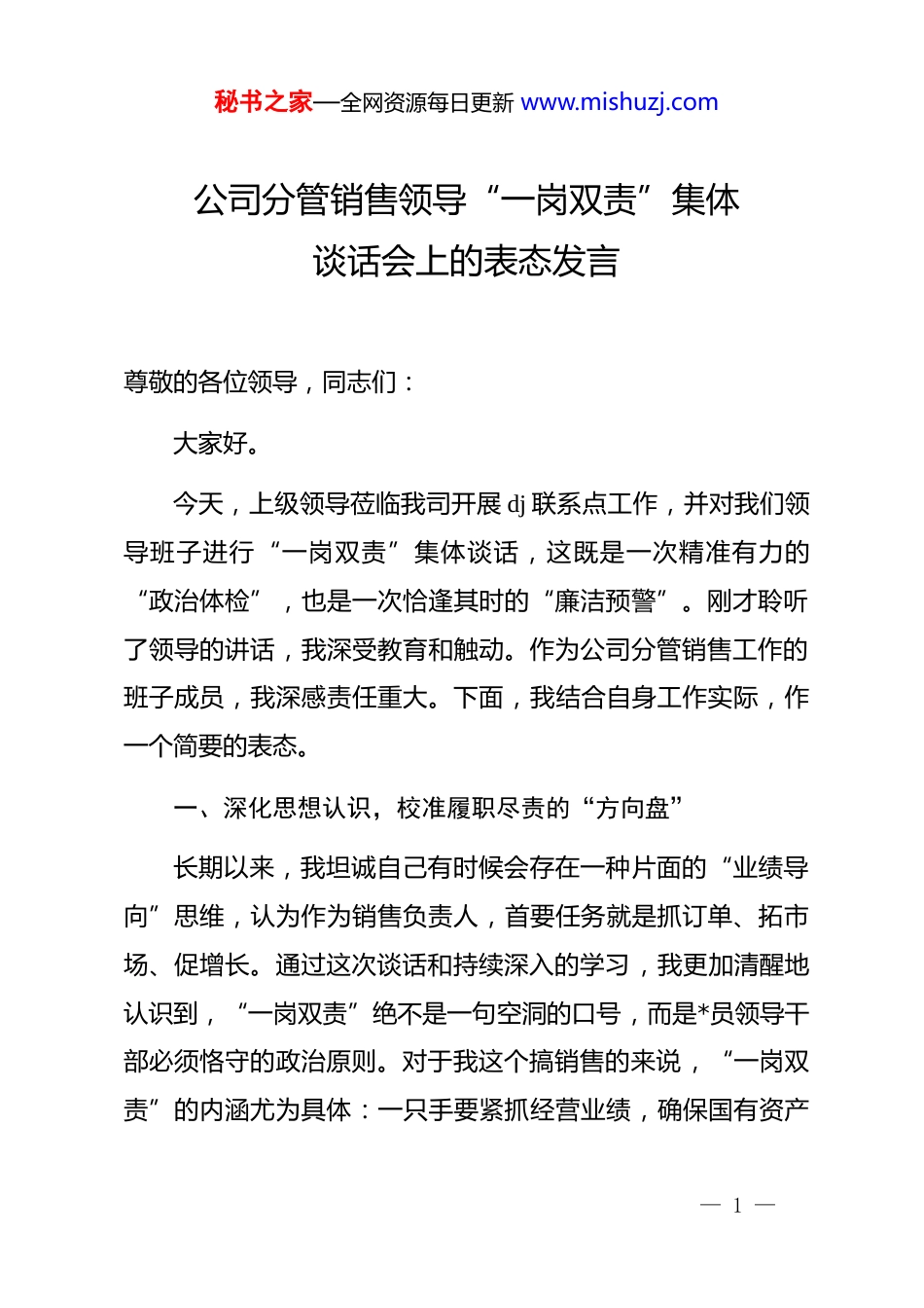 秘书之家—全网资源每日更新 www.mishuzj.com公司分管销售领导“一岗双责”集体谈话会上的表态发言尊敬的各位领导,同志们:大家好。今天,上级领导莅临我司开展 dj 联系点工作,并对我们领导班子进行“一岗双责”集体谈话,这既是一次精准有力的“政治体检”,也是一次恰逢其时的“廉洁预警”。刚才聆听了领导的讲话,我深受教育和触动。作为公司分管销售工作的班子成员,我深感责任重大。下面,我结合自身工作实际,作一个简要的表态。一、深化思想认识,校准履职尽责的“方向盘”长期以来,我坦诚自己有时候会存在一种片面的“业绩导向”思维,认为作为销售负责人,首要任务就是抓订单、拓市场、促增长。通过这次谈话和持续深入的学习,我更加清醒地认识到,“一岗双责”绝不是一句空洞的口号,而是*员领导干部必须恪守的政治原则。对于我这个搞销售的来说,“一岗双责”的内涵尤为具体:一只手要紧抓经营业绩,确保国有资产— 1 —秘书之家—全网资源每日更新 www.mishuzj.com保值增值;另一只手更要铁腕抓廉洁建设,确保销售队伍风清气正。如果说,业务指标是驱动公司发展的“油门”,那么*风廉政建设就是保障行稳致远的“刹车”。两者相辅相成,缺一不可。尤其我们作为关系国计民生的食盐专营企业,我们的销售行为不仅关乎经济效益,更直接关联着市场稳定与企业形象。因此,我必须从讲政治的高度,深刻理解并坚决扛起这份双重责任,做到两手抓、两手都要硬,确保销售工作始终在正确、健康的轨道上运行。二、对镜深刻自查,找准业务领域的“风险点”对照上级领导的要求,结合当前销售工作的特点和环境,我对自己分管的领域进行了深刻反思。我认识到,销售岗位因其与市场、客户、资金紧密接触的特性,是廉洁风险的高发地带。在日常工作中,必须时刻保持警醒,精准识别并有效防控以下几个关键风险点:第一,是业务往来中的“人情”与“交易”风险。销售工作免不了要和各色各样的客户、经销商打交道。在这个过程中,如何把握“亲”“清”关系,既热情服务,又守住底线,是一— 2 —秘书之家—全网资源每日更新 www.mishuzj.com个巨大的考验。面对可能出现的利益输送、商业回扣、违规让利等诱惑稍有不慎就可能滑向深渊。第二,是营销费用上的“模糊”与“擦边”风险。销售活动伴随着大量的市场推广费、客户招待费、差旅费等。这些费用的审批和使用是否完全合规透明,是否存在虚列开支、公款私用等问题,是廉洁防控的重中之重。必须防止以“业务需要”为名,行“违规操作”之实。第三,是团队管理上的“失管”与“失察”风险。作为分管领导,我不仅要对自己的行为负责,更要对整个销售团队的廉洁状况负责。如果满足于只管业务、不问思想,只看业绩、不察作风,就可能导致对团队成员中出现的苗头性、倾向性问题发现不及时、制止不力,从而出现管理“真空”,酿成大错。我将以本次集团公司通报的典型案例为镜鉴主动借鉴兄弟单位梳理廉洁风险“谈话清单”的做法,在销售系统内部组织一次全面的廉洁风险点大排查,建立动态更新的风险防控清单,确保压力传导到每一位员工。三、坚决郑重表态,拧紧廉洁自律的“总开关”知是行之始,行是知之成。在此,我向上级领导和公司*委— 3 —秘书之家—全网资源每日更新 www.mishuzj.com郑重作出如下承诺:首先,我承诺当好“领头雁”,在廉洁自律上做出表率。我将带头深入学习《中国共产*廉洁自律准则》和中央八项规定及其实施细则精神,并签署和恪守个人廉洁从业承诺书。要求团队做到的,我第一个做到;禁止团队去做的,我第一个带头不做。同时,严格管好家人、亲属和身边工作人员,涵养清廉家风,自觉净化自己的“社交圈”和“生活圈”。其次,我承诺种好“责任田”,在管*治*上敢于担当。我将坚决摒弃“老好人”思想,切实履行好对分管领域干部员工的教育、管理和监督职责。坚持把纪律和规矩挺在前面,定期与销售团队的关键岗位人员开展廉政谈心谈话,对发现的苗头性问题及时“咬耳扯袖”,做到抓早抓小、防微杜渐,绝不姑息纵容,坚决防止“破窗效应”。最后,我承诺架好“高压线”,在制度执行上绝不含糊。制度的生命力在于执行...