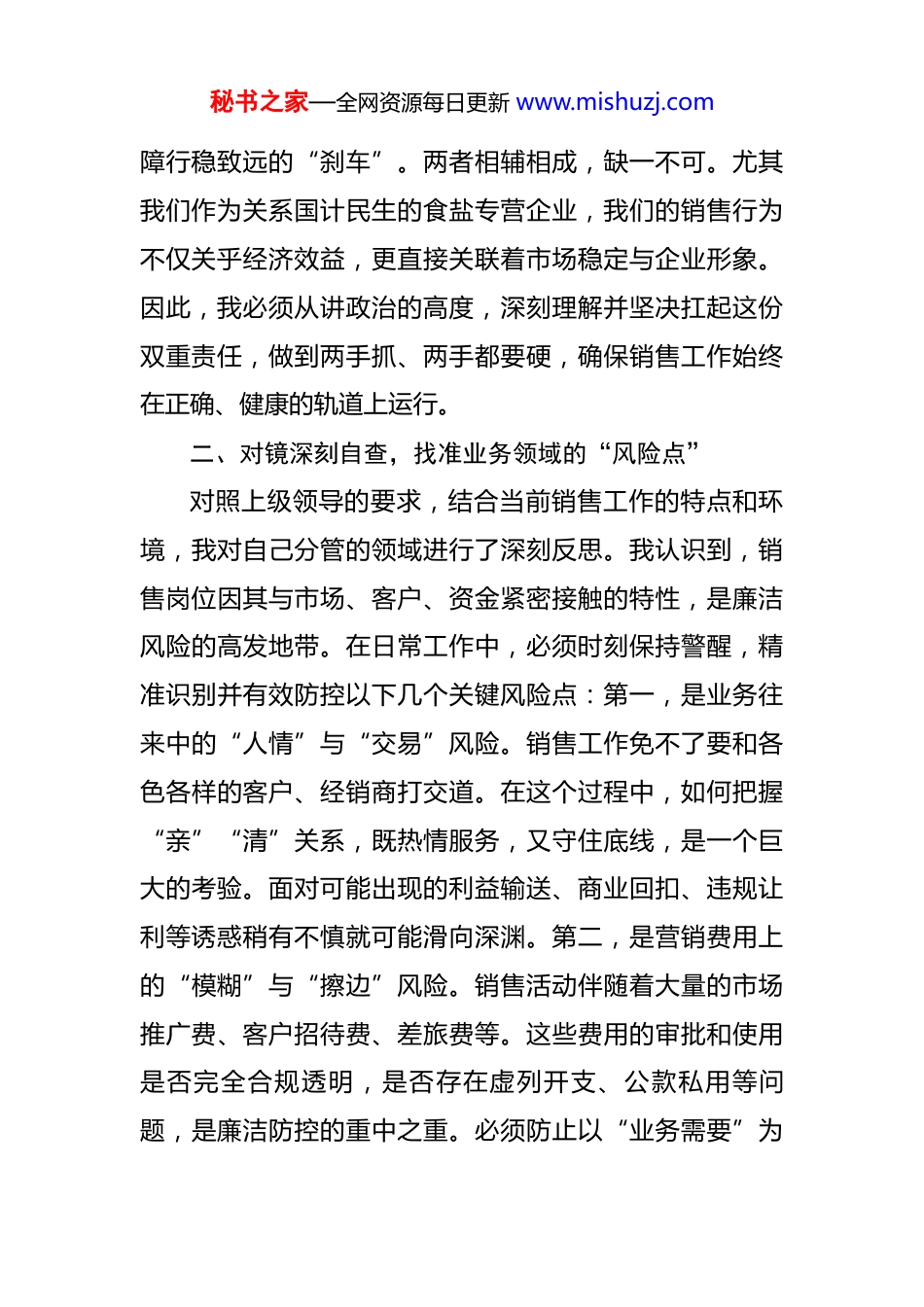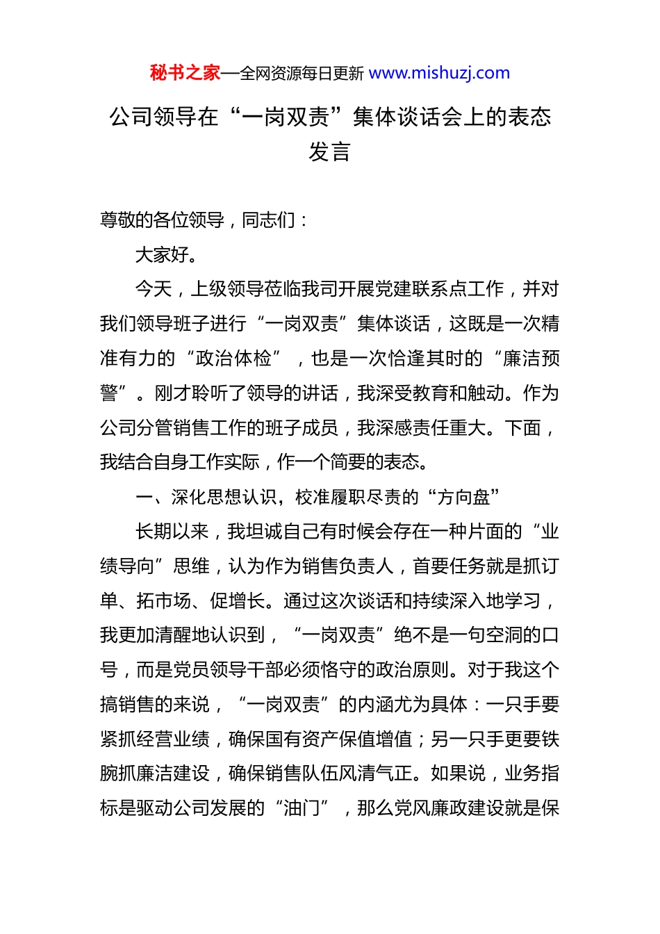秘书之家—全网资源每日更新 www.mishuzj.com公司领导在“一岗双责”集体谈话会上的表态发言 尊敬的各位领导,同志们:大家好。今天,上级领导莅临我司开展党建联系点工作,并对我们领导班子进行“一岗双责”集体谈话,这既是一次精准有力的“政治体检”,也是一次恰逢其时的“廉洁预警”。刚才聆听了领导的讲话,我深受教育和触动。作为公司分管销售工作的班子成员,我深感责任重大。下面,我结合自身工作实际,作一个简要的表态。一、深化思想认识,校准履职尽责的“方向盘”长期以来,我坦诚自己有时候会存在一种片面的“业绩导向”思维,认为作为销售负责人,首要任务就是抓订单、拓市场、促增长。通过这次谈话和持续深入地学习,我更加清醒地认识到,“一岗双责”绝不是一句空洞的口号,而是党员领导干部必须恪守的政治原则。对于我这个搞销售的来说,“一岗双责”的内涵尤为具体:一只手要紧抓经营业绩,确保国有资产保值增值;另一只手更要铁腕抓廉洁建设,确保销售队伍风清气正。如果说,业务指标是驱动公司发展的“油门”,那么党风廉政建设就是保秘书之家—全网资源每日更新 www.mishuzj.com障行稳致远的“刹车”。两者相辅相成,缺一不可。尤其我们作为关系国计民生的食盐专营企业,我们的销售行为不仅关乎经济效益,更直接关联着市场稳定与企业形象。因此,我必须从讲政治的高度,深刻理解并坚决扛起这份双重责任,做到两手抓、两手都要硬,确保销售工作始终在正确、健康的轨道上运行。二、对镜深刻自查,找准业务领域的“风险点”对照上级领导的要求,结合当前销售工作的特点和环境,我对自己分管的领域进行了深刻反思。我认识到,销售岗位因其与市场、客户、资金紧密接触的特性,是廉洁风险的高发地带。在日常工作中,必须时刻保持警醒,精准识别并有效防控以下几个关键风险点:第一,是业务往来中的“人情”与“交易”风险。销售工作免不了要和各色各样的客户、经销商打交道。在这个过程中,如何把握“亲”“清”关系,既热情服务,又守住底线,是一个巨大的考验。面对可能出现的利益输送、商业回扣、违规让利等诱惑稍有不慎就可能滑向深渊。第二,是营销费用上的“模糊”与“擦边”风险。销售活动伴随着大量的市场推广费、客户招待费、差旅费等。这些费用的审批和使用是否完全合规透明,是否存在虚列开支、公款私用等问题,是廉洁防控的重中之重。必须防止以“业务需要”为秘书之家—全网资源每日更新 www.mishuzj.com名,行“违规操作”之实。第三,是团队管理上的“失管”与“失察”风险。作为分管领导,我不仅要对自己的行为负责,更要对整个销售团队的廉洁状况负责。如果满足于只管业务、不问思想,只看业绩、不察作风,就可能导致对团队成员中出现的苗头性、倾向性问题发现不及时、制止不力,从而出现管理“真空”,酿成大错。我将以本次集团公司通报的典型案例为镜鉴主动借鉴兄弟单位梳理廉洁风险“谈话清单”的做法,在销售系统内部组织一次全面的廉洁风险点大排查,建立动态更新的风险防控清单,确保压力传导到每一位员工。三、坚决郑重表态,拧紧廉洁自律的“总开关”知是行之始,行是知之成。在此,我向上级领导和公司党委郑重作出如下承诺:首先,我承诺当好“领头雁”,在廉洁自律上做出表率。我将带头深入学习《中国共产党廉洁自律准则》和中央八项规定及其实施细则精神,并签署和恪守个人廉洁从业承诺书。要求团队做到的,我第一个做到;禁止团队去做的,我第一个带头不做。同时,严格管好家人、亲属和身边工作人员,涵养清廉家风,自觉净化自己的“社交圈”和“生活圈”。其次,我承诺种好“责任田”,在管党治党上敢于担当。我将坚决摒弃“老好人”思想,切实履行好对分管领域干部秘书之家—全网资源每日更新 www.mishuzj.com员工的教育、管理和监督职责。坚持把纪律和规矩挺在前面,定期与销售团队的关键岗位人员开展廉政谈心谈话,对发现的苗头性问题及时“咬耳扯袖”,做到抓早抓小、防微杜渐,绝不姑息纵容,坚决防止“破窗效应”。最后,我承诺架好“高压线”,在制度执行上绝不含糊。制度的生命力在于执行。我将带头维护公司各项规章制...