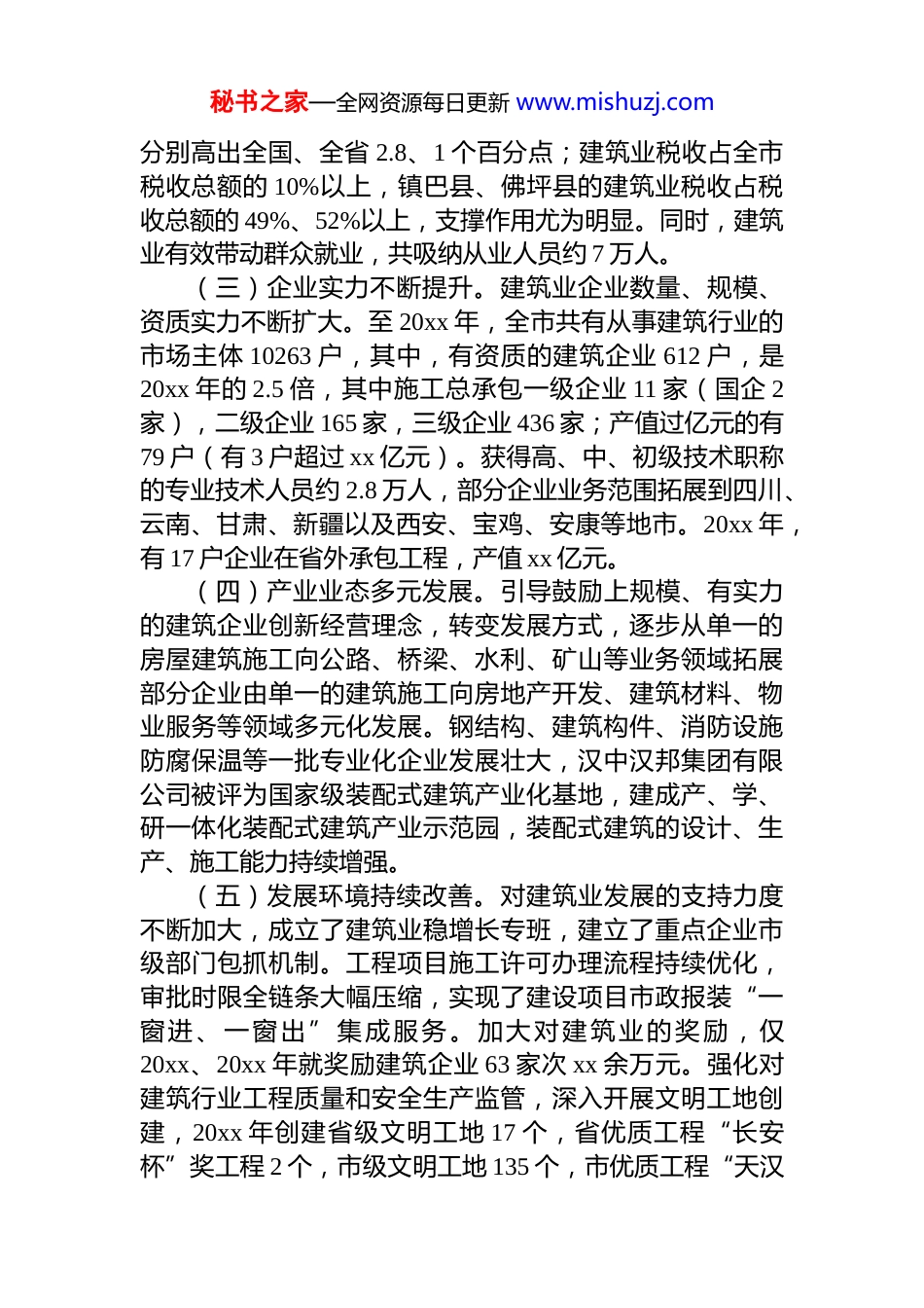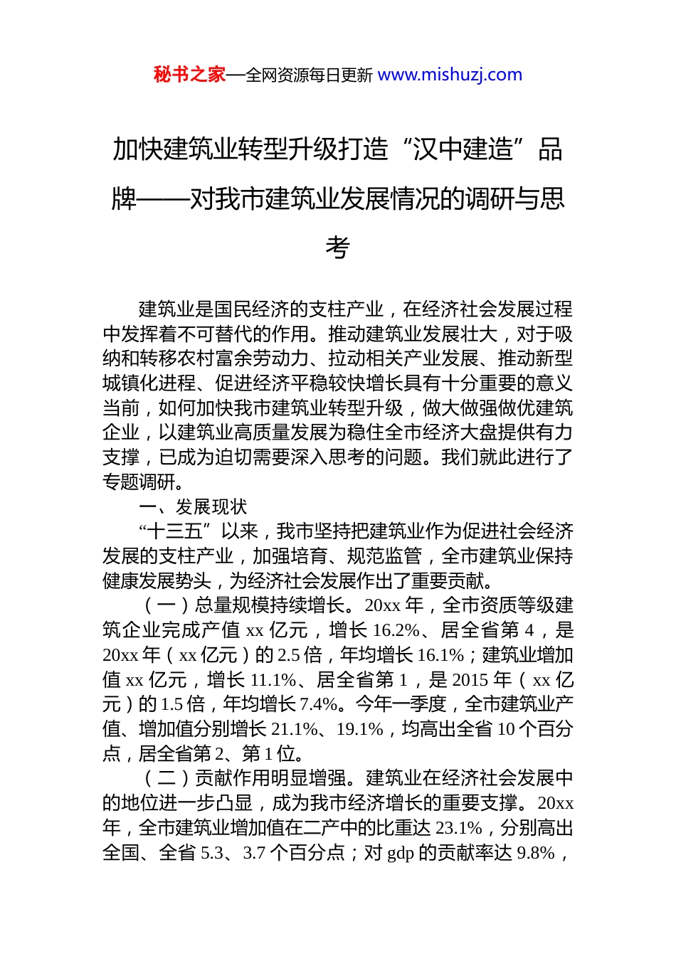 秘书之家—全网资源每日更新 www.mishuzj.com加快建筑业转型升级打造“汉中建造”品牌——对我市建筑业发展情况的调研与思考建筑业是国民经济的支柱产业,在经济社会发展过程中发挥着不可替代的作用。推动建筑业发展壮大,对于吸纳和转移农村富余劳动力、拉动相关产业发展、推动新型城镇化进程、促进经济平稳较快增长具有十分重要的意义当前,如何加快我市建筑业转型升级,做大做强做优建筑企业,以建筑业高质量发展为稳住全市经济大盘提供有力支撑,已成为迫切需要深入思考的问题。我们就此进行了专题调研。一、发展现状“十三五”以来,我市坚持把建筑业作为促进社会经济发展的支柱产业,加强培育、规范监管,全市建筑业保持健康发展势头,为经济社会发展作出了重要贡献。(一)总量规模持续增长。20xx 年,全市资质等级建筑企业完成产值 xx 亿元,增长 16.2%、居全省第 4,是20xx 年(xx 亿元)的 2.5 倍,年均增长 16.1%;建筑业增加值 xx 亿元,增长 11.1%、居全省第 1,是 2015 年(xx 亿元)的 1.5 倍,年均增长 7.4%。今年一季度,全市建筑业产值、增加值分别增长 21.1%、19.1%,均高出全省 10 个百分点,居全省第 2、第 1 位。(二)贡献作用明显增强。建筑业在经济社会发展中的地位进一步凸显,成为我市经济增长的重要支撑。20xx年,全市建筑业增加值在二产中的比重达 23.1%,分别高出全国、全省 5.3、3.7 个百分点;对 gdp 的贡献率达 9.8%,秘书之家—全网资源每日更新 www.mishuzj.com分别高出全国、全省 2.8、1 个百分点;建筑业税收占全市税收总额的 10%以上,镇巴县、佛坪县的建筑业税收占税收总额的 49%、52%以上,支撑作用尤为明显。同时,建筑业有效带动群众就业,共吸纳从业人员约 7 万人。(三)企业实力不断提升。建筑业企业数量、规模、资质实力不断扩大。至 20xx 年,全市共有从事建筑行业的市场主体 10263 户,其中,有资质的建筑企业 612 户,是20xx 年的 2.5 倍,其中施工总承包一级企业 11 家(国企 2家),二级企业 165 家,三级企业 436 家;产值过亿元的有79 户(有 3 户超过 xx 亿元)。获得高、中、初级技术职称的专业技术人员约 2.8 万人,部分企业业务范围拓展到四川、云南、甘肃、新疆以及西安、宝鸡、安康等地市。20xx 年,有 17 户企业在省外承包工程,产值 xx 亿元。(四)产业业态多元发展。引导鼓励上规模、有实力的建筑企业创新经营理念,转变发展方式,逐步从单一的房屋建筑施工向公路、桥梁、水利、矿山等业务领域拓展部分企业由单一的建筑施工向房地产开发、建筑材料、物业服务等领域多元化发展。钢结构、建筑构件、消防设施防腐保温等一批专业化企业发展壮大,汉中汉邦集团有限公司被评为国家级装配式建筑产业化基地,建成产、学、研一体化装配式建筑产业示范园,装配式建筑的设计、生产、施工能力持续增强。(五)发展环境持续改善。对建筑业发展的支持力度不断加大,成立了建筑业稳增长专班,建立了重点企业市级部门包抓机制。工程项目施工许可办理流程持续优化,审批时限全链条大幅压缩,实现了建设项目市政报装“一窗进、一窗出”集成服务。加大对建筑业的奖励,仅20xx、20xx 年就奖励建筑企业 63 家次 xx 余万元。强化对建筑行业工程质量和安全生产监管,深入开展文明工地创建,20xx 年创建省级文明工地 17 个,省优质工程“长安杯”奖工程 2 个,市级文明工地 135 个,市优质工程“天汉秘书之家—全网资源每日更新 www.mishuzj.com杯”奖工程 5 个。二、困难问题虽然我市建筑业发展取得了一定成绩,但是也存在一些明显不足和突出问题。一是总量规模有待扩大。2021 年,我市建筑业总产值仅占全省的 3.9%、居全省第 5 位,与排名之前地市相比,总产值与榆林相差 xx 亿元,只占咸阳 42%、宝鸡 30%、西安 6.6%;建筑业增加值仅占全省的 6.5%,居全省第 4 位,与排名之前地市相比,增加值与咸阳相差 xx 亿元,只占宝鸡 68%、西安 11%。二是企业竞争力亟需提升。从我市实际情况来看,尽管从事与建筑业相关的市场主体已超过万...