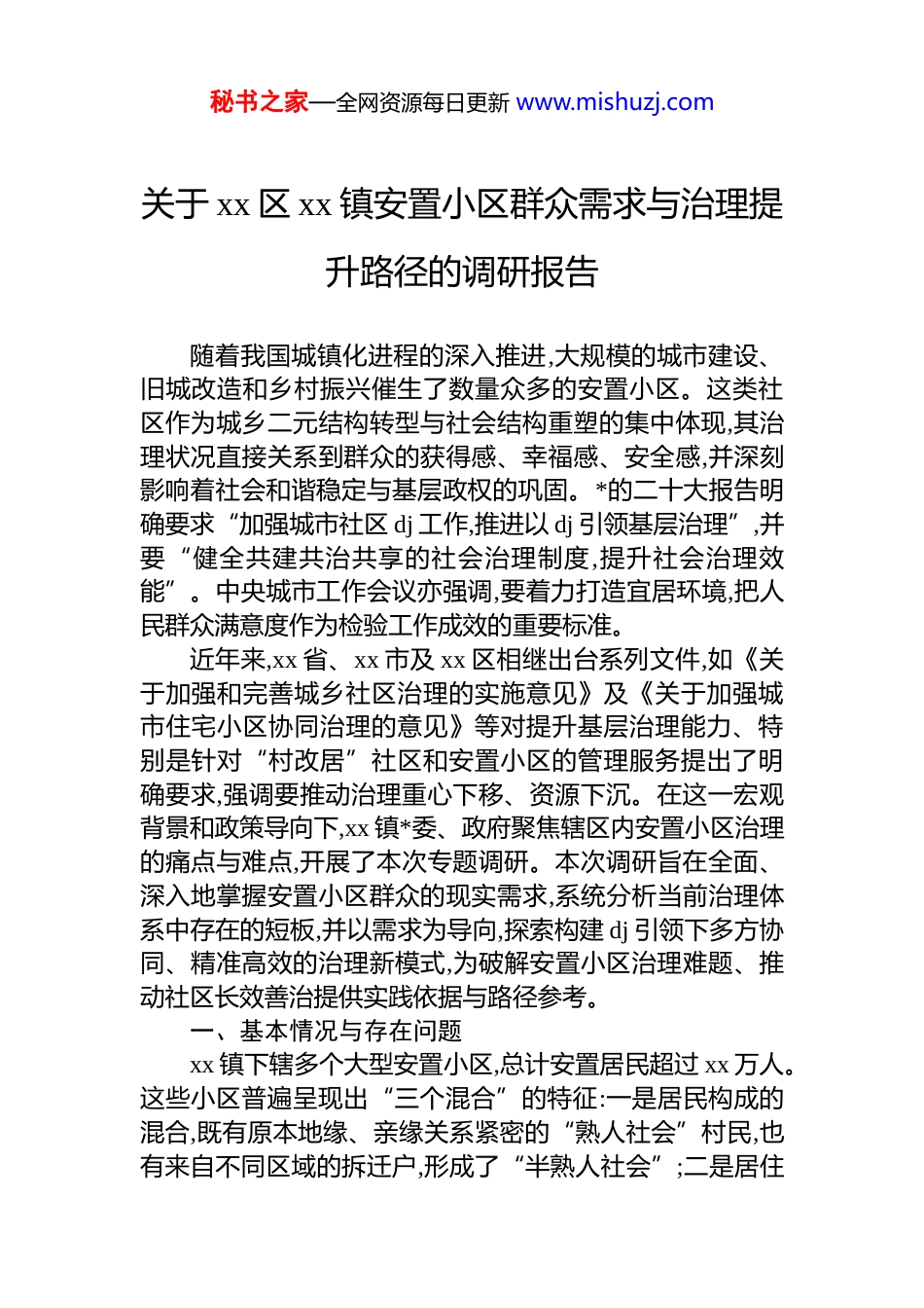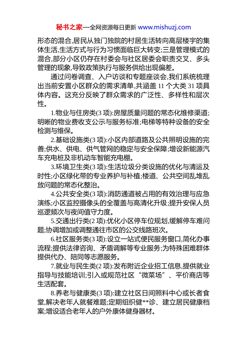 秘书之家—全网资源每日更新 www.mishuzj.com关于 xx 区 xx 镇安置小区群众需求与治理提升路径的调研报告 随着我国城镇化进程的深入推进,大规模的城市建设、旧城改造和乡村振兴催生了数量众多的安置小区。这类社区作为城乡二元结构转型与社会结构重塑的集中体现,其治理状况直接关系到群众的获得感、幸福感、安全感,并深刻影响着社会和谐稳定与基层政权的巩固。*的二十大报告明确要求“加强城市社区 dj 工作,推进以 dj 引领基层治理”,并要“健全共建共治共享的社会治理制度,提升社会治理效能”。中央城市工作会议亦强调,要着力打造宜居环境,把人民群众满意度作为检验工作成效的重要标准。近年来,xx 省、xx 市及 xx 区相继出台系列文件,如《关于加强和完善城乡社区治理的实施意见》及《关于加强城市住宅小区协同治理的意见》等对提升基层治理能力、特别是针对“村改居”社区和安置小区的管理服务提出了明确要求,强调要推动治理重心下移、资源下沉。在这一宏观背景和政策导向下,xx 镇*委、政府聚焦辖区内安置小区治理的痛点与难点,开展了本次专题调研。本次调研旨在全面、深入地掌握安置小区群众的现实需求,系统分析当前治理体系中存在的短板,并以需求为导向,探索构建 dj 引领下多方协同、精准高效的治理新模式,为破解安置小区治理难题、推动社区长效善治提供实践依据与路径参考。一、基本情况与存在问题xx 镇下辖多个大型安置小区,总计安置居民超过 xx 万人。这些小区普遍呈现出“三个混合”的特征:一是居民构成的混合,既有原本地缘、亲缘关系紧密的“熟人社会”村民,也有来自不同区域的拆迁户,形成了“半熟人社会”;二是居住秘书之家—全网资源每日更新 www.mishuzj.com形态的混合,居民从独门独院的村居生活转向高层楼宇的集体生活,生活方式与行为习惯面临巨大转变;三是管理模式的混合,部分小区仍存在村委会与社区居委会职责交叉、多头管理的现象,导致政策执行与服务供给出现偏差。通过问卷调查、入户访谈和专题座谈会,我们系统梳理出当前安置小区群众的需求清单,共涵盖 11 个大类 31 项具体内容。这充分反映了群众需求的广泛性、多样性和层次性。1.物业与住房类(3 项):房屋质量问题的常态化维修渠道;明晰的物业费收支公示与服务标准;电梯等特种设备的安全检测与维保。2.基础设施类(3 项):小区内部道路及公共照明设施的完善;供水、供电、供气管网的稳定与安全保障;增设新能源汽车充电桩及非机动车智能充电棚。3.环境卫生类(3 项):生活垃圾分类设施的优化与清运及时性;小区绿化带的专业养护与补植;楼道、公共空间乱堆乱放问题的常态化整治。4.公共安全类(3 项):消防通道被占用的有效治理与应急演练;小区监控摄像头的全覆盖与高清化升级;提升安保人员巡逻频次与夜间值守力度。5.交通出行类(2 项):优化小区停车位规划,缓解停车难问题;协调增加或调整通往市区的公交线路班次。6.社区服务类(3 项):设立一站式便民服务窗口,简化办事流程;提供法律咨询、矛盾调解等专业服务;为特殊困难群体提供代办、陪同等志愿服务。7.就业与民生类(2 项):发布附近企业招工信息,提供就业指导与技能培训;引入或规范社区“微菜场”、平价商店等生活配套。8.养老与健康类(3 项):建立社区日间照料中心或长者食堂,解决老年人就餐难题;定期组织健**诊、建立居民健康档案;增设适合老年人的户外康体健身器材。秘书之家—全网资源每日更新 www.mishuzj.com9.教育与托育类(3 项):提供课后“四点半课堂”或假期托管服务;开辟儿童专属活动空间与安全游乐设施;组织家庭教育讲座与亲子活动。10.文体活动类(3 项):修缮或新建篮球场、乒乓球台等体育场地;利用公共空间打造邻里中心、书画室、棋牌室等活动阵地;组织传统节日庆典、趣味运动会等社区文化活动。11.治理与参与类(3 项):建立畅通的意见建议反馈渠道;推动业主委员会的规范选举与运作;希望更多地参与到小区公共事务的决策过程中。面对如此多元化、具体化的海量需求,仅依靠社区居委会“单打独斗”的传统模式已难以为继,治理工作暴露出诸多问题。主要体现在以下三个方面:(一)治理机制存在“权责不清”的错位现象。安置小区的管...