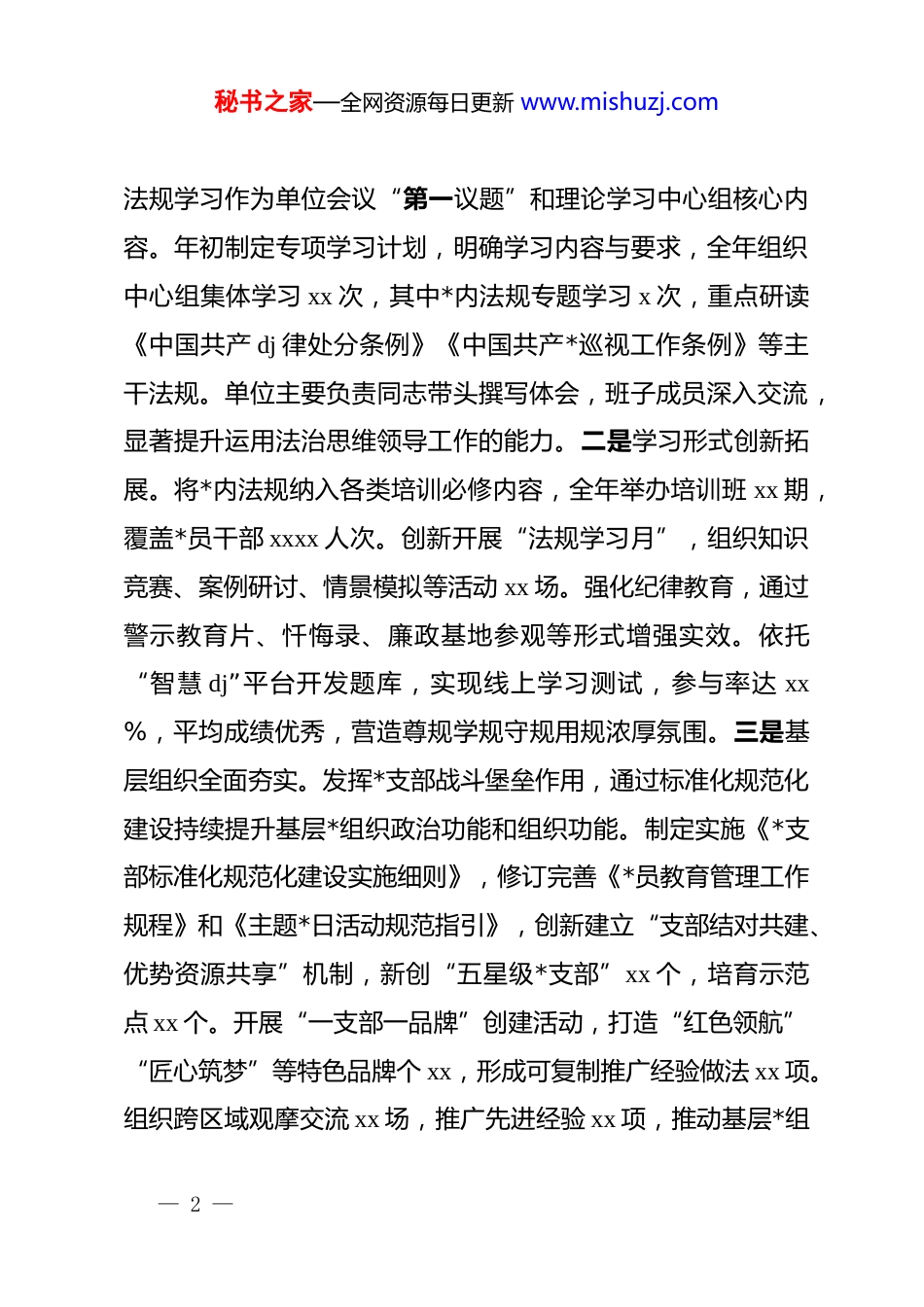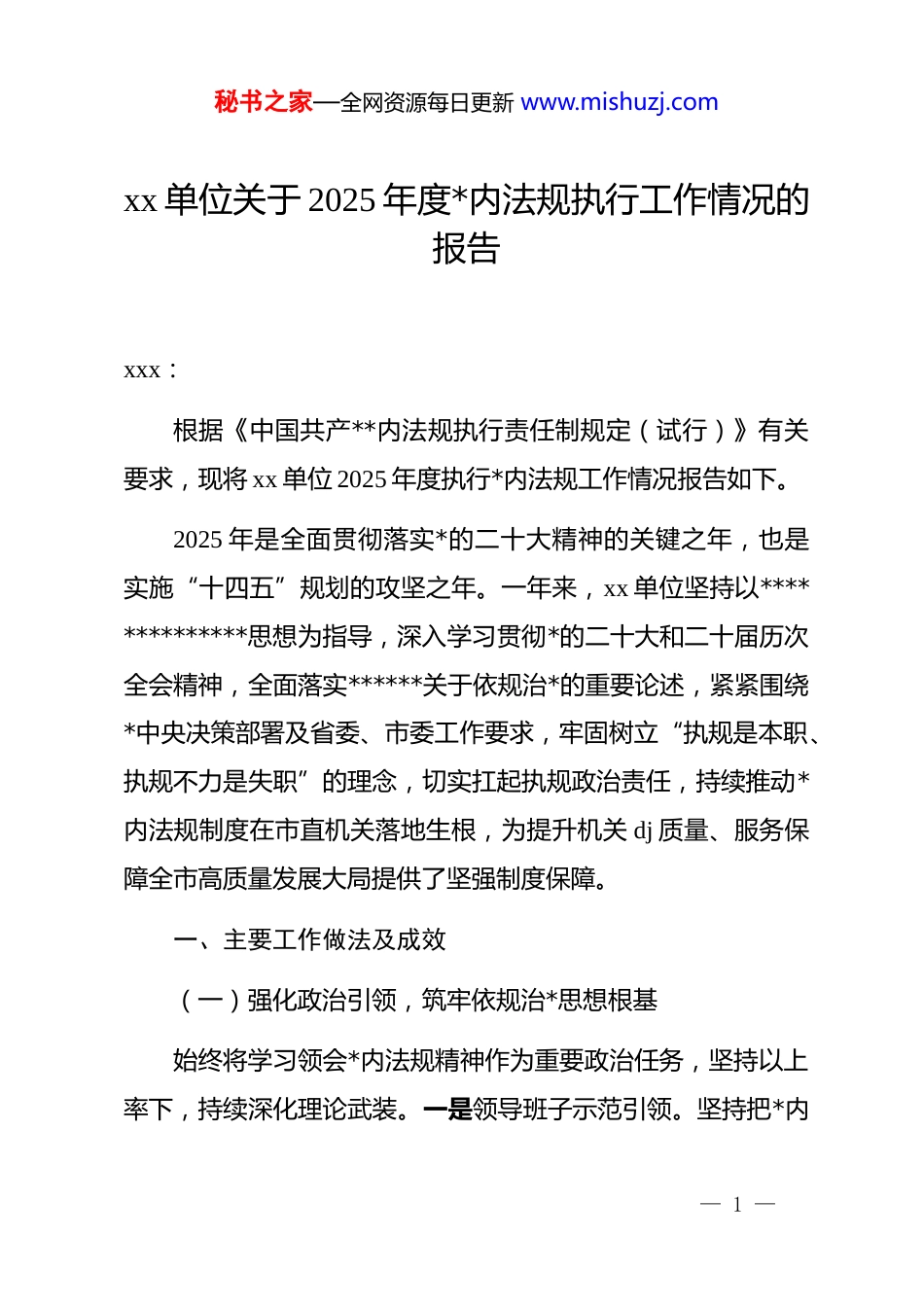 秘书之家—全网资源每日更新 www.mishuzj.comxx 单位关于 2025 年度*内法规执行工作情况的报告xxx:根据《中国共产**内法规执行责任制规定(试行)》有关要求,现将 xx 单位 2025 年度执行*内法规工作情况报告如下。2025 年是全面贯彻落实*的二十大精神的关键之年,也是实施“十四五”规划的攻坚之年。一年来,xx 单位坚持以**************思想为指导,深入学习贯彻*的二十大和二十届历次全会精神,全面落实******关于依规治*的重要论述,紧紧围绕*中央决策部署及省委、市委工作要求,牢固树立“执规是本职、执规不力是失职”的理念,切实扛起执规政治责任,持续推动*内法规制度在市直机关落地生根,为提升机关 dj 质量、服务保障全市高质量发展大局提供了坚强制度保障。一、主要工作做法及成效(一)强化政治引领,筑牢依规治*思想根基始终将学习领会*内法规精神作为重要政治任务,坚持以上率下,持续深化理论武装。一是领导班子示范引领。坚持把*内— 1 —秘书之家—全网资源每日更新 www.mishuzj.com法规学习作为单位会议“第一议题”和理论学习中心组核心内容。年初制定专项学习计划,明确学习内容与要求,全年组织中心组集体学习 xx 次,其中*内法规专题学习 x 次,重点研读《中国共产 dj 律处分条例》《中国共产*巡视工作条例》等主干法规。单位主要负责同志带头撰写体会,班子成员深入交流,显著提升运用法治思维领导工作的能力。二是学习形式创新拓展。将*内法规纳入各类培训必修内容,全年举办培训班 xx 期,覆盖*员干部 xxxx 人次。创新开展“法规学习月”,组织知识竞赛、案例研讨、情景模拟等活动 xx 场。强化纪律教育,通过警示教育片、忏悔录、廉政基地参观等形式增强实效。依托“智慧 dj”平台开发题库,实现线上学习测试,参与率达 xx%,平均成绩优秀,营造尊规学规守规用规浓厚氛围。三是基层组织全面夯实。发挥*支部战斗堡垒作用,通过标准化规范化建设持续提升基层*组织政治功能和组织功能。制定实施《*支部标准化规范化建设实施细则》,修订完善《*员教育管理工作规程》和《主题*日活动规范指引》,创新建立“支部结对共建、优势资源共享”机制,新创“五星级*支部”xx 个,培育示范点 xx 个。开展“一支部一品牌”创建活动,打造“红色领航”“匠心筑梦”等特色品牌个 xx,形成可复制推广经验做法 xx 项。组织跨区域观摩交流 xx 场,推广先进经验 xx 项,推动基层*组— 2 —秘书之家—全网资源每日更新 www.mishuzj.com织全面进步、全面过硬。聚焦提质增效,健全完善机关 dj 制度体系坚持问题导向与目标导向,着力补齐制度短板,优化制度供给,注重制度建设的系统性、针对性与可操作性,确保各项制度衔接配套、形成合力。一是健全主体责任机制。制定《xx落实机关 dj 主体责任考核办法》,细化 x 大类 xx 项指标,建立“季度督查+年度考核”系统机制。开展 xx 专项督查,覆盖部门单位 xx 家,发现并整改问题 xx 件。加大压力传导力度,对落实不力单位主要负责人进行约谈,有效落实责任。建立问题整改通报制度,每季度工作会议通报问题 xx 条,形成比学赶超良好局面。二是完善权力监督机制。修订监督执纪工作实施细则,新增风险防控条款 xx 条,强化对“关键少数”监督。编制履职指引,细化工作流程 xx 项,为基层纪检干部提供明确指南。创新建立纪检干部履职档案,实行“一人一档”精细化管理,定期开展履职评估并纳入考核。建立交叉检查机制,促进经验交流与问题发现。三是强化内部管理制度。认真贯彻落实《中国共产*思想政治工作条例》等最新*内法规要求,研究制定《关于加强和改进新时代机关思想政治工作的实施办法》及 x项配套实施细则。修订完善内部管理制度 xx 项,新建《重大事— 3 —秘书之家—全网资源每日更新 www.mishuzj.com项决策程序规定》等制度 x 项,同步制定实施细则与工作流程。开展制度执行“回头看”,组织各处室自查,发现并整改问题xx 项。建立制度评估机制,对新制度实施半年后开展效果评估,依据评估结果调整完善,确保制度落地见效。严格对标对表,狠抓*内...