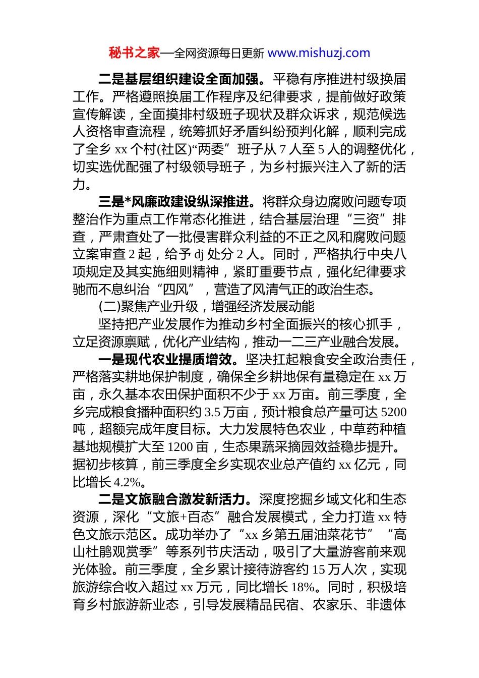 秘书之家—全网资源每日更新 www.mishuzj.comxx 乡 2025 年前三季度工作总结及第四季度工作安排2025 年是全面贯彻落实*的二十大精神的关键之年,也是实施“十四五”规划承上启下的攻坚之年。今年以来,在县委、县政府的坚强领导下,xx 乡*委、政府坚持以**************思想为指导,紧紧围绕年初确定的目标任务,团结和带领全乡广大干部群众,锐意进取,扎实工作,全乡经济社会发展呈现出稳中有进、持续向好的良好态势。为系统总结经验、查找不足,科学谋划和部署第四季度工作,确保圆满完成全年各项目标任务,现将前三季度工作总结及第四季度工作安排报告如下。一、2025 年前三季度工作回顾与成效前三季度,我乡紧扣高质量发展主题,聚焦 dj 引领、产业升级、乡村振兴、生态文明和社会治理五大核心板块统筹推进各项工作,取得了阶段性成效。(一)聚焦 dj 引领,筑牢坚强战斗堡垒始终坚持把*的政治建设摆在首位,以提升组织力为重点,不断夯实基层 dj 基础,为全乡发展提供了坚强的政治和组织保障。一是理论武装持续深化。严格落实“第一议题”制度,乡*委理论学习中心组开展集中学习 12 次,举办各类专题学习会、读书班等 40 余场次。深入学习******关于推进乡村全面振兴的重要论述以及《***谈治国理政》第五卷等重要内容,引导全乡*员干部深刻领悟“两个确立”的决定性意义,增强“四个自信”,做到“两个维护”。前三季度,累计开展各类*员干部培训超过 350 人次,有效提升了干部队伍的政治素养和履职能力。秘书之家—全网资源每日更新 www.mishuzj.com二是基层组织建设全面加强。平稳有序推进村级换届工作。严格遵照换届工作程序及纪律要求,提前做好政策宣传解读,全面摸排村级班子现状及群众诉求,规范候选人资格审查流程,统筹抓好矛盾纠纷预判化解,顺利完成了全乡 xx 个村(社区)“两委”班子从 7 人至 5 人的调整优化,切实选优配强了村级领导班子,为乡村振兴注入了新的活力。三是*风廉政建设纵深推进。将群众身边腐败问题专项整治作为重点工作常态化推进,结合基层治理“三资”排查,严肃查处了一批侵害群众利益的不正之风和腐败问题立案审查 2 起,给予 dj 处分 2 人。同时,严格执行中央八项规定及其实施细则精神,紧盯重要节点,强化纪律要求驰而不息纠治“四风”,营造了风清气正的政治生态。(二)聚焦产业升级,增强经济发展动能坚持把产业发展作为推动乡村全面振兴的核心抓手,立足资源禀赋,优化产业结构,推动一二三产业融合发展。一是现代农业提质增效。坚决扛起粮食安全政治责任,严格落实耕地保护制度,确保全乡耕地保有量稳定在 xx 万亩,永久基本农田保护面积不少于 xx 万亩。前三季度,全乡完成粮食播种面积约 3.5 万亩,预计粮食总产量可达 5200吨,超额完成年度目标。大力发展特色农业,中草药种植基地规模扩大至 1200 亩,生态果蔬采摘园效益稳步提升。据初步核算,前三季度全乡实现农业总产值约 xx 亿元,同比增长 4.2%。二是文旅融合激发新活力。深度挖掘乡域文化和生态资源,深化“文旅+百态”融合发展模式,全力打造 xx 特色文旅示范区。成功举办了“xx 乡第五届油菜花节”“高山杜鹃观赏季”等系列节庆活动,吸引了大量游客前来观光体验。前三季度,全乡累计接待游客约 15 万人次,实现旅游综合收入超过 xx 万元,同比增长 18%。同时,积极培育乡村旅游新业态,引导发展精品民宿、农家乐、非遗体秘书之家—全网资源每日更新 www.mishuzj.com验馆等项目,带动周边超过 300 户村民增收。三是招商引资与项目建设双轮驱动。围绕生态康养、绿色食品加工等重点产业,开展靶向招商,前三季度共引进重点项目 3 个,协议引资额达 xx 亿元。对重点项目实行清单化管理,成立工作专班,紧盯关键环节攻坚克难。总投资 xx 万元的 xx 村人居环境提升项目已完成工程量的90%,预计 11 月底前全面竣工。xx 河道生态修复工程已完成主体建设,正在进行收尾工作。通过强化反馈机制,及时协调解决了项目推进中遇到的征地、审批等滞后问题,确保了项目建设的顺利进行。(三)聚焦乡村振兴,提升民生福祉水...