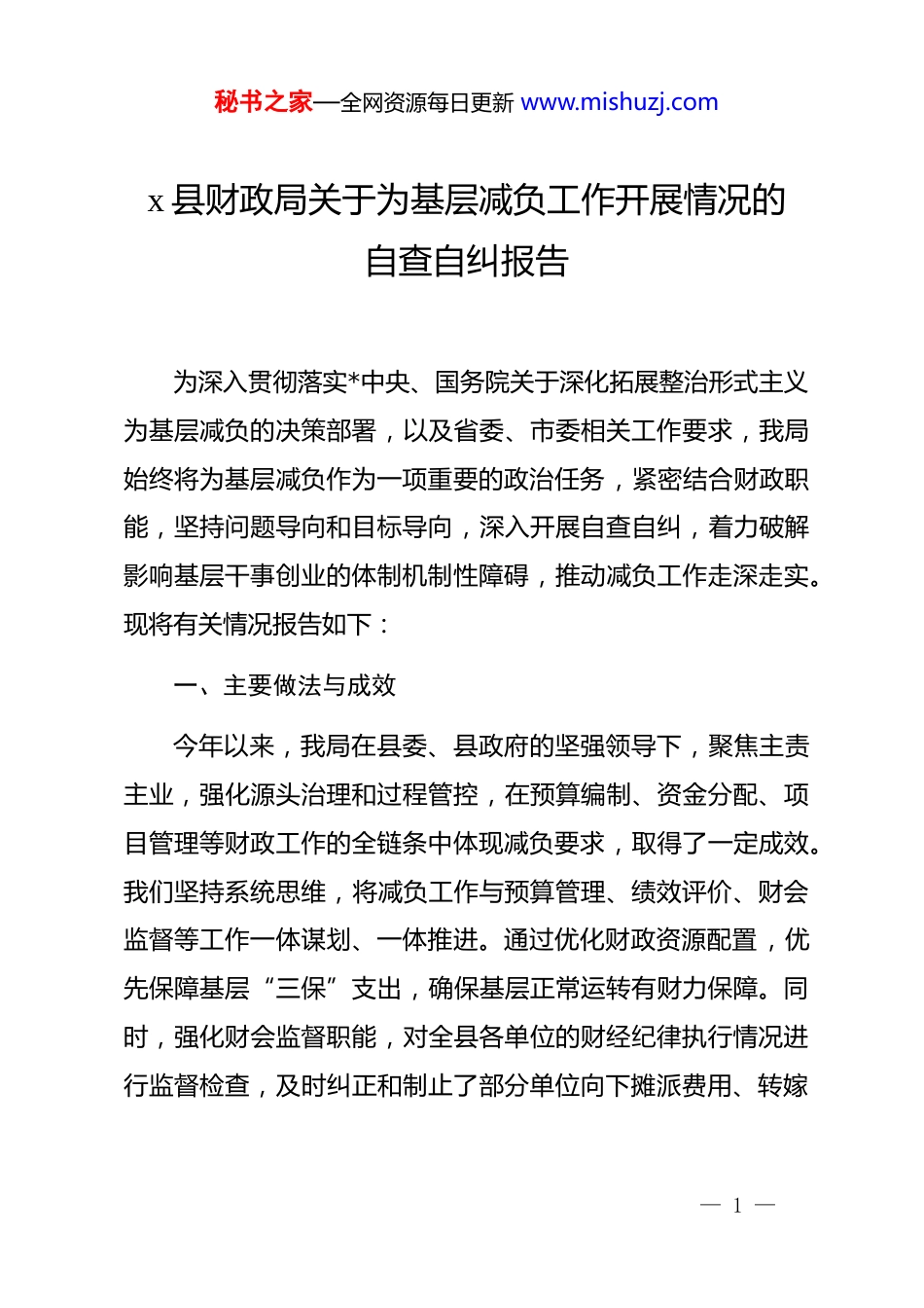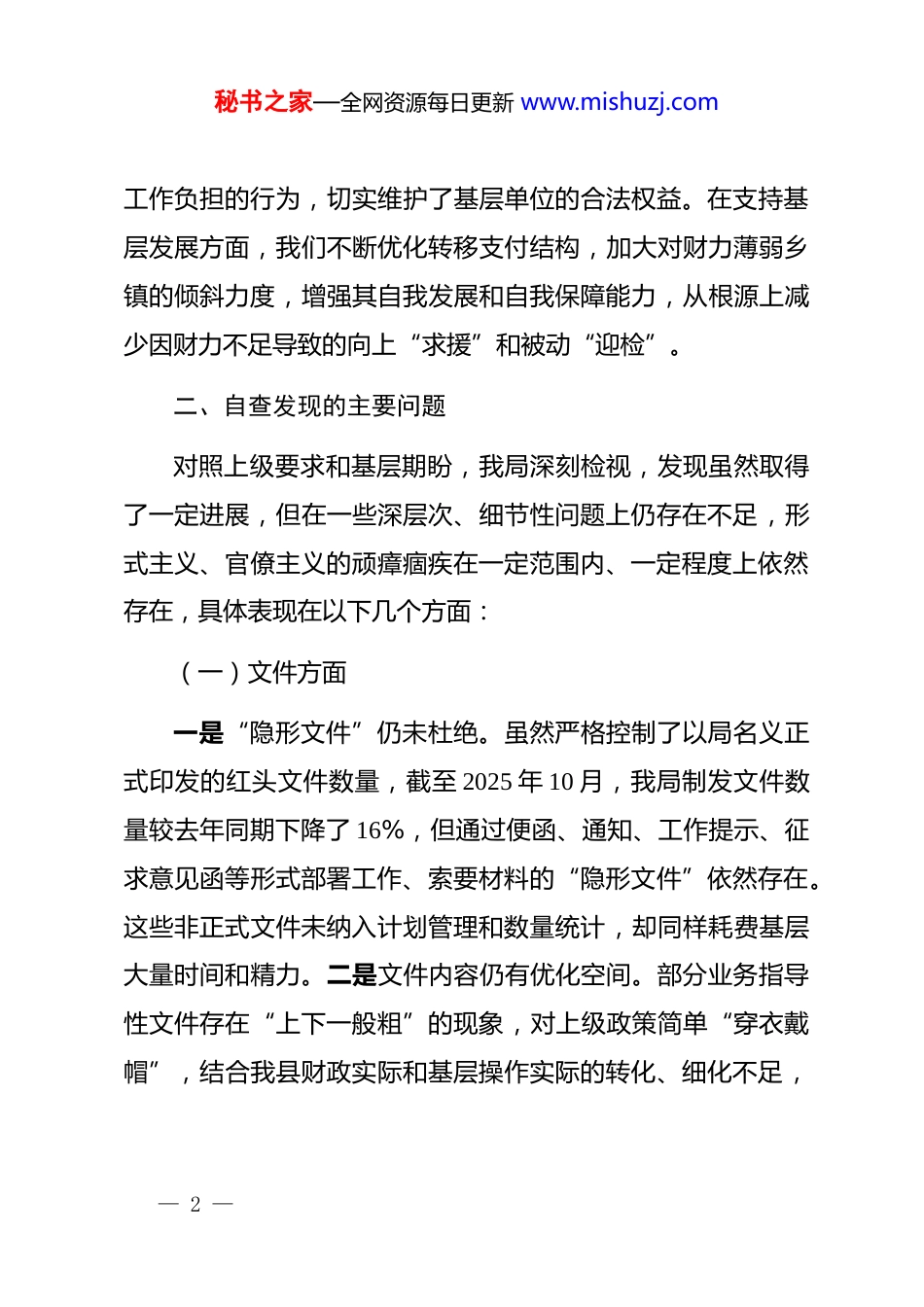 秘书之家—全网资源每日更新 www.mishuzj.comx 县财政局关于为基层减负工作开展情况的自查自纠报告为深入贯彻落实*中央、国务院关于深化拓展整治形式主义为基层减负的决策部署,以及省委、市委相关工作要求,我局始终将为基层减负作为一项重要的政治任务,紧密结合财政职能,坚持问题导向和目标导向,深入开展自查自纠,着力破解影响基层干事创业的体制机制性障碍,推动减负工作走深走实。现将有关情况报告如下:一、主要做法与成效今年以来,我局在县委、县政府的坚强领导下,聚焦主责主业,强化源头治理和过程管控,在预算编制、资金分配、项目管理等财政工作的全链条中体现减负要求,取得了一定成效。我们坚持系统思维,将减负工作与预算管理、绩效评价、财会监督等工作一体谋划、一体推进。通过优化财政资源配置,优先保障基层“三保”支出,确保基层正常运转有财力保障。同时,强化财会监督职能,对全县各单位的财经纪律执行情况进行监督检查,及时纠正和制止了部分单位向下摊派费用、转嫁— 1 —秘书之家—全网资源每日更新 www.mishuzj.com工作负担的行为,切实维护了基层单位的合法权益。在支持基层发展方面,我们不断优化转移支付结构,加大对财力薄弱乡镇的倾斜力度,增强其自我发展和自我保障能力,从根源上减少因财力不足导致的向上“求援”和被动“迎检”。二、自查发现的主要问题对照上级要求和基层期盼,我局深刻检视,发现虽然取得了一定进展,但在一些深层次、细节性问题上仍存在不足,形式主义、官僚主义的顽瘴痼疾在一定范围内、一定程度上依然存在,具体表现在以下几个方面:(一)文件方面一是“隐形文件”仍未杜绝。虽然严格控制了以局名义正式印发的红头文件数量,截至 2025 年 10 月,我局制发文件数量较去年同期下降了 16%,但通过便函、通知、工作提示、征求意见函等形式部署工作、索要材料的“隐形文件”依然存在。这些非正式文件未纳入计划管理和数量统计,却同样耗费基层大量时间和精力。二是文件内容仍有优化空间。部分业务指导性文件存在“上下一般粗”的现象,对上级政策简单“穿衣戴帽”,结合我县财政实际和基层操作实际的转化、细化不足,— 2 —秘书之家—全网资源每日更新 www.mishuzj.com导致基层在执行时仍需向上反复请示,增加了沟通成本。三是征求意见时限有时过于紧张。个别紧急任务,存在周五下午发函要求下周一上午反馈的情况,未给基层留足充分研究和反馈意见的时间,导致反馈质量不高,征求意见流于形式。(二)会议方面一是会议统筹力度有待加强。虽然我局严格执行年度会议计划,截至目前,以局名义召开的全县性会议场次同比减少12%,但部门内部、股室层面召开的业务培训会、工作协调会、项目推进会等小型会议数量仍然偏多。部分会议存在主题相近、参会人员重叠的问题,未能有效整合,增加了基层的参会负担。二是视频会议减负效果未完全实现。视频会议在提高效率的同时,也出现了新的问题。部分视频会议层层套开,同一主题的会议,省、市、县接续召开,基层干部“刚走出这个会场,又走进那个会场”。同时,对视频会议的参会范围和人员要求有时过于宽泛,未能做到精准通知,造成不必要的陪会。(三)督检考和调研考察方面一是检查考核的统筹性不足。尽管我局严格执行督检考年度计划和备案制度,但仍存在与其他部门对同一乡镇、同一项— 3 —秘书之家—全网资源每日更新 www.mishuzj.com目开展的财务检查、绩效评价、预算执行监督等工作未能有效整合的现象,导致基层单位在一段时间内需要反复接待、提供相似材料,存在多头检查、重复检查的问题。截至 2025 年第三季度,我局牵头或参与的各类督检考活动共计 18 次,虽较去年同期的 22 次有所下降,但基层反映的迎检压力依然较大。二是调研重“量”轻“质”偶有发生。下基层调研有时存在“走马观花”现象,满足于听取汇报、查看台账,深入一线、解剖麻雀式的“四不两直”调研开展得不够深入,对基层财政运行中遇到的真实困难和堵点问题挖掘不够透彻,提出的解决方案针对性、可操作性有待提高。(四)抽借调方面一是“以借代调”现象依然存在。为应对阶段性中心...