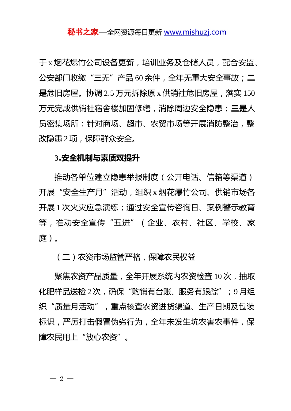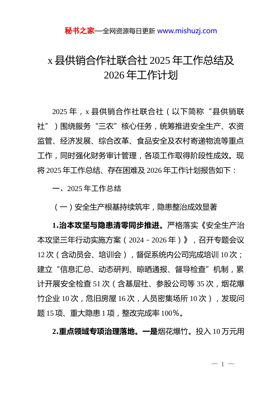 秘书之家—全网资源每日更新 www.mishuzj.comx 县供销合作社联合社 2025 年工作总结及2026 年工作计划2025 年,x 县供销合作社联合社(以下简称“县供销联社”)围绕服务“三农”核心任务,统筹推进安全生产、农资监管、经济发展、综合改革、食品安全及农村寄递物流等重点工作,同时强化财务审计管理,各项工作取得阶段性成效。现将 2025 年工作总结、存在困难及 2026 年工作计划报告如下:一、2025 年工作总结(一)安全生产根基持续筑牢,隐患整治成效显著1.治本攻坚与隐患清零同步推进。严格落实《安全生产治本攻坚三年行动实施方案(2024-2026 年)》,召开专题会议12 次(含动员会、培训会),督促系统内公司完成培训 10 次;建立“信息汇总、动态研判、晾晒通报、督导检查”机制,累计开展安全检查 51 次(含基层社、参股公司等 35 次,烟花爆竹企业 10 次,危旧房屋 16 次,人员密集场所 10 次),发现问题 15 项、重大隐患 1 项,整改完成率 100%。2.重点领域专项治理落地。一是烟花爆竹。投入 10 万元用— 1 —秘书之家—全网资源每日更新 www.mishuzj.com于 x 烟花爆竹公司设备更新,培训业务及仓储人员,配合安监、公安部门收缴“三无”产品 60 余件,全年无重大安全事故;二是危旧房屋。协调 2.5 万元拆除原 x 供销社危旧房屋,落实 150万元完成供销社宿舍楼加固修缮,消除周边安全隐患;三是人员密集场所:针对商场、超市、农贸市场等开展消防整治,整改隐患 2 项,保障群众安全。3.安全机制与素质双提升推动各单位建立隐患举报制度(公开电话、信箱等渠道)开展“安全生产月”活动,组织 x 烟花爆竹公司、供销市场各开展 1 次火灾应急演练;通过安全宣传咨询日、案例警示教育等,推动安全宣传“五进”(企业、农村、社区、学校、家庭)。(二)农资市场监管严格,保障农民权益聚焦农资产品质量,全年开展系统内农资检查 10 次,抽取化肥样品送检 2 次,确保“购销有台账、服务有跟踪”;9 月组织“质量月活动”,重点核查农资进货渠道、生产日期及包装标识,严厉打击假冒伪劣行为,全年未发生坑农害农事件,保障农民用上“放心农资”。— 2 —秘书之家—全网资源每日更新 www.mishuzj.com(三)经济指标稳步增长,经营质效提升2025 年 1-9 月,全县供销系统主要经济指标超额完成阶段性目标,其中:购进总额 211904.02 万元,同比增长 5.87%;销售总额 241247.02 万元,同比增长 6.35%(超全年 6%增长目标)。细分领域:农产品销售额 142064.5 万元(+7.18%)、农资销售额 65953.59 万元(+7.06%)、电子商务销售额 337.973万元(+7.94%)、再生资源销售额 145.5 万元(+5.57%),均实现预期增长。(四)综合改革纵深推进,服务“三农”能力增强1.现代农业社会化服务扩面。依托农民专业合作社,以“菜单式”服务为农民提供水果销售、水稻收割、除草杀虫等服务,1-9 月完成服务 18419.1 亩次;寨沙供销社(“千县千社”示范社)完成服务 1140 亩次,同步开展再生资源回收、农资供应等业务。2.“供销大集”激活产销对接。围绕元旦、春节等节日,联合科工贸、导江乡政府等部门开展线上线下“供销大集”25 场(年度目标 30 场),报送宣传稿 5 篇,推动“农产品上行、工— 3 —秘书之家—全网资源每日更新 www.mishuzj.com业品下行”,提升供销社品牌影响力。3.加盟企业拓展服务链条。完成 3 家农特产品企业加盟,其中与 x 公司签订协议(产品标注供销社标识)、与众兴禽业合作发展家禽养殖(销售幼苗 400 多万只),并对接中明农机合作社拓宽服务渠道;完成农特产品企业备选名单上报,为 x农产品展销会做准备。(五)食品安全监管到位,风险隐患清零一是健全组织体系。成立以主要领导为组长的食品安全工作小组,落实“管行业必管安全”责任。二是强化排查与宣传:开展系统内食品安全检查 12 次,全覆盖排查基层社、超市等食品经营主体,严禁售卖“三无”及过期食品;发放宣传资料、播放标语,结合创城开展科普教育,提升公众食品安全素养。(六)农...