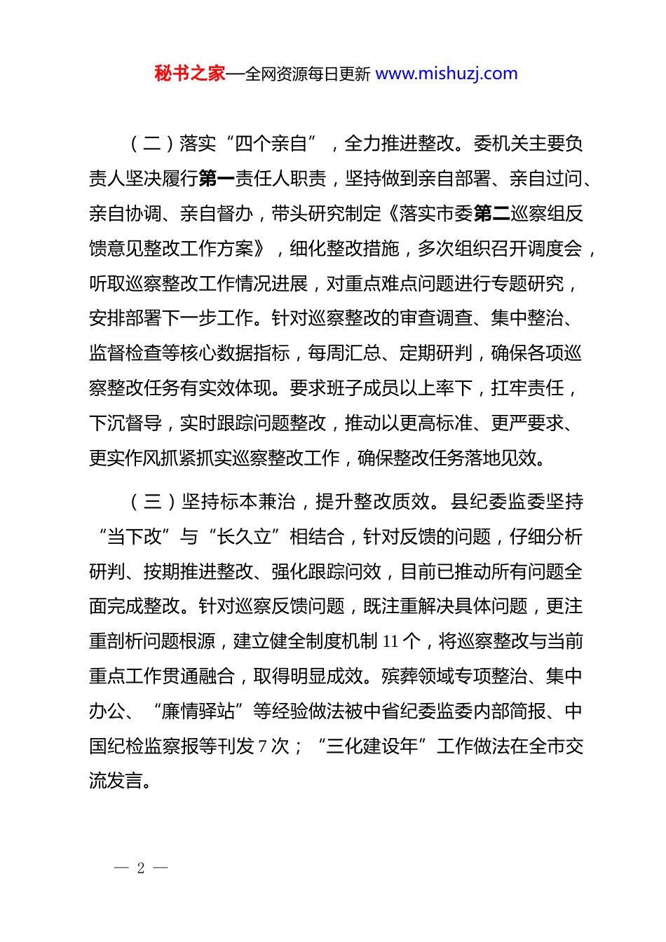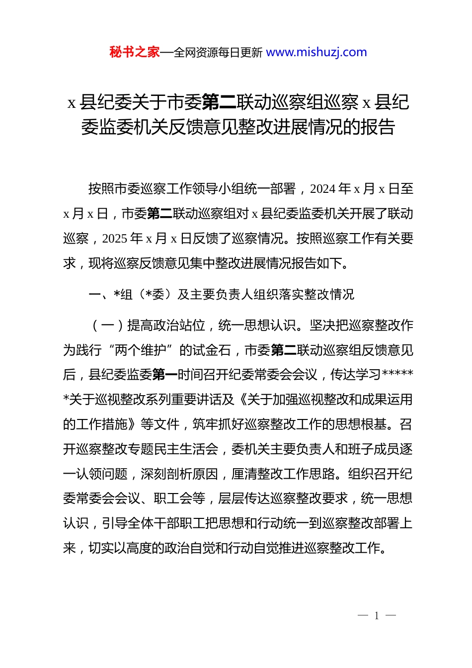 秘书之家—全网资源每日更新 www.mishuzj.comx 县纪委关于市委第二联动巡察组巡察 x 县纪委监委机关反馈意见整改进展情况的报告按照市委巡察工作领导小组统一部署,2024 年 x 月 x 日至x 月 x 日,市委第二联动巡察组对 x 县纪委监委机关开展了联动巡察,2025 年 x 月 x 日反馈了巡察情况。按照巡察工作有关要求,现将巡察反馈意见集中整改进展情况报告如下。一、*组(*委)及主要负责人组织落实整改情况(一)提高政治站位,统一思想认识。坚决把巡察整改作为践行“两个维护”的试金石,市委第二联动巡察组反馈意见后,县纪委监委第一时间召开纪委常委会会议,传达学习******关于巡视整改系列重要讲话及《关于加强巡视整改和成果运用的工作措施》等文件,筑牢抓好巡察整改工作的思想根基。召开巡察整改专题民主生活会,委机关主要负责人和班子成员逐一认领问题,深刻剖析原因,厘清整改工作思路。组织召开纪委常委会会议、职工会等,层层传达巡察整改要求,统一思想认识,引导全体干部职工把思想和行动统一到巡察整改部署上来,切实以高度的政治自觉和行动自觉推进巡察整改工作。— 1 —秘书之家—全网资源每日更新 www.mishuzj.com(二)落实“四个亲自”,全力推进整改。委机关主要负责人坚决履行第一责任人职责,坚持做到亲自部署、亲自过问、亲自协调、亲自督办,带头研究制定《落实市委第二巡察组反馈意见整改工作方案》,细化整改措施,多次组织召开调度会,听取巡察整改工作情况进展,对重点难点问题进行专题研究,安排部署下一步工作。针对巡察整改的审查调查、集中整治、监督检查等核心数据指标,每周汇总、定期研判,确保各项巡察整改任务有实效体现。要求班子成员以上率下,扛牢责任,下沉督导,实时跟踪问题整改,推动以更高标准、更严要求、更实作风抓紧抓实巡察整改工作,确保整改任务落地见效。(三)坚持标本兼治,提升整改质效。县纪委监委坚持“当下改”与“长久立”相结合,针对反馈的问题,仔细分析研判、按期推进整改、强化跟踪问效,目前已推动所有问题全面完成整改。针对巡察反馈问题,既注重解决具体问题,更注重剖析问题根源,建立健全制度机制 11 个,将巡察整改与当前重点工作贯通融合,取得明显成效。殡葬领域专项整治、集中办公、“廉情驿站”等经验做法被中省纪委监委内部简报、中国纪检监察报等刊发 7 次;“三化建设年”工作做法在全市交流发言。— 2 —秘书之家—全网资源每日更新 www.mishuzj.com二、集中整改进展情况(一)关于反馈的“学习贯彻**************思想不够全面系统深入”问题的整改情况问题 1:“第一议题”制度执行不到位。整改情况:一是制发《关于规范落实“第一议题”制度的通知》,从制度层面明确学习内容、学习形式、学习要求,推动“第一议题”学习融入日常、抓在经常。二是将“第一议题”作为县纪委常委会会议讨论决策事项、研究部署工作的思想引领和首要内容,今年以来,召开纪委常委会会议均落实“第一议题”制度,并同步建立学习台账。三是通过学习平台、主流网站、新闻信息等收集整理“第一议题”学习清单资料并积极推送,方便*员干部开展自学。四是编发“第一议题”应知应会知识清单,并将“第一议题”制度落实情况纳入班子成员重点督导内容进行全覆盖督导。问题 2:政治理论学习不深入。整改情况:一是通过班子领学、导学研读等方式深化学习质效,县纪委常委会会议上学习的会议、文件等均结合纪检监察工作实际提出具体贯彻落实要求。二是丰富学习形式,充分— 3 —秘书之家—全网资源每日更新 www.mishuzj.com利用理论中心组学习会议、“三会一课”、职工会及“清武讲堂”等深入开展学习,举办干部政治理论素养提升班 2 期,通过专家授课、实地研学等方式,有效提升学习质效。三是合理安排内容,严格审核把关,保障充足学习时间。问题 3:理论指导实践不充分。整改情况:依托县纪委常委会会议、理论学习中心组学习会议、“三会一课”等载体,组织学习******最新讲话、中央八项规定精神及中省市重大决策部署文件会议精神 28 次,深入学习研讨,做实成果转化。围绕“x”重点...
