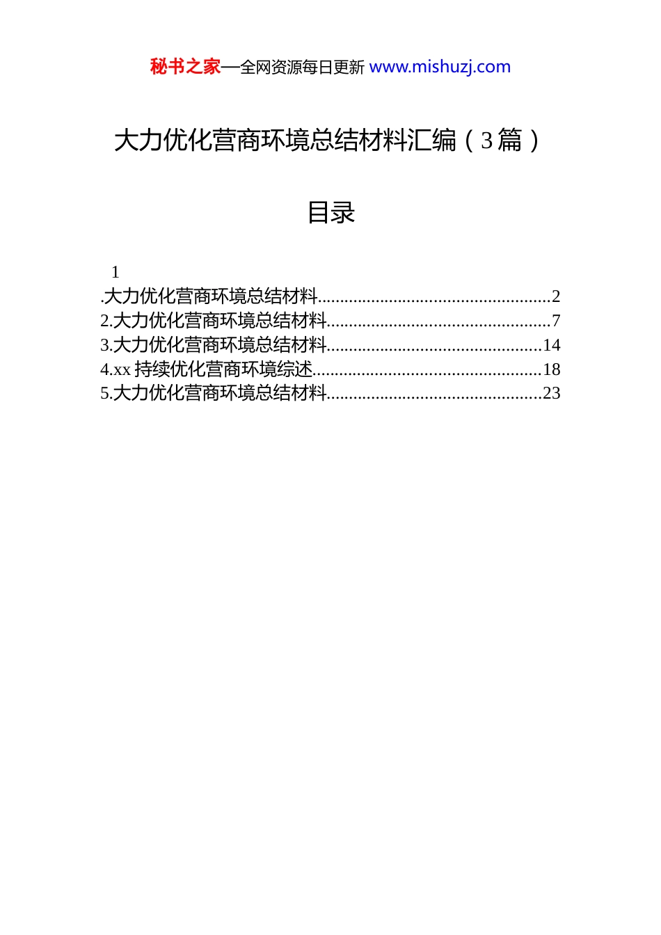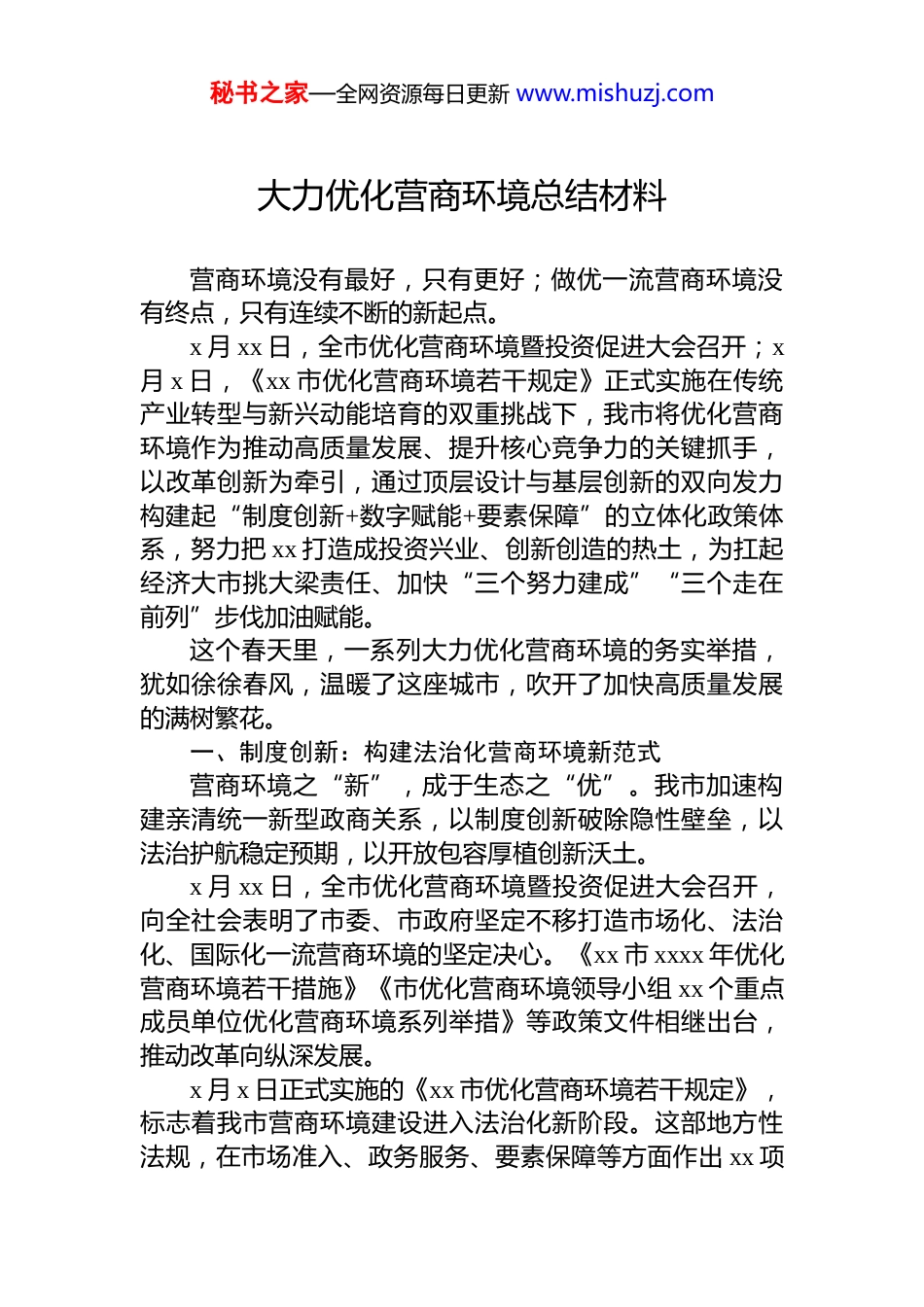 秘书之家—全网资源每日更新 www.mishuzj.com大力优化营商环境总结材料汇编(3 篇)目录1.大力优化营商环境总结材料....................................................22.大力优化营商环境总结材料..................................................73.大力优化营商环境总结材料................................................144.xx 持续优化营商环境综述...................................................185.大力优化营商环境总结材料................................................23秘书之家—全网资源每日更新 www.mishuzj.com大力优化营商环境总结材料营商环境没有最好,只有更好;做优一流营商环境没有终点,只有连续不断的新起点。x 月 xx 日,全市优化营商环境暨投资促进大会召开;x月 x 日,《xx 市优化营商环境若干规定》正式实施在传统产业转型与新兴动能培育的双重挑战下,我市将优化营商环境作为推动高质量发展、提升核心竞争力的关键抓手,以改革创新为牵引,通过顶层设计与基层创新的双向发力构建起“制度创新+数字赋能+要素保障”的立体化政策体系,努力把 xx 打造成投资兴业、创新创造的热土,为扛起经济大市挑大梁责任、加快“三个努力建成”“三个走在前列”步伐加油赋能。这个春天里,一系列大力优化营商环境的务实举措,犹如徐徐春风,温暖了这座城市,吹开了加快高质量发展的满树繁花。一、制度创新:构建法治化营商环境新范式营商环境之“新”,成于生态之“优”。我市加速构建亲清统一新型政商关系,以制度创新破除隐性壁垒,以法治护航稳定预期,以开放包容厚植创新沃土。x 月 xx 日,全市优化营商环境暨投资促进大会召开,向全社会表明了市委、市政府坚定不移打造市场化、法治化、国际化一流营商环境的坚定决心。《xx 市 xxxx 年优化营商环境若干措施》《市优化营商环境领导小组 xx 个重点成员单位优化营商环境系列举措》等政策文件相继出台,推动改革向纵深发展。x 月 x 日正式实施的《xx 市优化营商环境若干规定》,标志着我市营商环境建设进入法治化新阶段。这部地方性法规,在市场准入、政务服务、要素保障等方面作出 xx 项秘书之家—全网资源每日更新 www.mishuzj.com具体规定,首次将“政策免申即享”“无证明城市”等创新实践上升为法律规范。在市场准入领域,我市推行企业开办“市县同权、全市域通办”模式,全流程压缩至 x 个工作日,实现营业执照、公章刻制、发票申领等项业务“一窗通办”。针对个体工商户转型企业的痛点,新规允许“个转企”直接变更登记并保留原字号,解决了长期困扰小微企业的品牌延续问题截至 x 月 xx 日,全市新登记经营主体数量 xxxxx 户。其中,新登记企业 xxxx 户,平均日净增企业 xx.xx 户。法治化营商环境的核心在于公平竞争审查。我市积极完善涉企政策动态评估机制,清理废止妨碍统一市场和公平竞争的政策文件。积极探索推广“信用+”应用场景,推广信用报告替代有无违法违规证明,政务服务大厅 xx 小时自助打印,目前已出具报告 xxxx 份,替代证明 x.xx 万份;深化融资信用服务方面,已累计发布金融产品 xxx 款;信用修复方面,xxxx 年以来帮助企业办理信用修复 xxx 余件。二、数字赋能:打造智慧政务服务新生态在政务服务数字化转型方面,我市构建起“一网通办+智能审批”的新型服务体系。依托 xx 省统一政务服务平台,推广“全程网办”,企业群众办事材料精简率达 xx%。数字化改革深度融入企业全生命周期。税务部门推广“征纳互动平台”,实现办税缴费“一次不用跑”,今年 x至 x 月线上办税比例达 xx.x%。在工程建设领域“多规合一”平台整合 xx 个部门数据资源,项目选址审批时间从 xx天压缩至 x 天。xx 自贸区试点的“智慧口岸”建设,通过区块链技术实现货物通关“秒级验放”,今年一季度外贸进出口总值同比增长 xx%。数字技术的应用重塑了监管模式。我市推行“入企扫码”行政执法,执法人员需通过专用 APP 扫码备案,今年一季度涉企检查频次同比下降 xx%。市场监管部门建立“风险预警+信用分级”监管体系,对守信企...