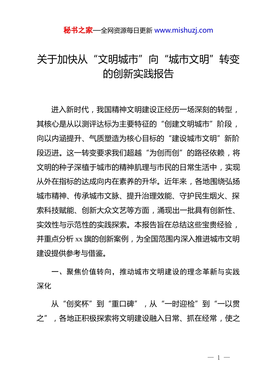 秘书之家—全网资源每日更新 www.mishuzj.com关于加快从“文明城市”向“城市文明”转变的创新实践报告进入新时代,我国精神文明建设正经历一场深刻的转型,其核心是从以测评达标为主要特征的“创建文明城市”阶段,向以内涵提升、气质塑造为核心目标的“建设城市文明”新阶段迈进。这一转变要求我们超越“为创而创”的路径依赖,将文明的种子深植于城市的精神肌理与市民的日常生活中,实现从外在指标的达成向内在素养的升华。近年来,各地围绕弘扬城市精神、传承城市文脉、提升治理效能、守护民生烟火、探索科技赋能、创新大众文艺等方面,涌现出一批具有创新性、实效性与示范性的实践探索。本报告旨在总结这些宝贵经验,并重点分析 xx 旗的创新案例,为全国范围内深入推进城市文明建设提供参考与借鉴。一、聚焦价值转向,推动城市文明建设的理念革新与实践深化从“创奖杯”到“重口碑”,从“一时迎检”到“一以贯之”,各地正积极探索将文明建设融入日常、抓在经常,使之— 1 —秘书之家—全网资源每日更新 www.mishuzj.com成为城市发展的内生动力和市民生活的普遍共识。(一)从“为创建而建”向“为民生而建”转变,夯实文明的民本底色文明创建的出发点和落脚点是人民群众对美好生活的向往优秀的城市文明建设实践普遍将重心下沉,聚焦解决群众“急难愁盼”问题。xx 市建立起一套成熟的民意搜集和转化机制,每年通过线上平台、热线电话、意见箱等多元渠道,系统梳理形成民生实事清单,并将其纳入市委市政府的年度重点工作。针对农贸市场改造、老旧小区停车难、空中“飞线”充电、垃圾分类普及、文明养犬等十二项长期困扰市民的重难点问题,由职能部门牵头,专项攻坚,逐一破解。这种做法变“政府端菜”为“群众点菜”,将文明创建的过程转化为持续增进民生福祉的过程,极大提升了市民对文明建设的认同感、获得感和满意率。(二)从“运动式攻坚”向“常态化治理”转变,塑造文明的内生肌理城市文明非一日之功,必须久久为功。各地正逐步摒弃为迎接测评而采取的短期、高强度整治模式,转而构建常态长效— 2 —秘书之家—全网资源每日更新 www.mishuzj.com的治理机制。一方面,坚持问题导向,创新治理方法。通过分片区、网格化的日常巡查,精准锁定反复出现、群众反映强烈的问题点位,组织实施“微改造、微治理”行动,以“绣花功夫”解决背街小巷的环境卫生、公共设施的维护更新等具体问题,积小胜为大胜。另一方面,强化活动引领,培育文明习惯。如 xx 市持续开展的“垃圾不落地城市更美丽”行动,通过广泛宣传与精细治理,引导市民养成烟头不落地、垃圾精准入桶、自觉清理宠物粪便等文明习惯。同时,面向旅游城市特点,在旅游旺季通过开放机关单位内部停车场、增派志愿者、优化交通疏导、增加保洁频次等“组合拳”,精准应对车辆乱停放、地面垃圾等潮汐式问题,实现了城市治理的弹性和韧性。(三)从“城区一枝秀”向“城乡满园春”转变,描绘文明的全域图景城市文明的更高境界是城乡精神文明的融合发展与共同繁荣。各地注重统筹推进文明培育、文明实践、文明创建,将城市的文明成果向广袤乡村延伸。一是实施文明乡风建设工程,出台细则,全面部署农村道德风尚培育、移风易俗推进和人居环境改善工作,特别是针对高额彩礼、大操大办等陈规陋习开展专项治理与宣传引导。二是深入推进农村人居环境整治,通— 3 —秘书之家—全网资源每日更新 www.mishuzj.com过发布倡议书、制作公益广告、发挥文明村镇示范作用等方式,组织群众广泛参与黑臭水体、暴露垃圾、乱搭乱建等问题的综合治理,有效改善了农村整体面貌。三是创新文化供给方式,紧扣移风易俗等主题,组织创作群众喜闻乐见的文艺节目,在新时代文明实践中心(所、站)开展巡演,并利用新媒体平台进行线上展播,将文化“大餐”与文明新风送到田间地头,以文化人,成风化俗。二、xx 旗创新案例:以融合式文化新空间涵养城市文明气质在从“文明城市”向“城市文明”的转型中,如何将独特的地域文化资源转化为涵养城市文明气质的深厚土壤,是许多中小城市面临的共同课题。在这方面,xx 旗的探索提供了一个具有...