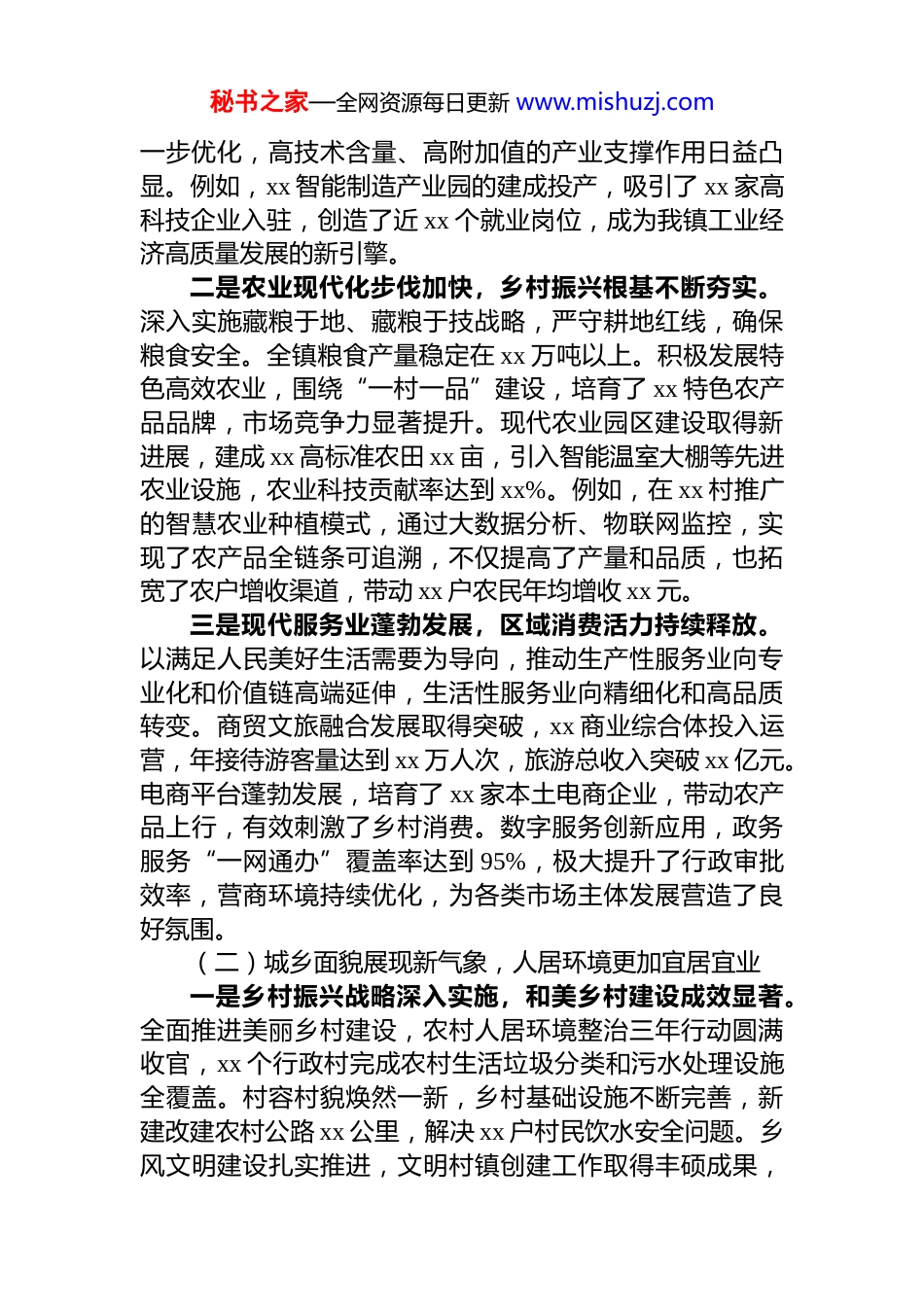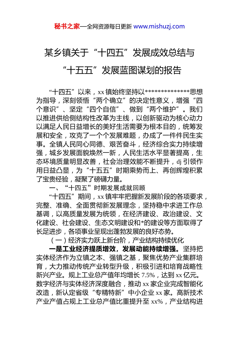 秘书之家—全网资源每日更新 www.mishuzj.com某乡镇关于“十四五”发展成效总结与“十五五”发展蓝图谋划的报告“十四五”以来,xx 镇始终坚持以**************思想为指导,深刻领悟“两个确立”的决定性意义,增强“四个意识”、坚定“四个自信”、做到“两个维护”。我们以推进供给侧结构性改革为主线,以创新驱动为核心动力以满足人民日益增长的美好生活需要为根本目的,统筹发展和安全,攻克了一个个发展难题,办成了一件件民生实事。全镇人民同心同德、艰苦奋斗,经济综合实力持续增强,城乡发展面貌焕然一新,人民生活水平显著提高,生态环境质量明显改善,社会治理效能不断提升,dj 引领作用日益凸显,为“十五五”时期乘势而上、再创辉煌积累了宝贵经验,凝聚了磅礴力量。一、“十四五”时期发展成就回顾“十四五”期间,xx 镇牢牢把握新发展阶段的各项要求,完整、准确、全面贯彻新发展理念,坚持稳中求进工作总基调,以高质量发展为统领,在经济建设、政治建设、文化建设、社会建设、生态文明建设和*的建设等方面取得了长足进步,各项事业呈现出蓬勃发展的良好态势。(一)经济实力跃上新台阶,产业结构持续优化一是工业经济提质增效,发展动能持续增强。坚持把实体经济作为立镇之本、强镇之基,聚焦优势产业集群培育,大力推动传统产业转型升级,积极引进和培育战略性新兴产业。规上工业总产值年均增长 7.5%,达到 xx 亿元。数字经济与实体经济深度融合,推动 xx 家企业完成智能化改造,新认定省级“专精特新”中小企业 xx 家。高新技术产业产值占规上工业总产值比重提升至 xx%,产业结构进秘书之家—全网资源每日更新 www.mishuzj.com一步优化,高技术含量、高附加值的产业支撑作用日益凸显。例如,xx 智能制造产业园的建成投产,吸引了 xx 家高科技企业入驻,创造了近 xx 个就业岗位,成为我镇工业经济高质量发展的新引擎。二是农业现代化步伐加快,乡村振兴根基不断夯实。深入实施藏粮于地、藏粮于技战略,严守耕地红线,确保粮食安全。全镇粮食产量稳定在 xx 万吨以上。积极发展特色高效农业,围绕“一村一品”建设,培育了 xx 特色农产品品牌,市场竞争力显著提升。现代农业园区建设取得新进展,建成 xx 高标准农田 xx 亩,引入智能温室大棚等先进农业设施,农业科技贡献率达到 xx%。例如,在 xx 村推广的智慧农业种植模式,通过大数据分析、物联网监控,实现了农产品全链条可追溯,不仅提高了产量和品质,也拓宽了农户增收渠道,带动 xx 户农民年均增收 xx 元。三是现代服务业蓬勃发展,区域消费活力持续释放。以满足人民美好生活需要为导向,推动生产性服务业向专业化和价值链高端延伸,生活性服务业向精细化和高品质转变。商贸文旅融合发展取得突破,xx 商业综合体投入运营,年接待游客量达到 xx 万人次,旅游总收入突破 xx 亿元。电商平台蓬勃发展,培育了 xx 家本土电商企业,带动农产品上行,有效刺激了乡村消费。数字服务创新应用,政务服务“一网通办”覆盖率达到 95%,极大提升了行政审批效率,营商环境持续优化,为各类市场主体发展营造了良好氛围。(二)城乡面貌展现新气象,人居环境更加宜居宜业一是乡村振兴战略深入实施,和美乡村建设成效显著。全面推进美丽乡村建设,农村人居环境整治三年行动圆满收官,xx 个行政村完成农村生活垃圾分类和污水处理设施全覆盖。村容村貌焕然一新,乡村基础设施不断完善,新建改建农村公路 xx 公里,解决 xx 户村民饮水安全问题。乡风文明建设扎实推进,文明村镇创建工作取得丰硕成果,秘书之家—全网资源每日更新 www.mishuzj.com涌现出 xx 个省级文明村镇,形成了人人爱护环境、家家崇尚文明的良好风尚。例如,xx 村在人居环境整治中,不仅实现了垃圾不落地、污水不外流,还盘活了闲置宅基地,建成了村史馆、文化广场,成为远近闻名的“网红村”,吸引了众多游客前来参观体验。二是城镇品质持续提升,功能配套日益完善。坚持以人为本,推动城镇精细化管理和品质化提升。老旧小区改造工程惠及 xx 个小区、xx 户居民,加装电梯 xx 部,解决了群众急难愁盼...