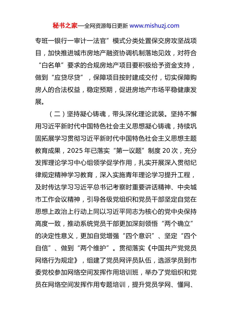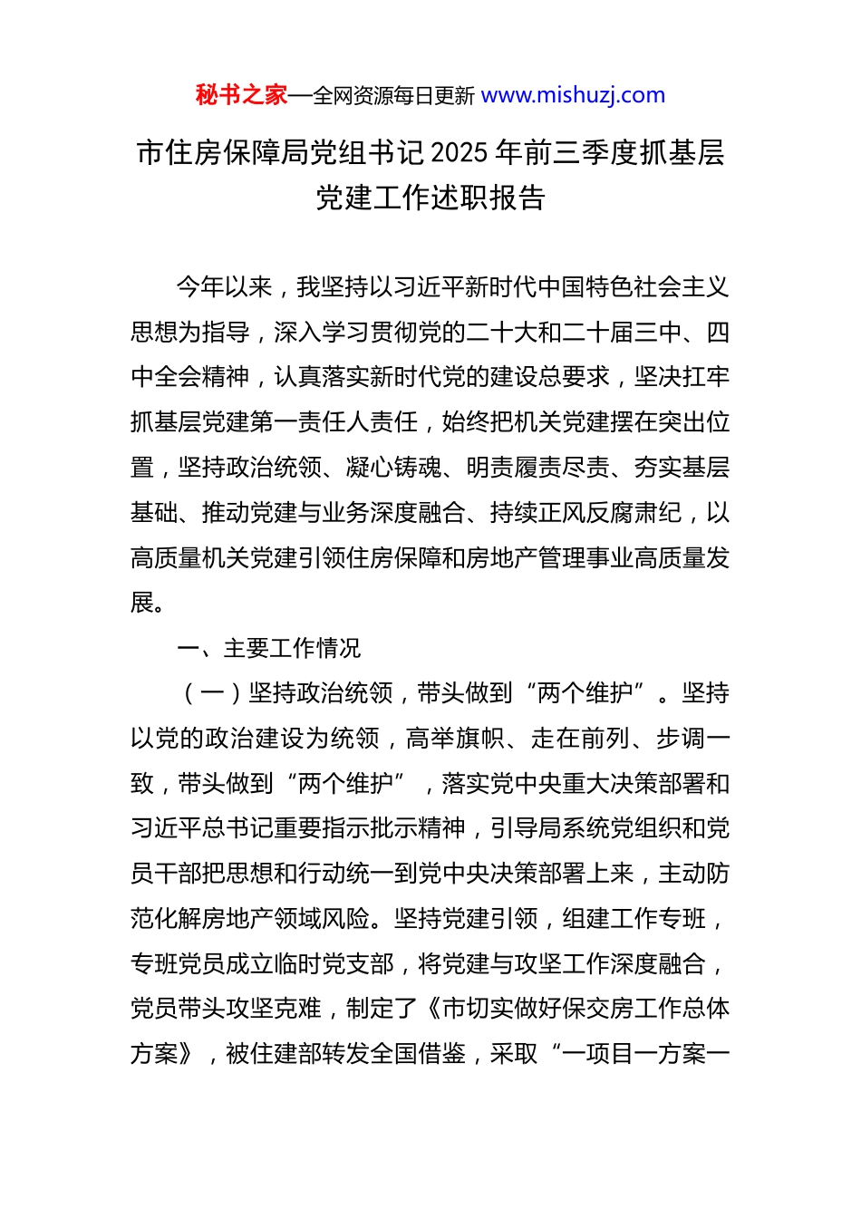 秘书之家—全网资源每日更新 www.mishuzj.com市住房保障局党组书记 2025 年前三季度抓基层党建工作述职报告 今年以来,我坚持以习近平新时代中国特色社会主义思想为指导,深入学习贯彻党的二十大和二十届三中、四中全会精神,认真落实新时代党的建设总要求,坚决扛牢抓基层党建第一责任人责任,始终把机关党建摆在突出位置,坚持政治统领、凝心铸魂、明责履责尽责、夯实基层基础、推动党建与业务深度融合、持续正风反腐肃纪,以高质量机关党建引领住房保障和房地产管理事业高质量发展。一、主要工作情况(一)坚持政治统领,带头做到“两个维护”。坚持以党的政治建设为统领,高举旗帜、走在前列、步调一致,带头做到“两个维护”,落实党中央重大决策部署和习近平总书记重要指示批示精神,引导局系统党组织和党员干部把思想和行动统一到党中央决策部署上来,主动防范化解房地产领域风险。坚持党建引领,组建工作专班,专班党员成立临时党支部,将党建与攻坚工作深度融合,党员带头攻坚克难,制定了《市切实做好保交房工作总体方案》,被住建部转发全国借鉴,采取“一项目一方案一秘书之家—全网资源每日更新 www.mishuzj.com专班一银行一审计一法官”模式分类处置保交房攻坚战项目,加快推进城市房地产融资协调机制落地见效,对符合“白名单”要求的合规房地产项目要积极给予资金支持,做到“应贷尽贷”,保障项目按时建成交付,切实保障购房人的合法权益,稳定预期,促进房地产市场平稳健康发展。(二)坚持凝心铸魂,带头深化理论武装。坚持不懈用习近平新时代中国特色社会主义思想凝心铸魂,持续巩固拓展学习贯彻习近平新时代中国特色社会主义思想主题教育成果,2025 年已落实“第一议题”制度 20 次,充分发挥理论学习中心组领学促学作用,扎实开展深入贯彻纪律规定精神学习教育,深入实施青年理论学习提升工程,及时传达学习习近平总书记考察时重要讲话精神、中央城市工作会议精神,引导各级党组织和党员干部坚定自觉在思想上政治上行动上同以习近平同志为核心的党中央保持高度一致,推动系统党员干部更加深刻领悟“两个确立”的决定性意义,更加自觉增强“四个意识”、坚定“四个自信”、做到“两个维护”。贯彻落实《中国共产党党员网络行为规定》,组建了党员网评员队伍,选派学员到市委党校参加网络空间发挥作用培训班,举办了党组织和党员在网络空间发挥作用专题培训,提升党员学网、懂网、秘书之家—全网资源每日更新 www.mishuzj.com用网能力,了解群众所思所愿,收集好想法好建议,积极回应网民关切,正面宣传房地产市场,为促进房地产市场平稳健康发展提供了良好舆论环境。(三)坚持常抓常管,带头履行主体责任。为推动各责任主体明责履责尽责,构建层层扛起责任、层层压实责任、压力层层传导、责任环环相扣的党建工作格局,我牢固树立机关党建第一责任人意识、落实第一责任人职责,亲自抓谋划、抓部署、抓推动、抓落实,把全的要求、严的基调、治的理念体现到责任落实全过程各环节,通过“书记抓、抓书记”,形成横向到边、纵向到底的责任体系。我组织班子成员和局属党组织负责同志专题学习了习近平总书记 7.29 重要指示精神,传达学习了《关于中央和国家机关部门党组(党委)落实机关党建主体责任的意见》《市市直单位党组(党委)落实机关党建主体责任实施办法》,研究制定了《2025 年机关党建主体责任清单》,明确了党组、党组书记、党组领导班子其他成员、机关党委和局属各级党组织机关党建主体责任清单以及机关纪委监督责任清单,年初精心谋划、全面部署,年中督导检查、推进落实,年末考核评议、总结问效,定期检视各级党组织全面从严治党主体责任落实情况,带头到基层联系点参与党建活动,督促班子成员定期检查分管范围内秘书之家—全网资源每日更新 www.mishuzj.com管党治党工作,履行“一岗双责”,分类指导基层组织,推动机关党建主体责任层层传导、落实落地。(四)坚持强基固本,带头夯实基层基础。围绕贯彻落实党中央决策部署特别是落实改革任务,聚焦提升基层党组织组织力,完善党员教育管理、作用发挥机制,增强基层党组织政治功能和...